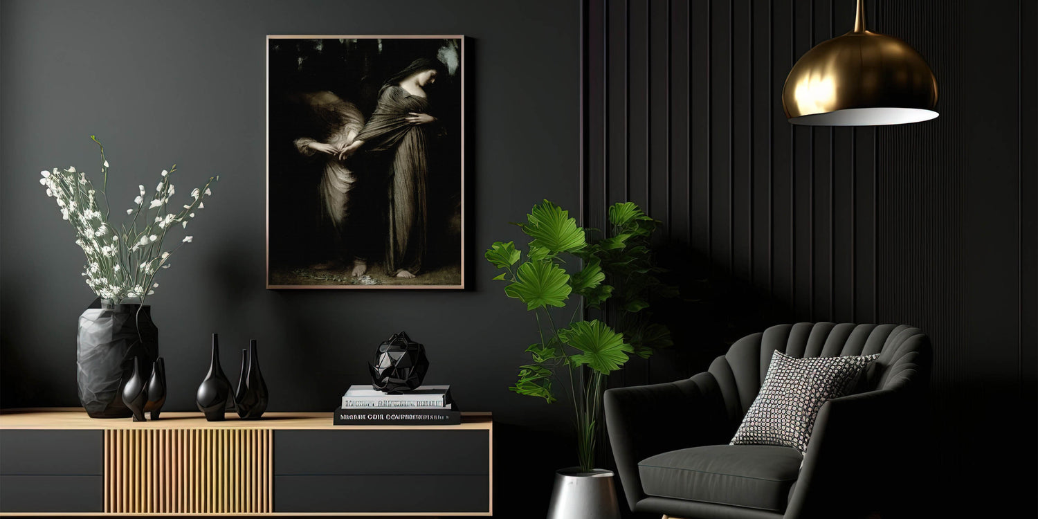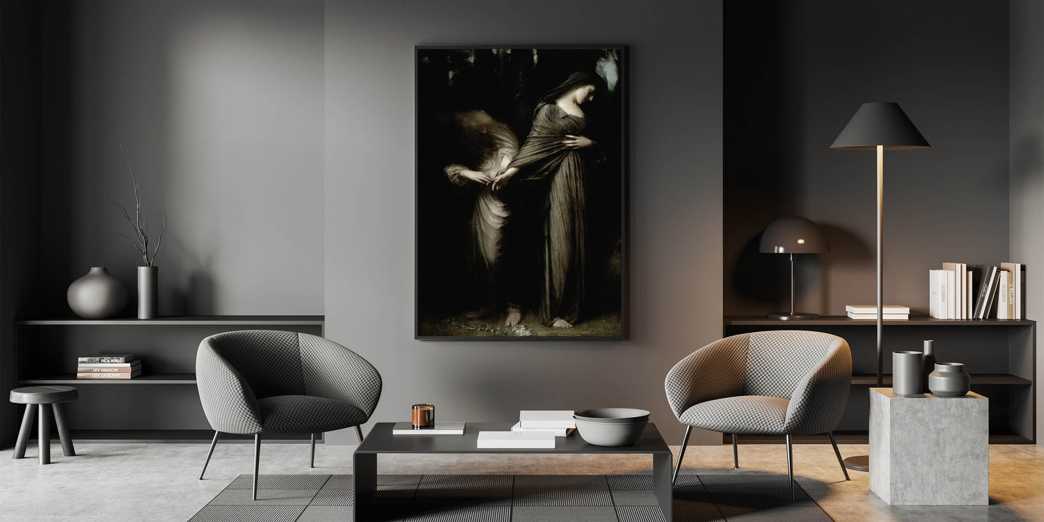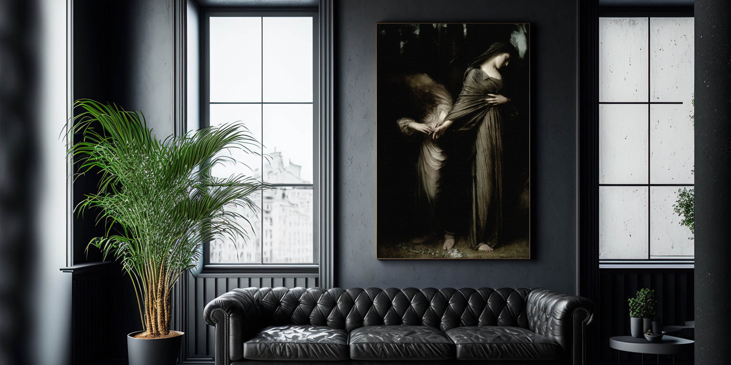 This ethereal Dark Academia wall art depicts two women entwined in shadows, their flowing garments and graceful poses evoking a sense of mystery and gothic allure. The dark background contrasts with the soft, ghostly figures, creating an intense yet delicate atmosphere that perfectly captures the essence of Dark Academia decor. The minimal use of color enhances the moody aesthetic, making this artwork ideal for those seeking a captivating, atmospheric piece for their home.