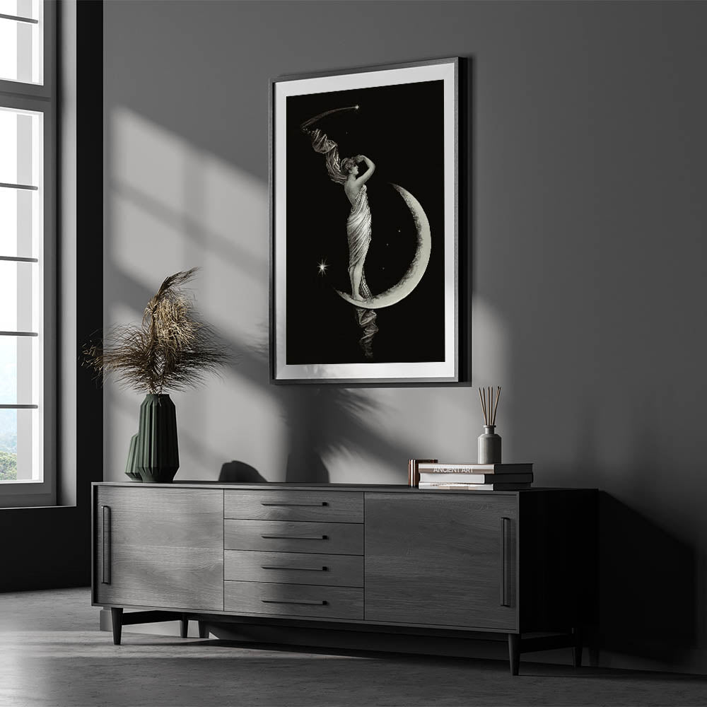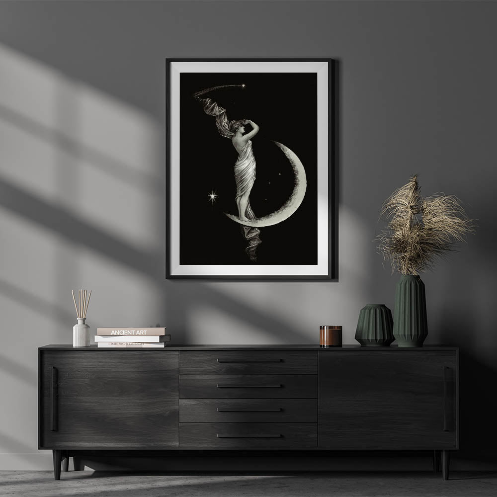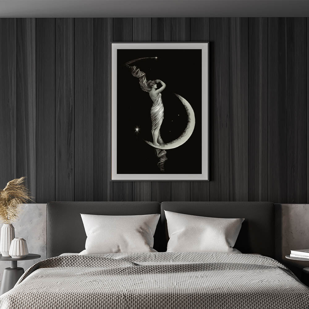 Immerse yourself in the mystical charm of the Dark Academia aesthetic with this stunning wall art featuring a celestial goddess, gracefully posed on a crescent moon. Perfect for adding an ethereal, vintage touch to your home, this artwork embodies the blend of shadowy elegance and classic academic style that defines the Dark Academia movement. The intricate design captures the beauty of classic literature and the moody atmosphere of gothic art decor.