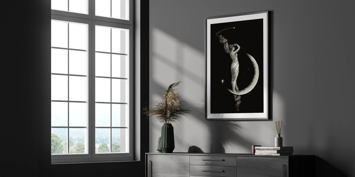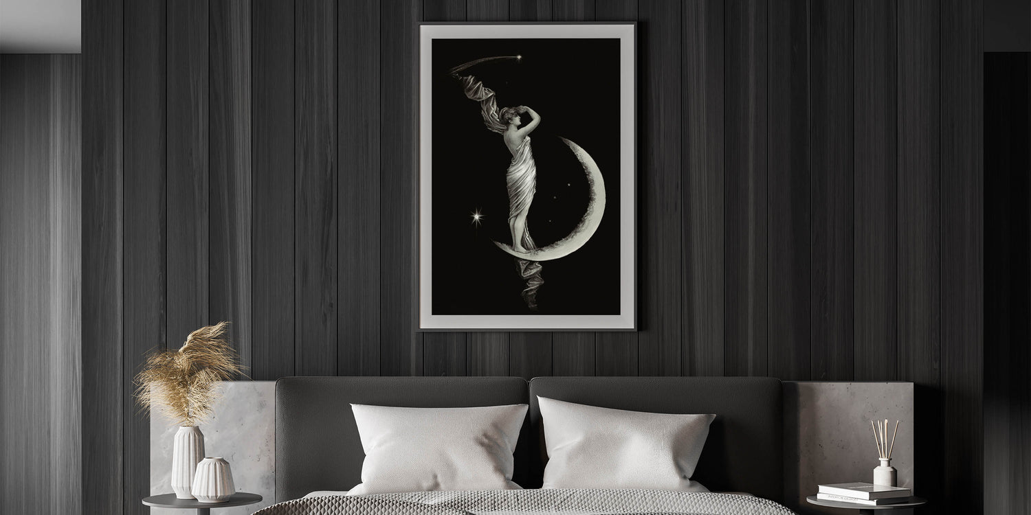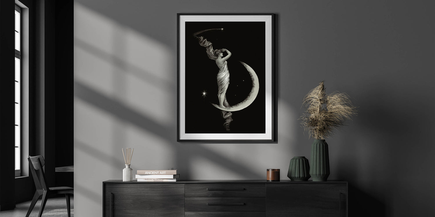 Immerse yourself in the mystical charm of the Dark Academia aesthetic with this stunning wall art featuring a celestial goddess, gracefully posed on a crescent moon. Perfect for adding an ethereal, vintage touch to your home, this artwork embodies the blend of shadowy elegance and classic academic style that defines the Dark Academia movement. The intricate design captures the beauty of classic literature and the moody atmosphere of gothic art decor.