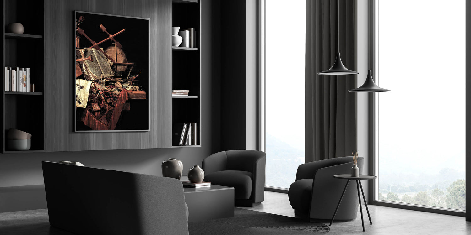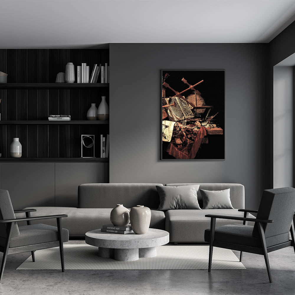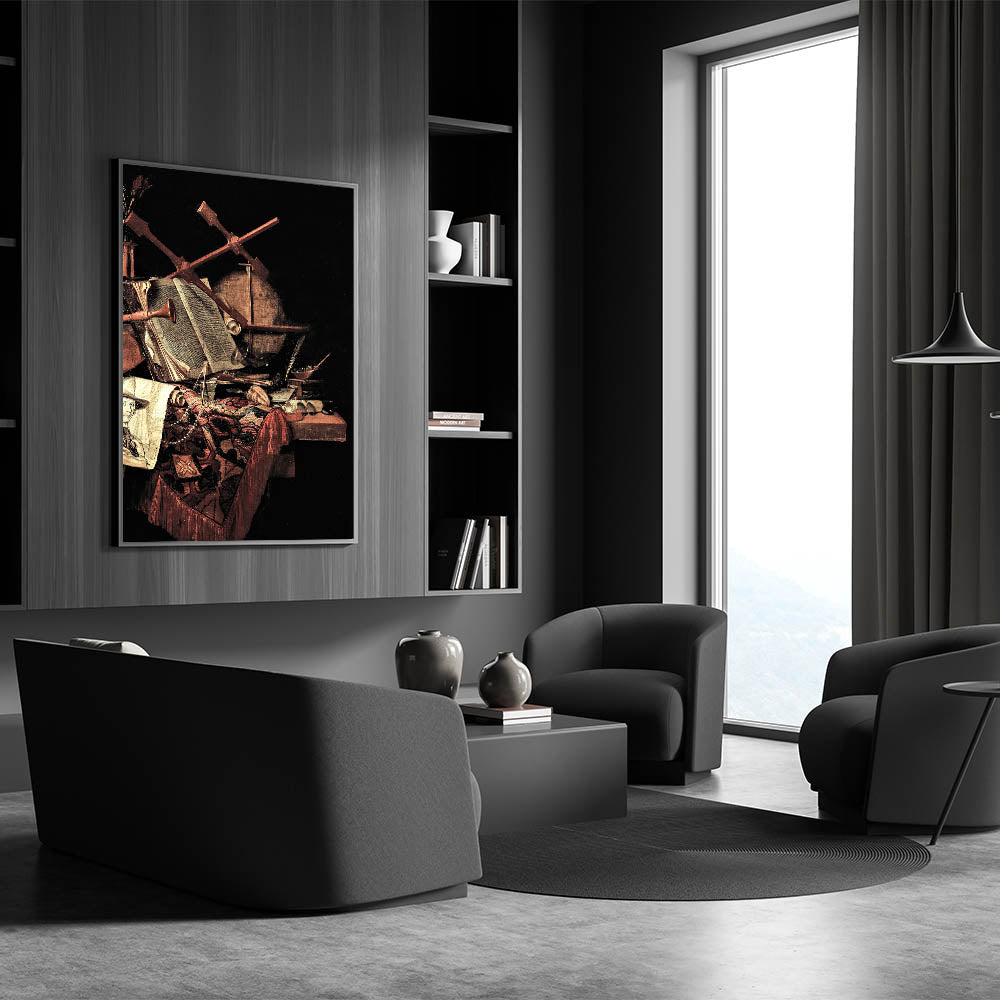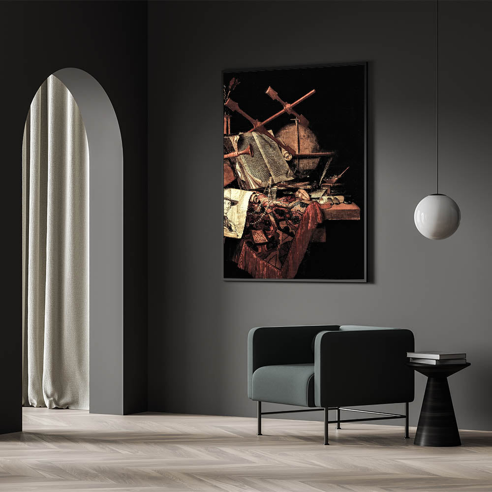 This mesmerizing Dark Academia wall art captures the essence of vintage Gothic decor with a still life scene filled with various instruments, open books, and historical artifacts. The intricate details and shadowy tones invite a sense of mystery and scholarly reflection, making this piece perfect for those who love academic style art and moody aesthetic decor. This artwork, rich in symbolism and history, fits seamlessly into any Dark Academia-themed space, offering a glimpse into a world of intellectual pursuits and hidden meanings.