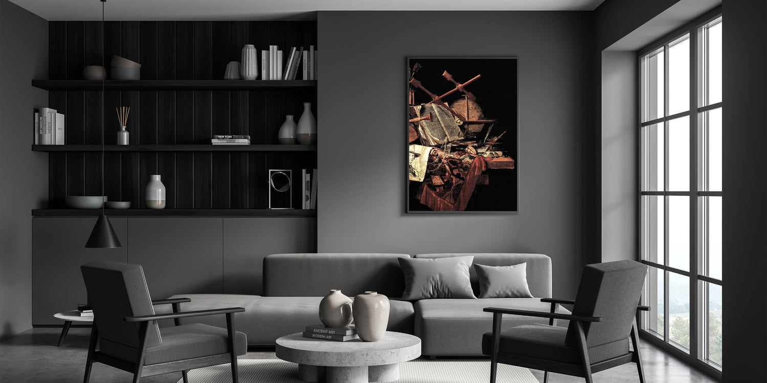 Immerse yourself in this atmospheric still life, an ideal addition for lovers of Gothic art decor and moody, introspective environments.