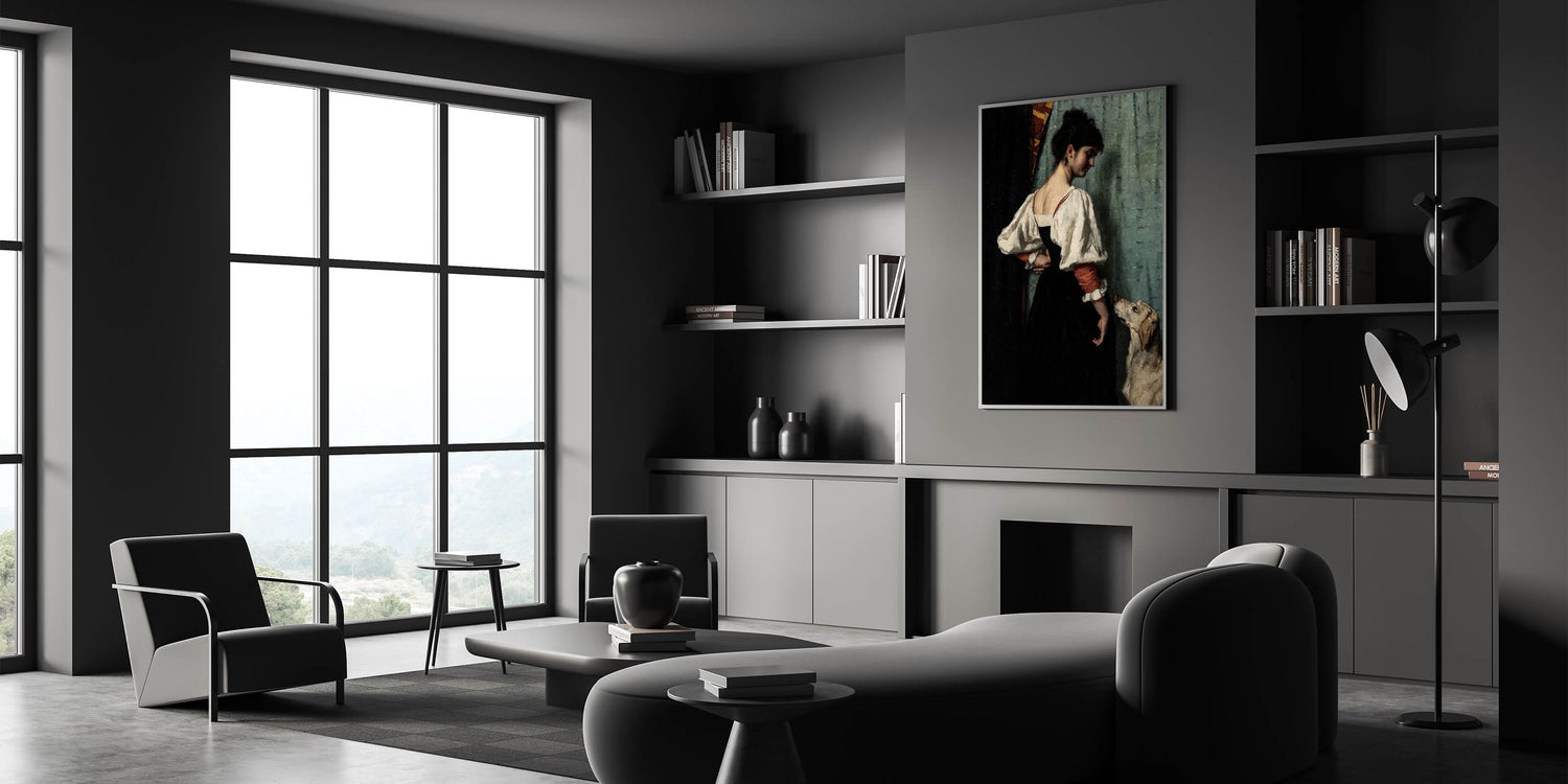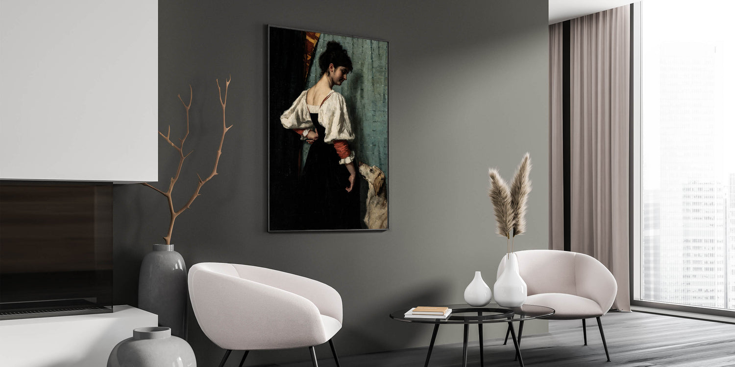 Dark Academia Wall Art - Vintage Gothic Woman and Dog in Thoughtful Pose
