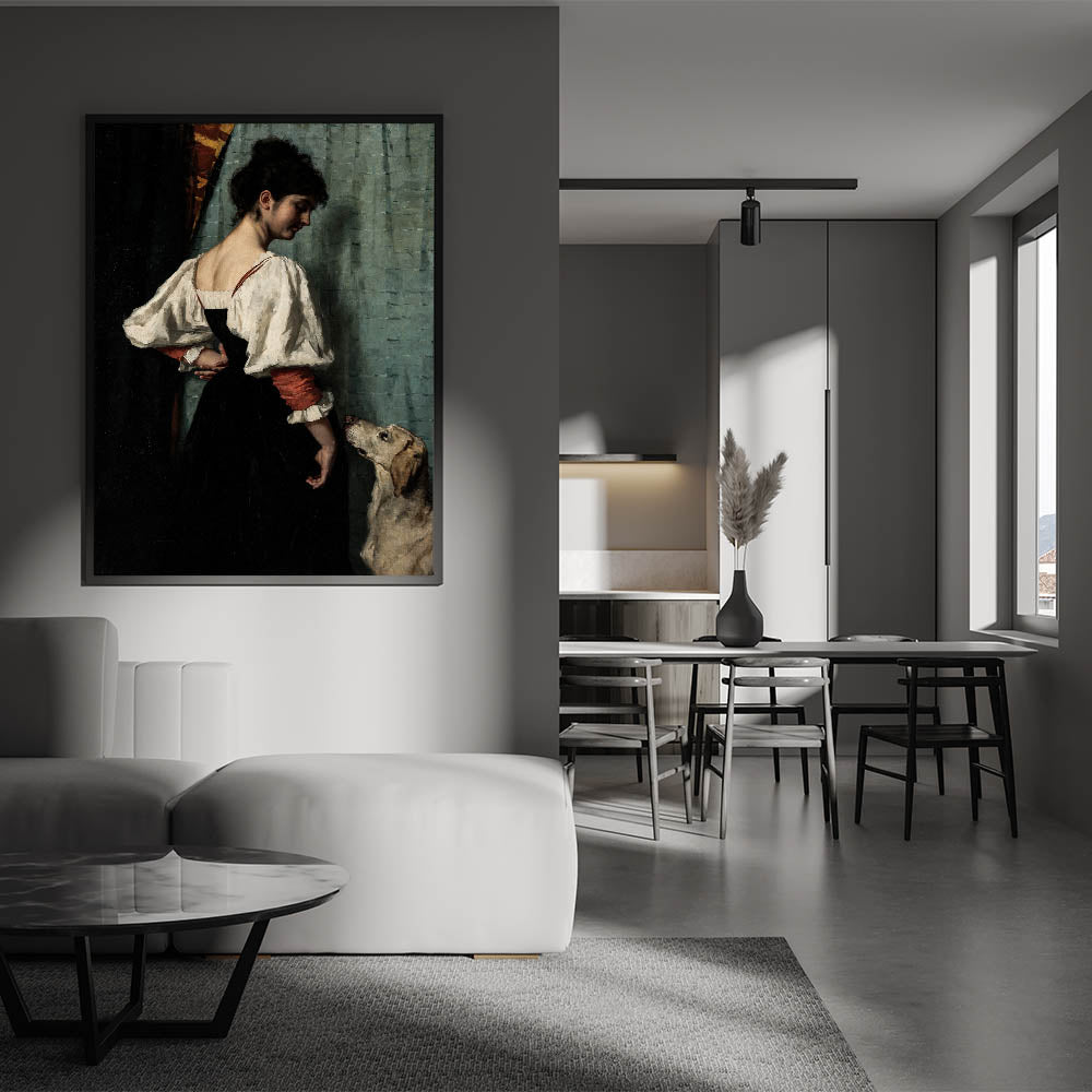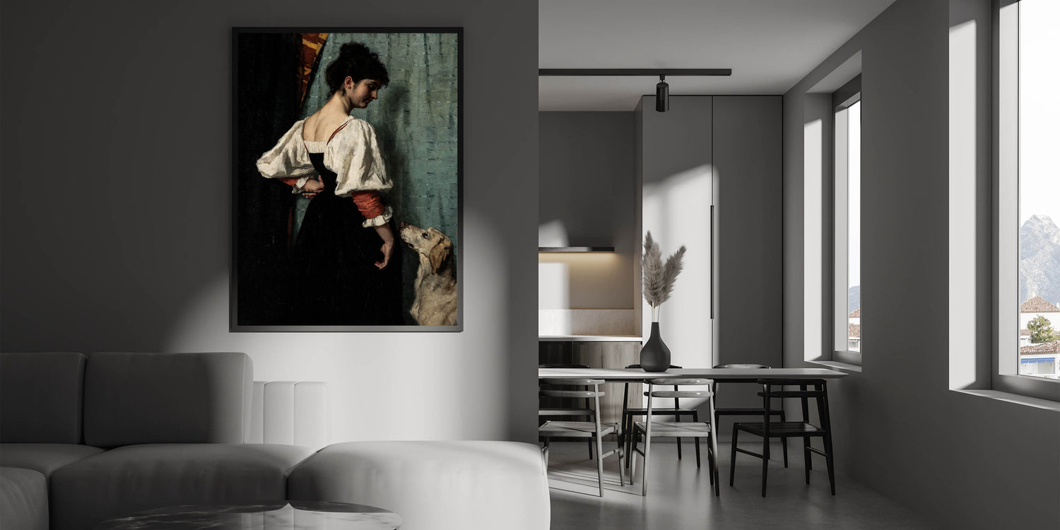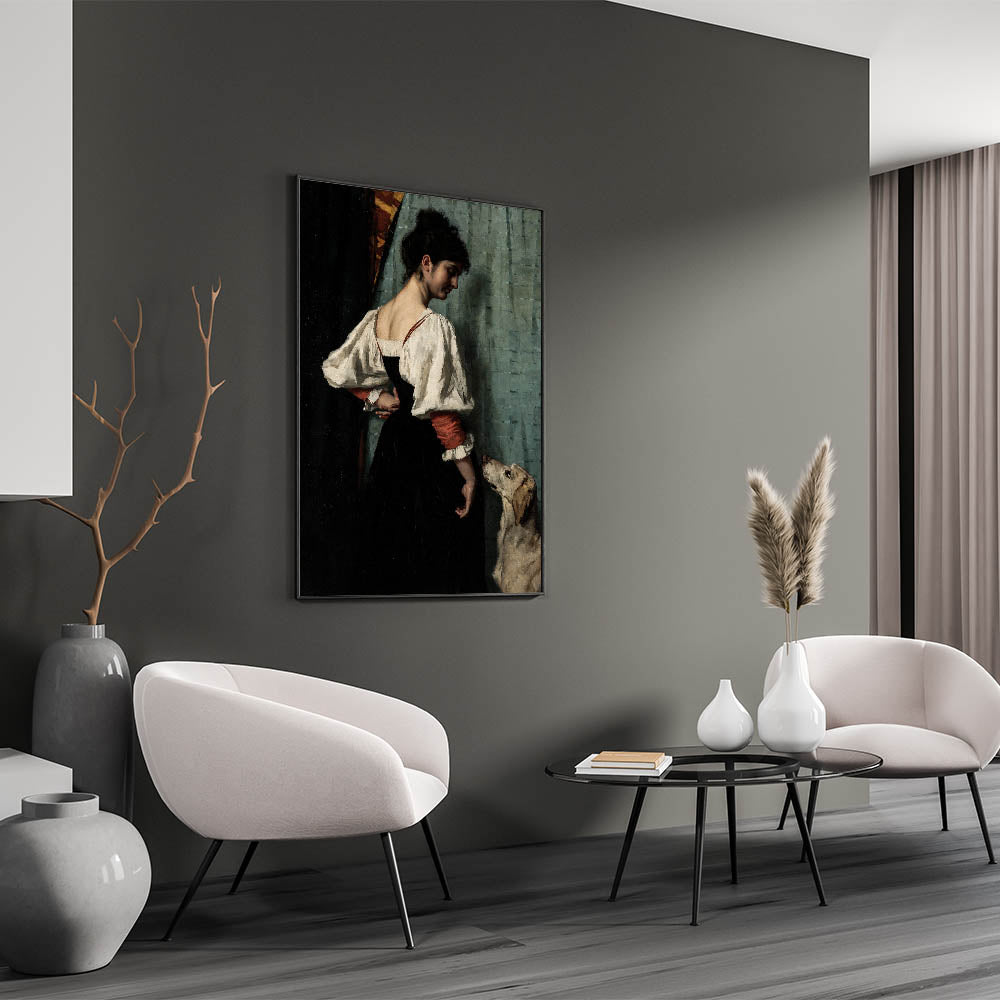 - Timeless Beauty: The subtle contrast of the woman's soft expression and the attentive gaze of the dog creates a captivating scene, perfect for adding a touch of Gothic art decor to living rooms or studies.