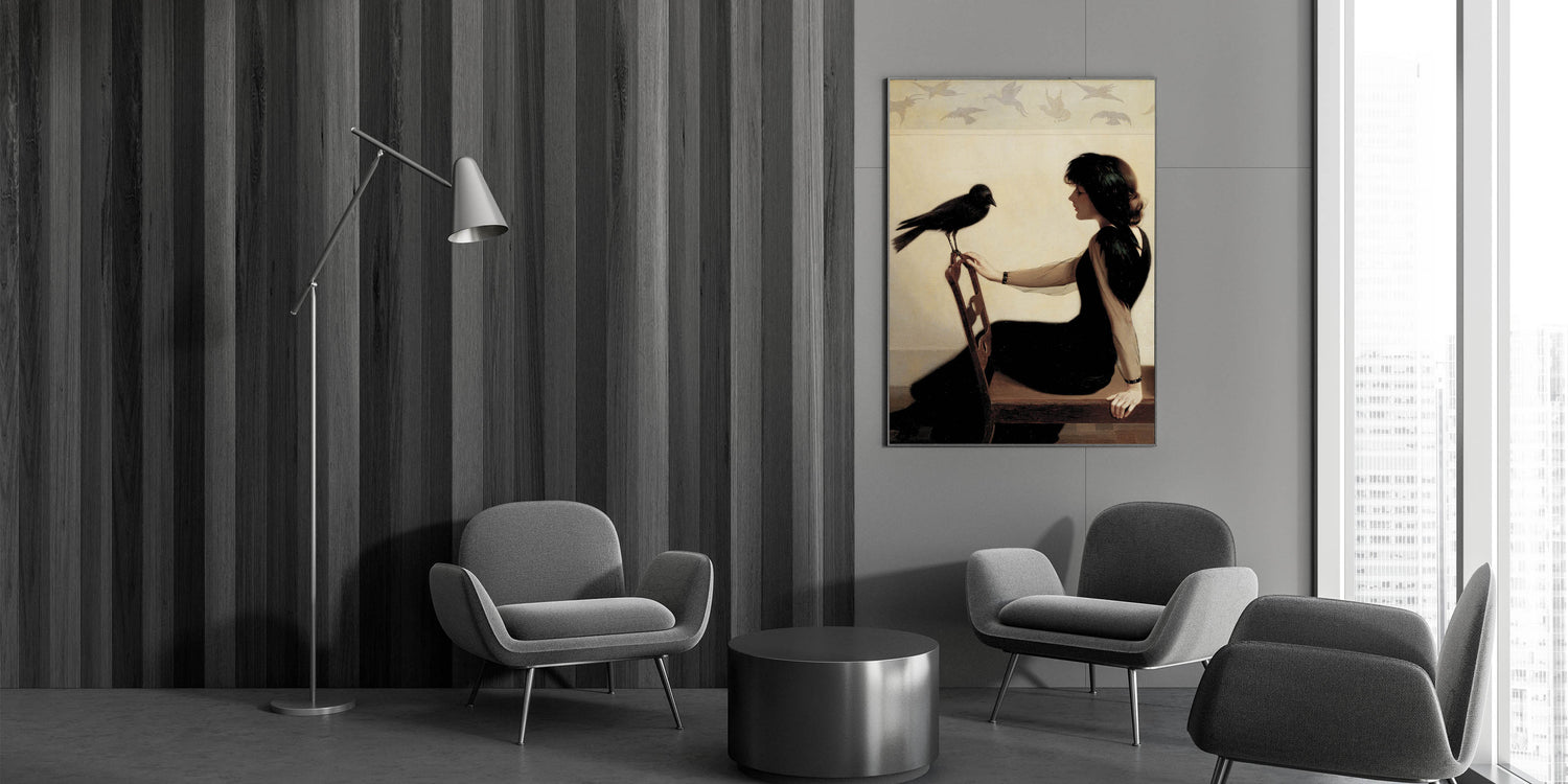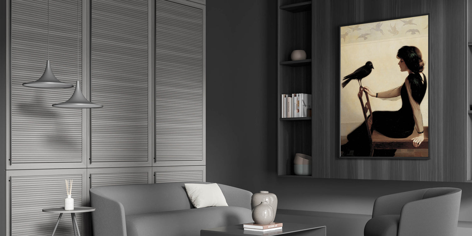This captivating Dark Academia wall art portrays a woman seated quietly with a raven perched on a chair, creating an atmosphere filled with mystery and contemplation. The delicate contrast between the woman’s pale skin and the raven’s dark feathers highlights the gothic aesthetic, while the background of faint bird silhouettes adds depth and subtlety. The composition evokes a sense of quiet, intellectual reflection, making this piece ideal for gothic art lovers seeking vintage charm and moody room decorations.