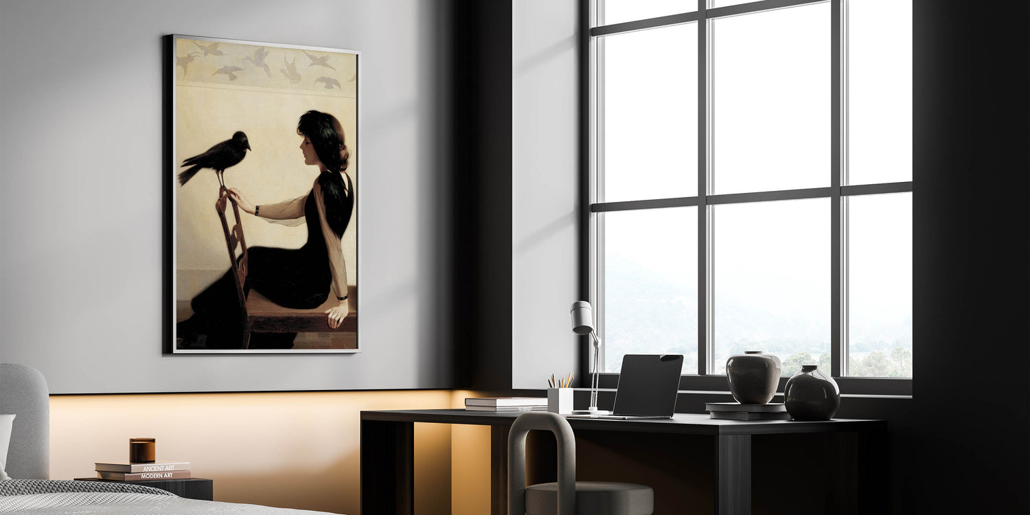Dark Academia Wall Art: Woman with Raven in Silence, Gothic Print