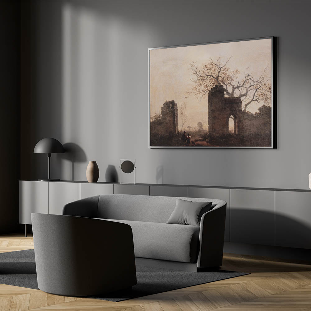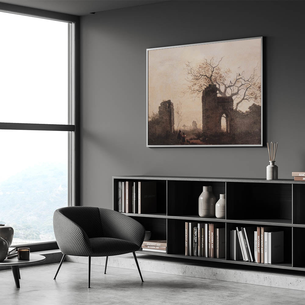 Capture the essence of a bygone era with this Dark Moody wall art featuring an evocative scene of ancient ruins and a bare, twisting tree. The artwork portrays a subtle, melancholic atmosphere with figures walking through the ruins, giving a sense of mystery and history. Ideal for those seeking moody wall art for their living room or study, this piece blends timeless architecture with the beauty of nature, enveloped in soft, muted tones.