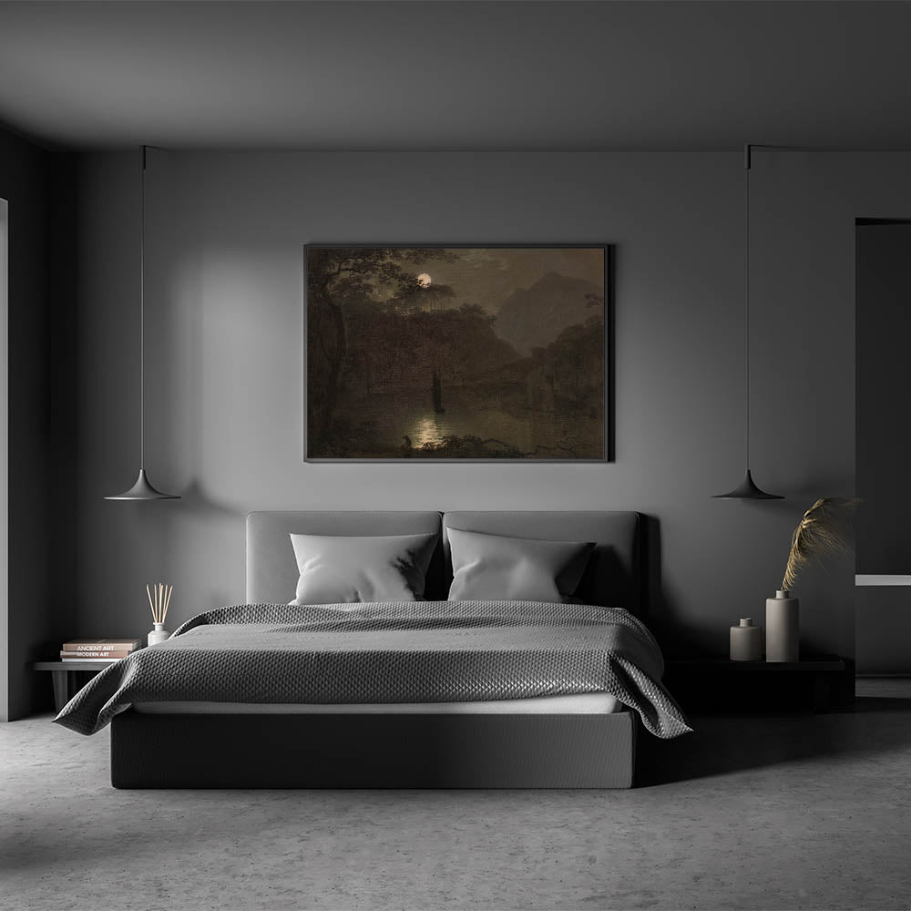 Transform your living space with this captivating Dark Moody wall art, featuring a moonlit landscape enveloped in shadows and mystery. The artwork’s dramatic composition captures the essence of a tranquil night scene, where the moon’s soft glow illuminates the still waters and dense foliage, creating an atmosphere of intrigue and serenity. Perfect for those seeking moody wall art for the living room or any other space that calls for a touch of atmospheric elegance.