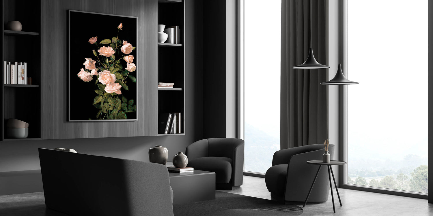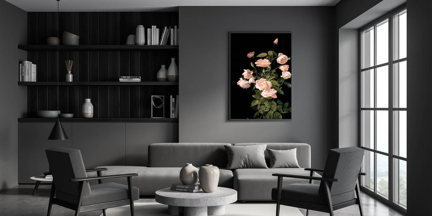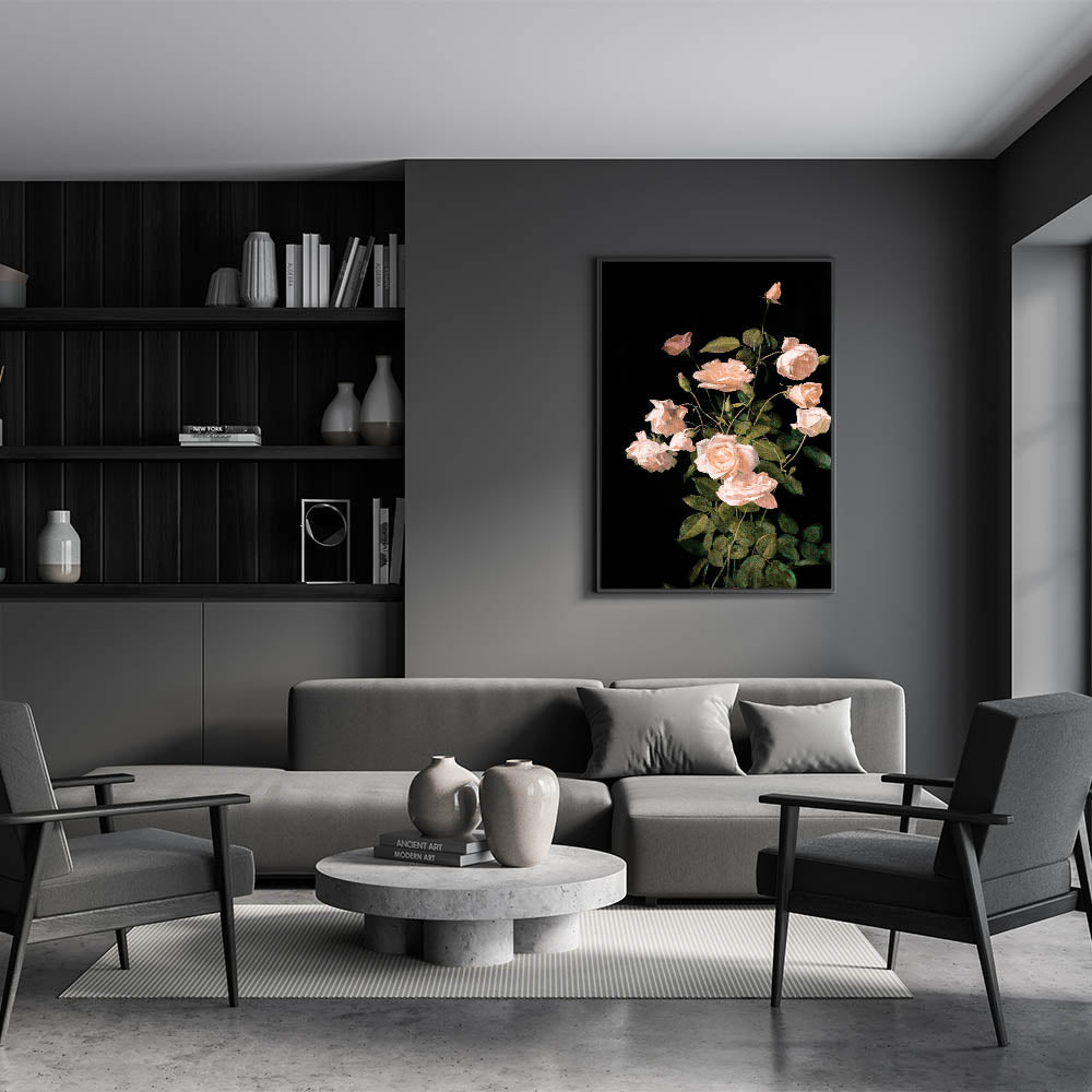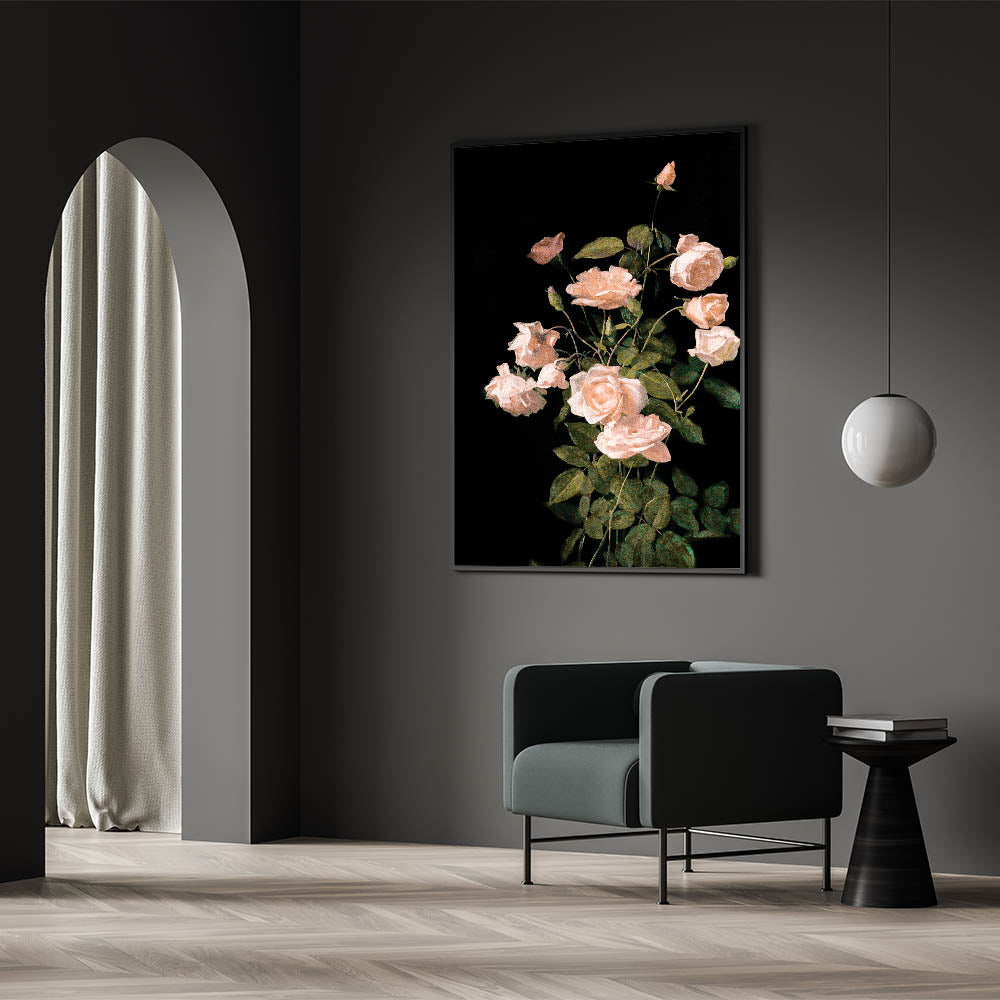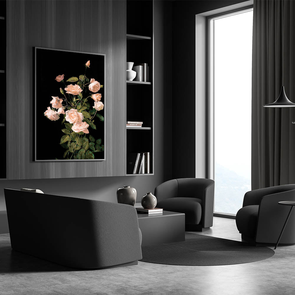 Enhance your living space with this Dark Moody wall art, showcasing a stunning arrangement of soft pink roses set against a deep black background. The delicate petals and lush green leaves are meticulously rendered, highlighting the timeless beauty of these flowers. This piece is perfect for those seeking a refined, elegant touch for their living room, bedroom, or study, adding a sense of serenity and sophistication to any space.