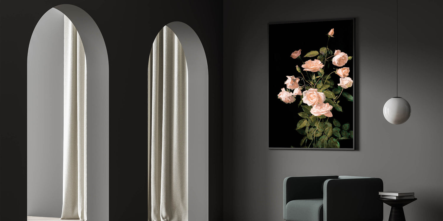 Dark Moody Wall Art - Soft Pink Roses for Elegant Floral Home Decor