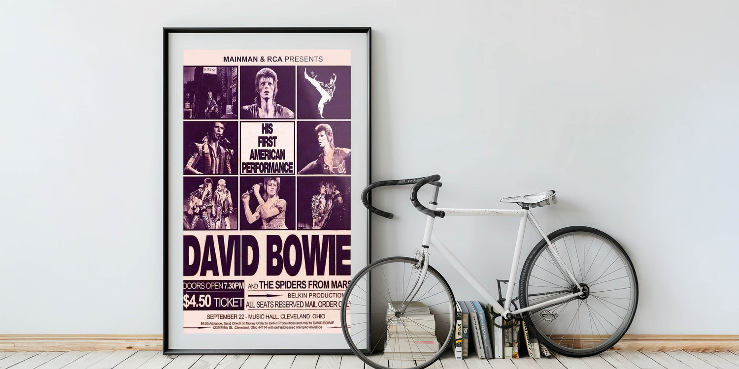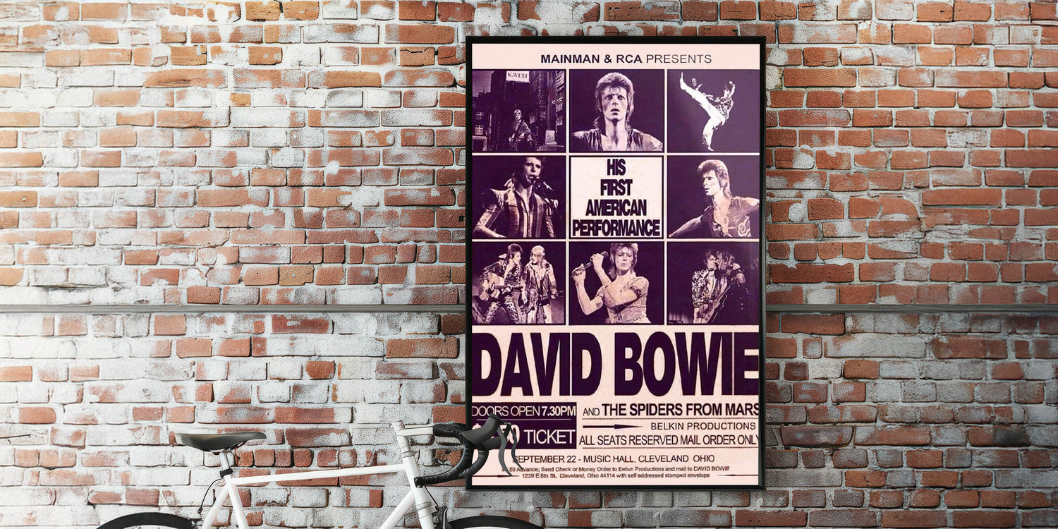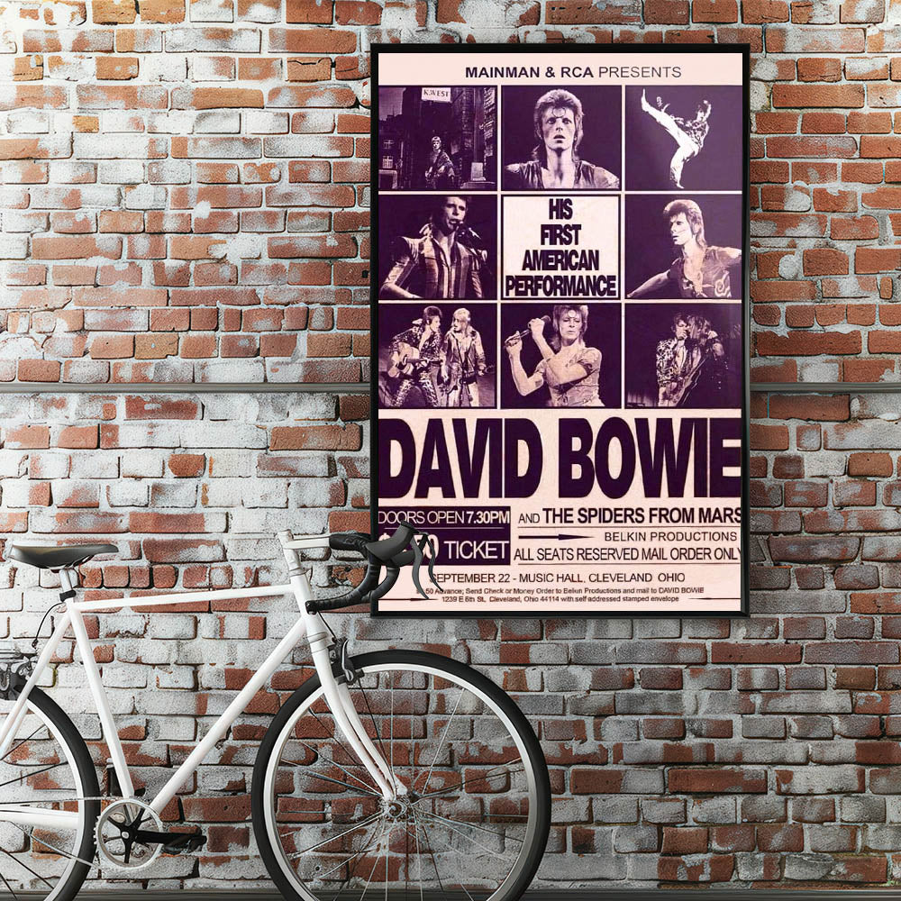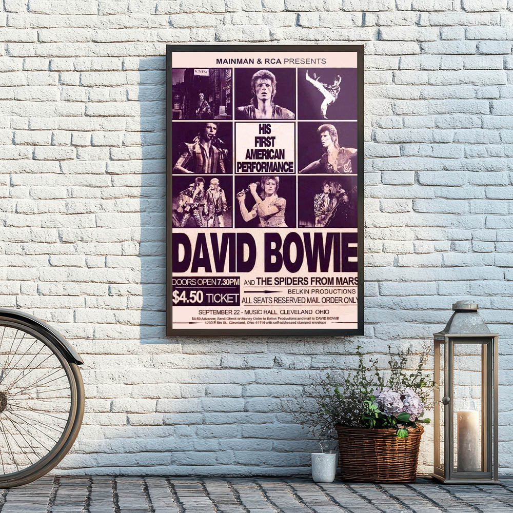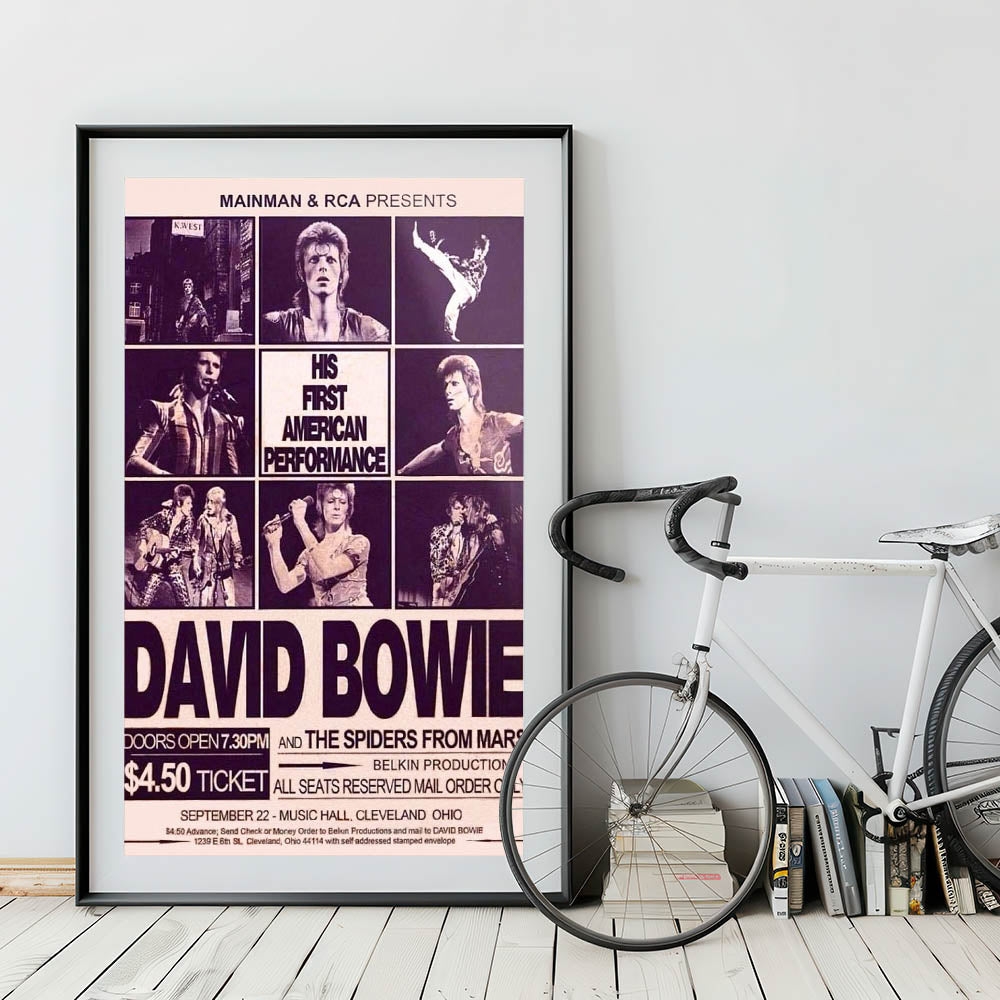 Celebrate David Bowie's legendary first American performance with this stunning Retro Poster Art. Featuring iconic images of Bowie from his early career, this vintage print captures the raw energy of his first U.S. tour with The Spiders from Mars. The combination of classic black-and-white images and bold typography makes this piece a standout addition to any collection. A perfect piece for fans of nostalgic art prints and those looking for vintage decor that celebrates one of the greatest rock icons of all time.