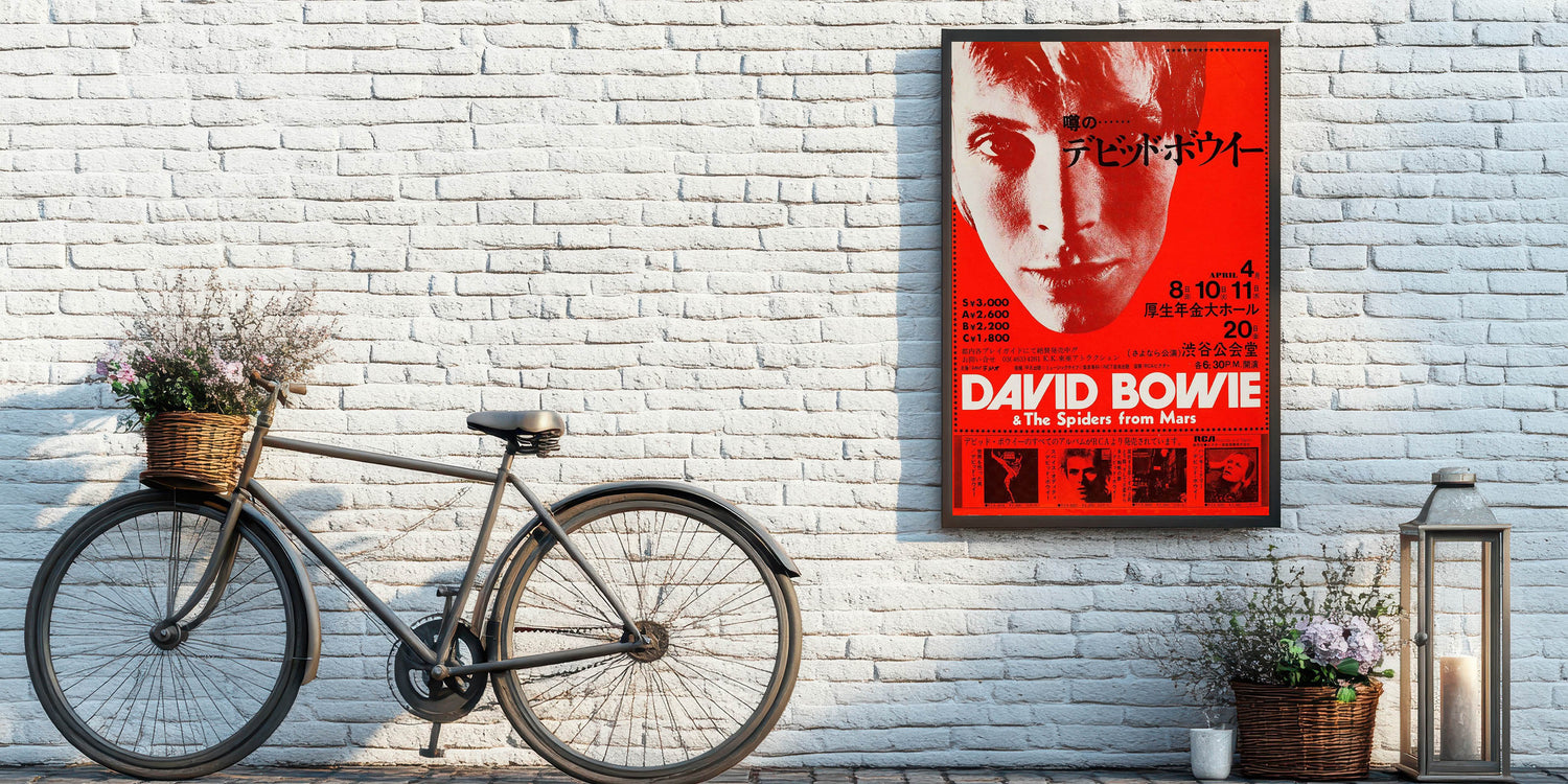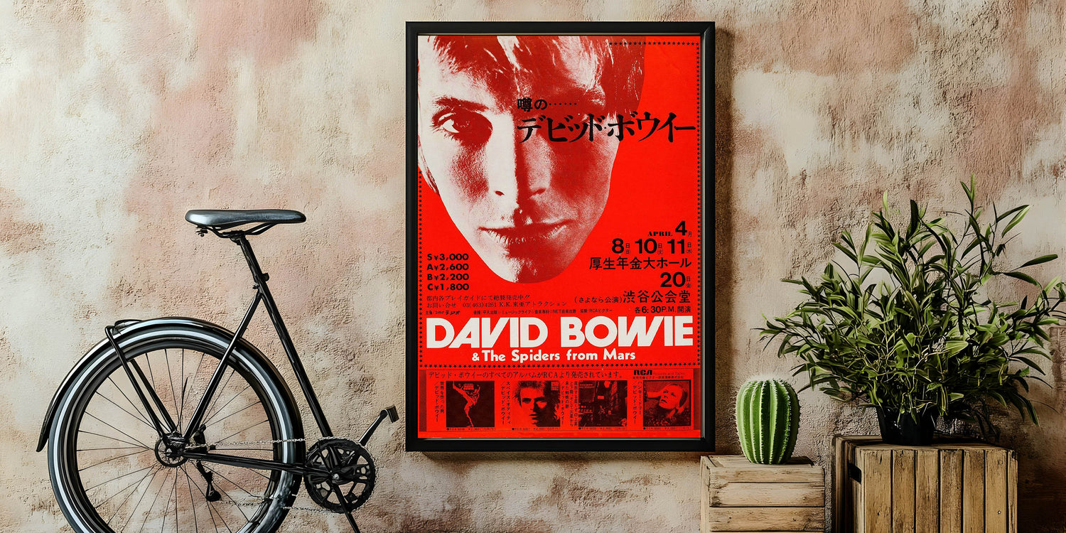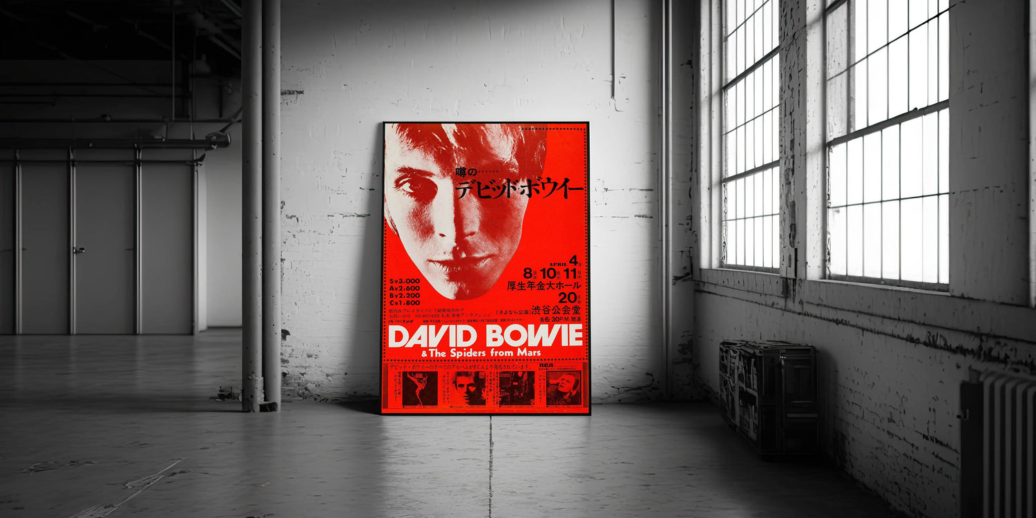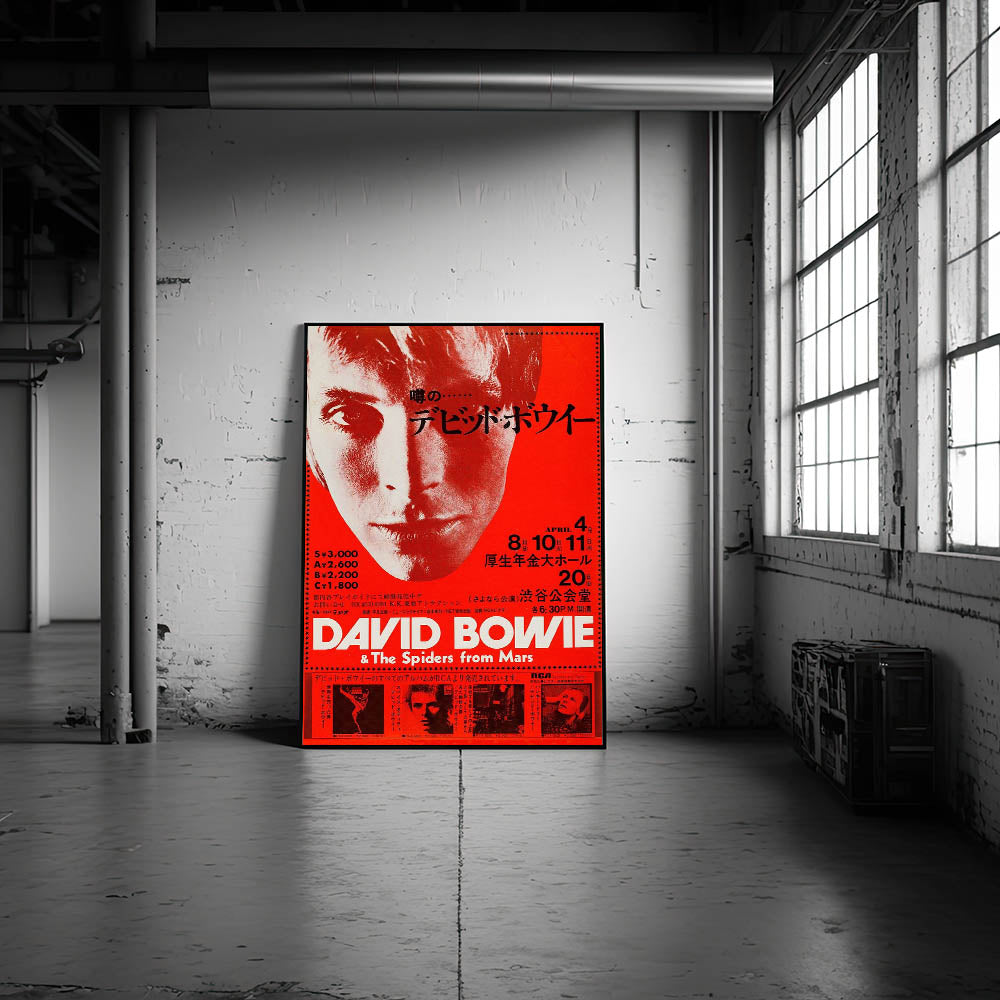 Step back into the 70s with this Retro Poster Art featuring David Bowie during his iconic Japan tour. The bold red and black color scheme, along with Bowie's intense gaze, captures the energy and mystique of one of rock's greatest stars. This vintage print showcases his early 70s look, perfect for fans of nostalgic art prints and those looking to celebrate Bowie’s trailblazing influence. Its retro design and dramatic typography evoke the electric atmosphere of Bowie’s performances with The Spiders from Mars.