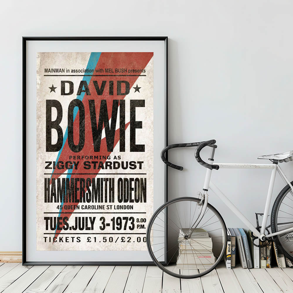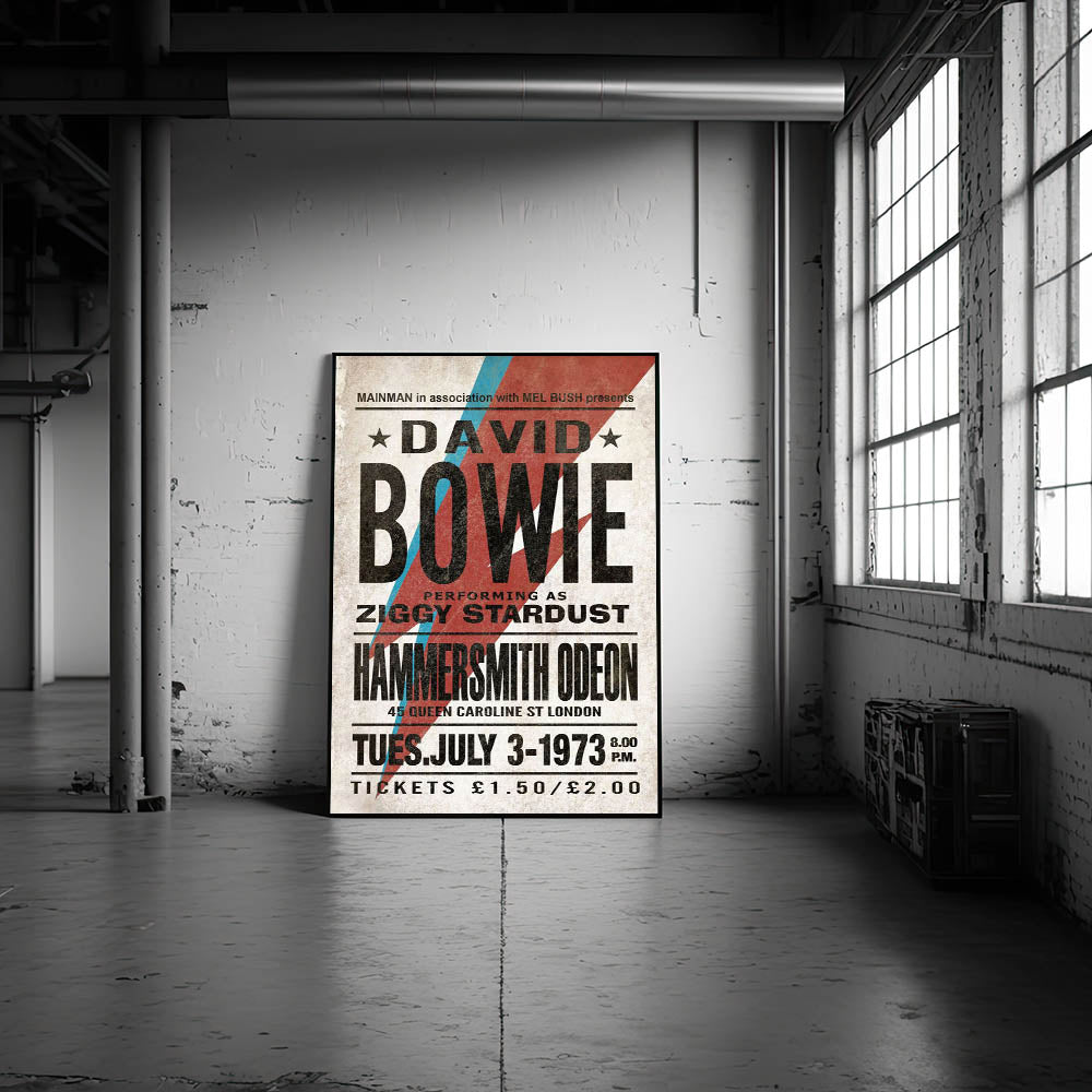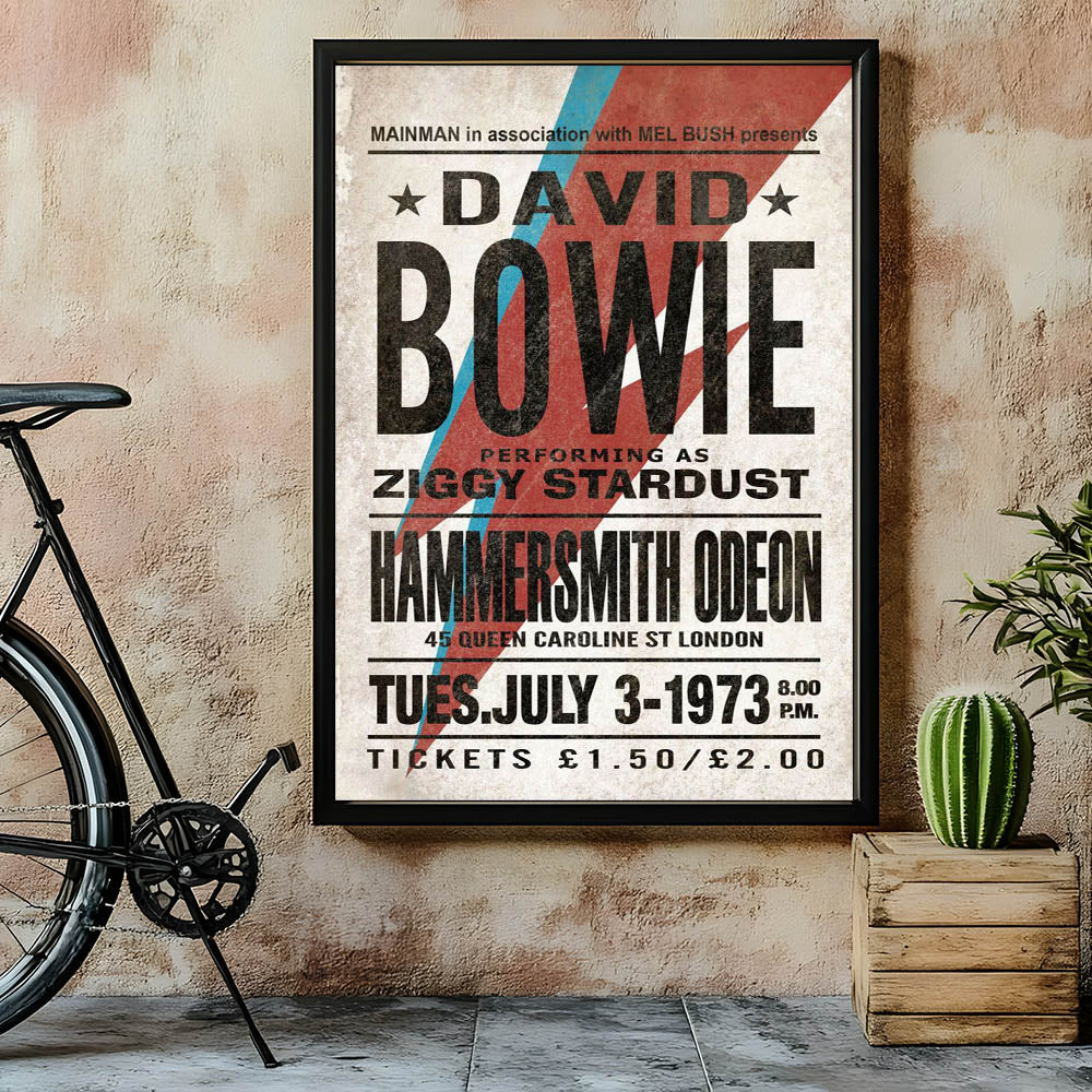 Relive the iconic 1973 performance with this Retro Poster Art featuring David Bowie as Ziggy Stardust. With the bold red and blue lightning bolt and vintage typography, this vintage print captures the essence of Bowie’s musical revolution. His performance at the Hammersmith Odeon is immortalized in this unique design, making it a must-have for fans of nostalgic art prints and retro aesthetic. This poster is an essential addition to any collection celebrating the classic retro style of the 70s and Bowie’s legacy.