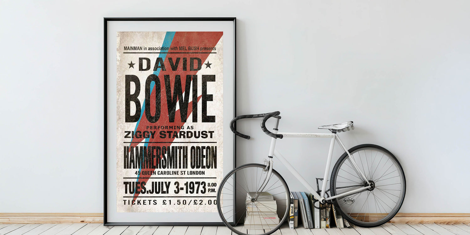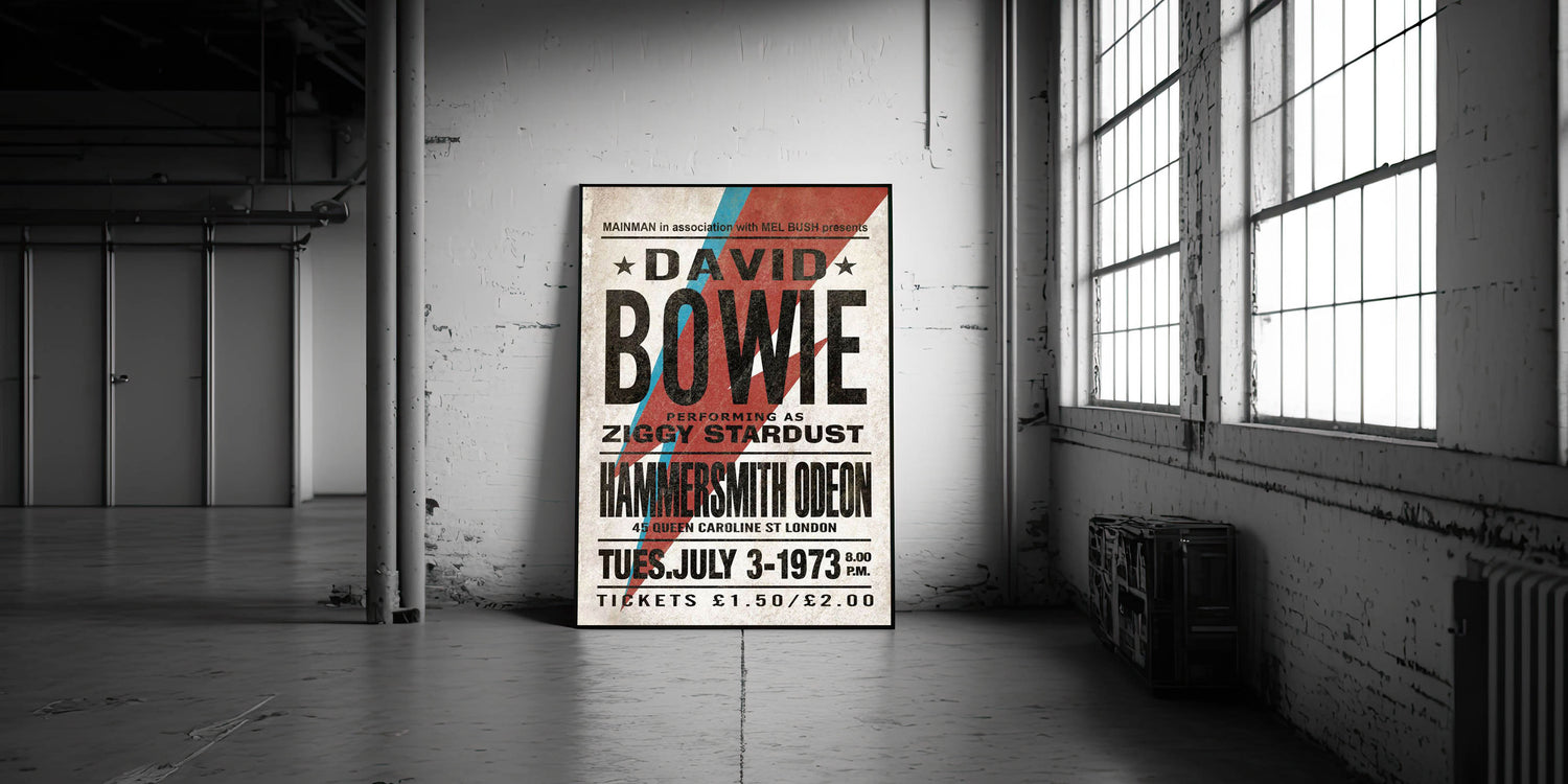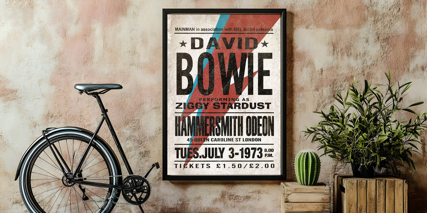 Relive the iconic 1973 performance with this Retro Poster Art featuring David Bowie as Ziggy Stardust. With the bold red and blue lightning bolt and vintage typography, this vintage print captures the essence of Bowie’s musical revolution. His performance at the Hammersmith Odeon is immortalized in this unique design, making it a must-have for fans of nostalgic art prints and retro aesthetic. This poster is an essential addition to any collection celebrating the classic retro style of the 70s and Bowie’s legacy.