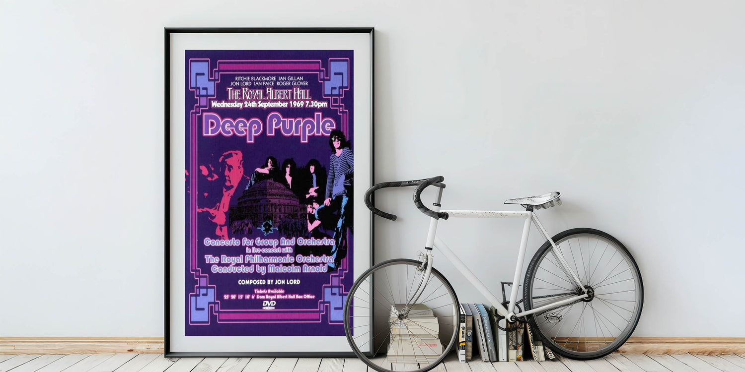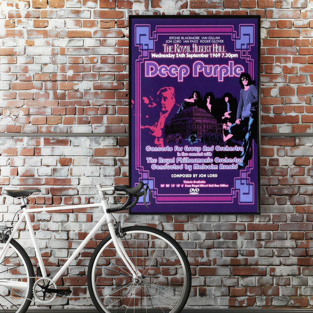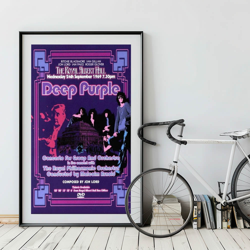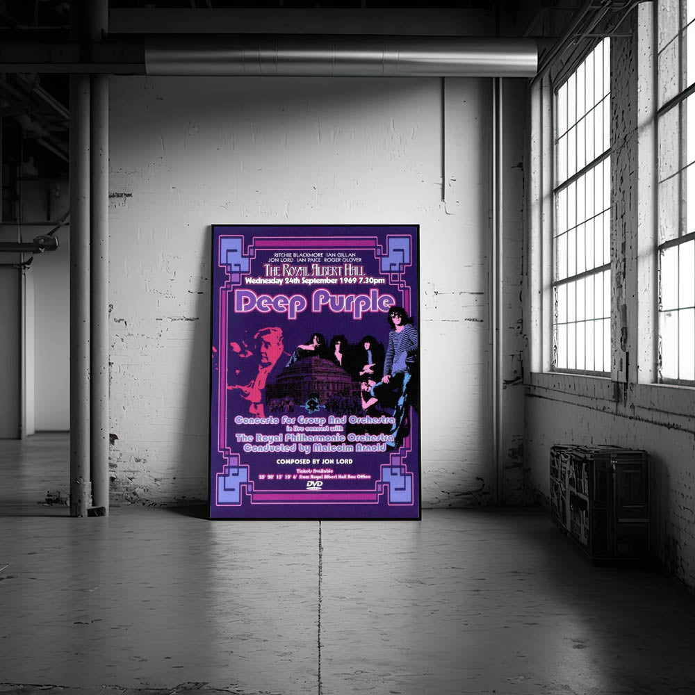 Experience the iconic 1969 performance of Deep Purple with this Retro Poster Art featuring their legendary concert at The Royal Albert Hall. This vintage print showcases a vibrant design with bold purple and pink tones, capturing the energy of the band and the grandeur of the performance. With its combination of the band members and the famous venue, this poster is perfect for fans of nostalgic art prints and classic retro style. A must-have for any music lover, this piece will bring a timeless rock and roll aesthetic to your space.