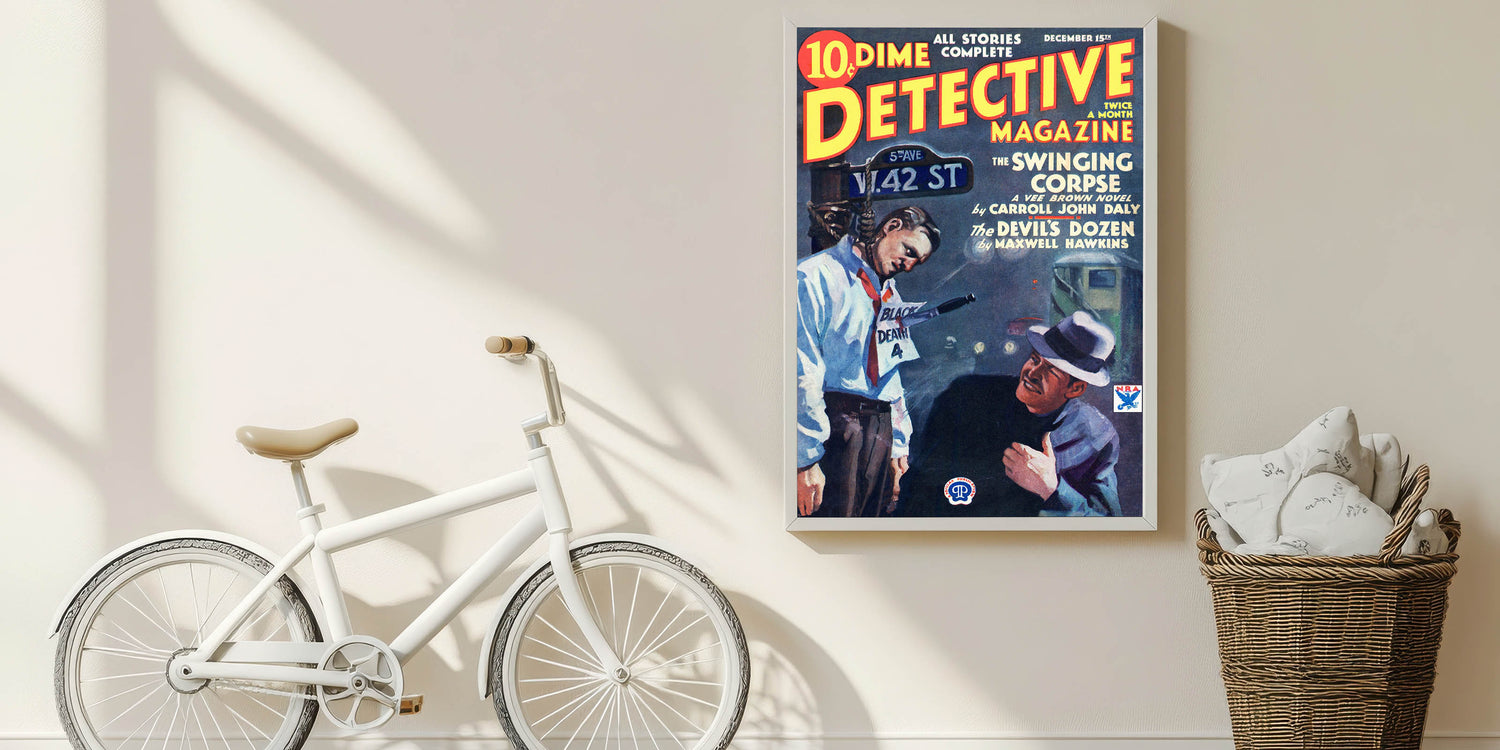 Add a touch of mystery and nostalgia to your home with this stunning Dime Detective Magazine cover art. This vintage print features a gripping crime scene from the classic detective genre, perfect for anyone who loves retro prints for home decor. The captivating illustration and dramatic story title make this collectible magazine cover a unique addition to any space. Whether you’re a fan of detective novels or vintage magazine art, this piece will transport you back to a time of thrilling mysteries and stylish magazine designs.