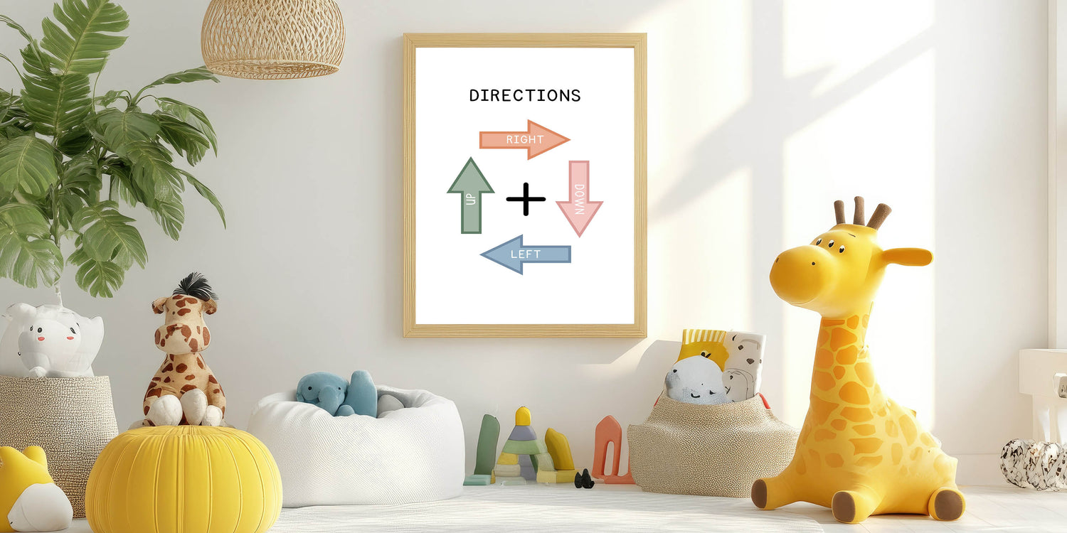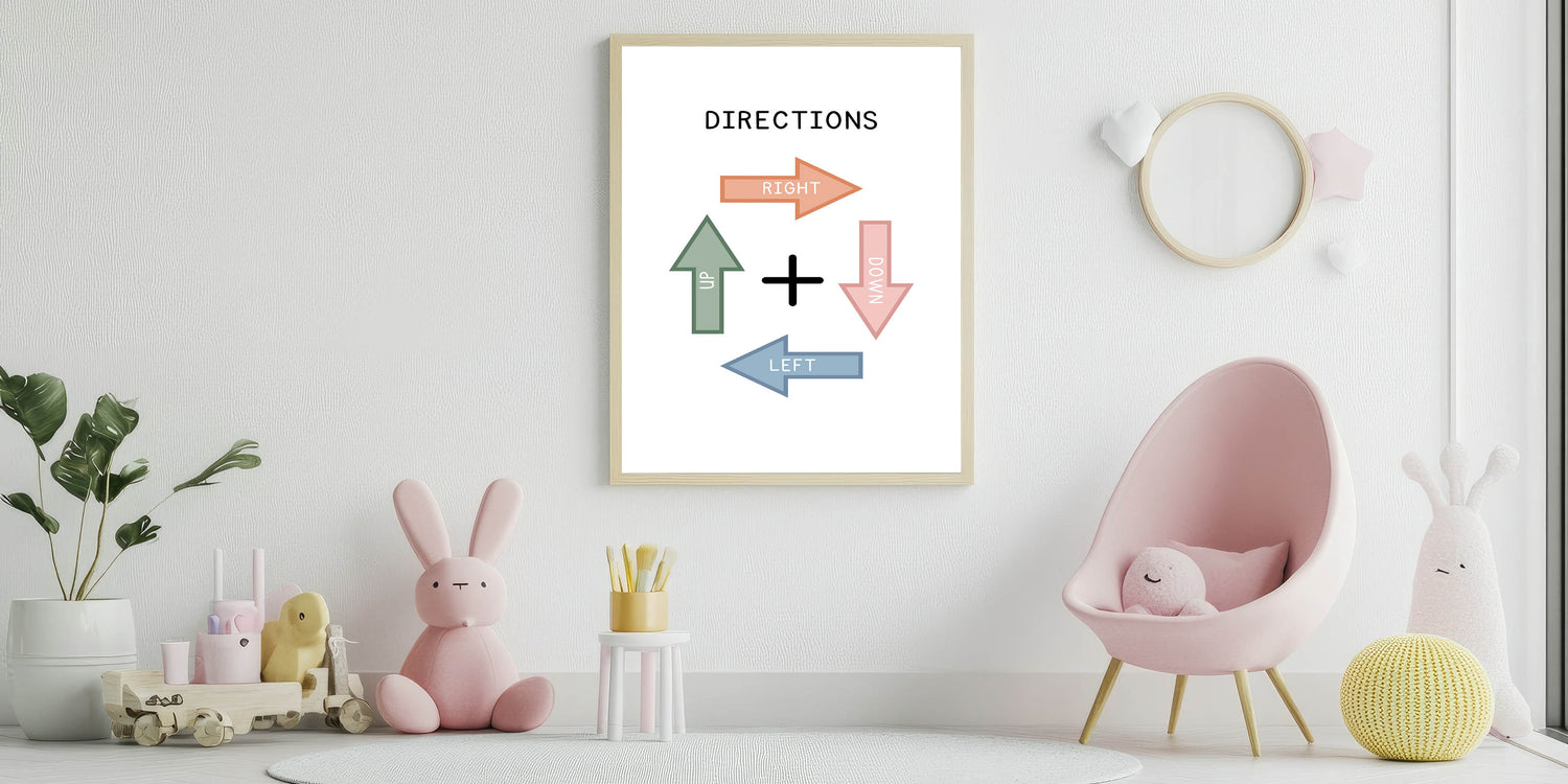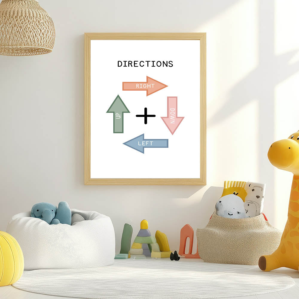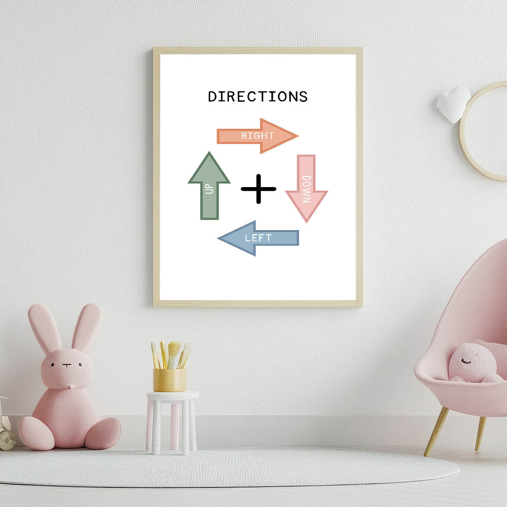 This Directions Typography Art Print brings a modern and educational touch to your home or office décor. Featuring clear and bold directional arrows for up, down, left, and right, this minimalist typography canvas is perfect for helping kids and adults alike learn about directions in a fun, engaging way. Whether it’s for a playroom, classroom, or any space in need of stylish yet educational art, this piece adds both charm and functionality.