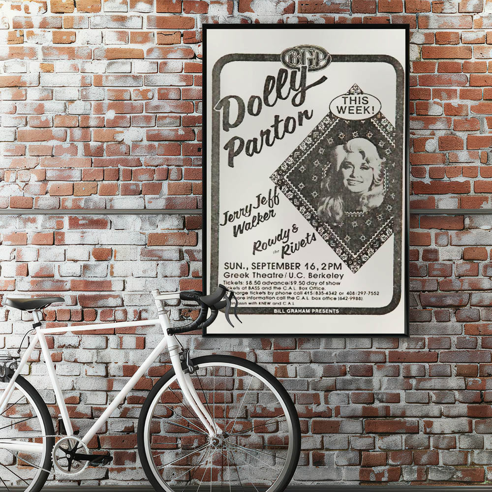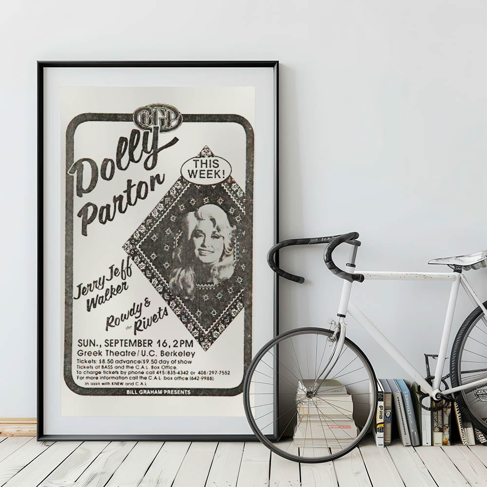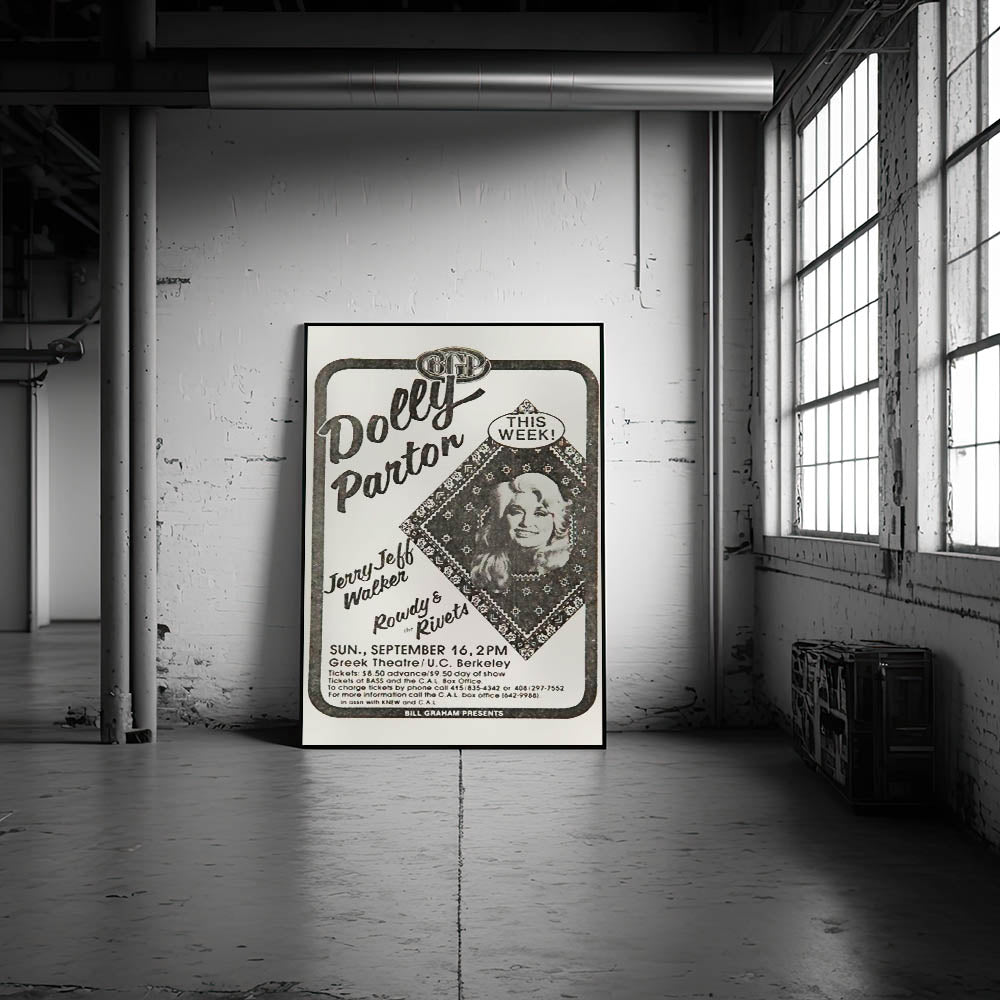Celebrate Dolly Parton’s unforgettable performance with this Retro Poster Art from her concert at the Greek Theatre in Berkeley. Featuring the iconic image of Dolly, this vintage print captures her timeless charm and musical talent. The bold, graphic design with black-and-white tones and intricate borders perfectly represents Dolly’s unique style and charisma. This poster is an essential piece for fans of nostalgic art prints and lovers of vintage decor.