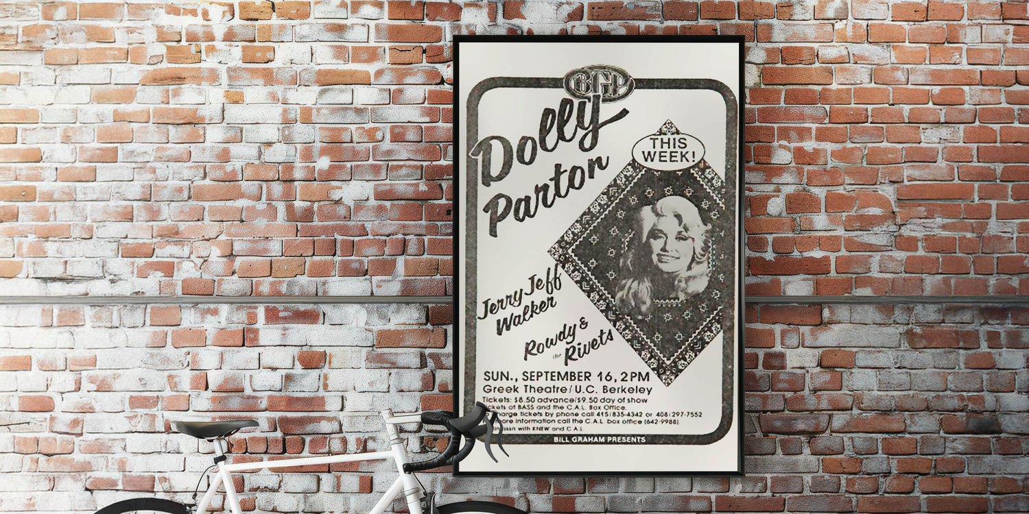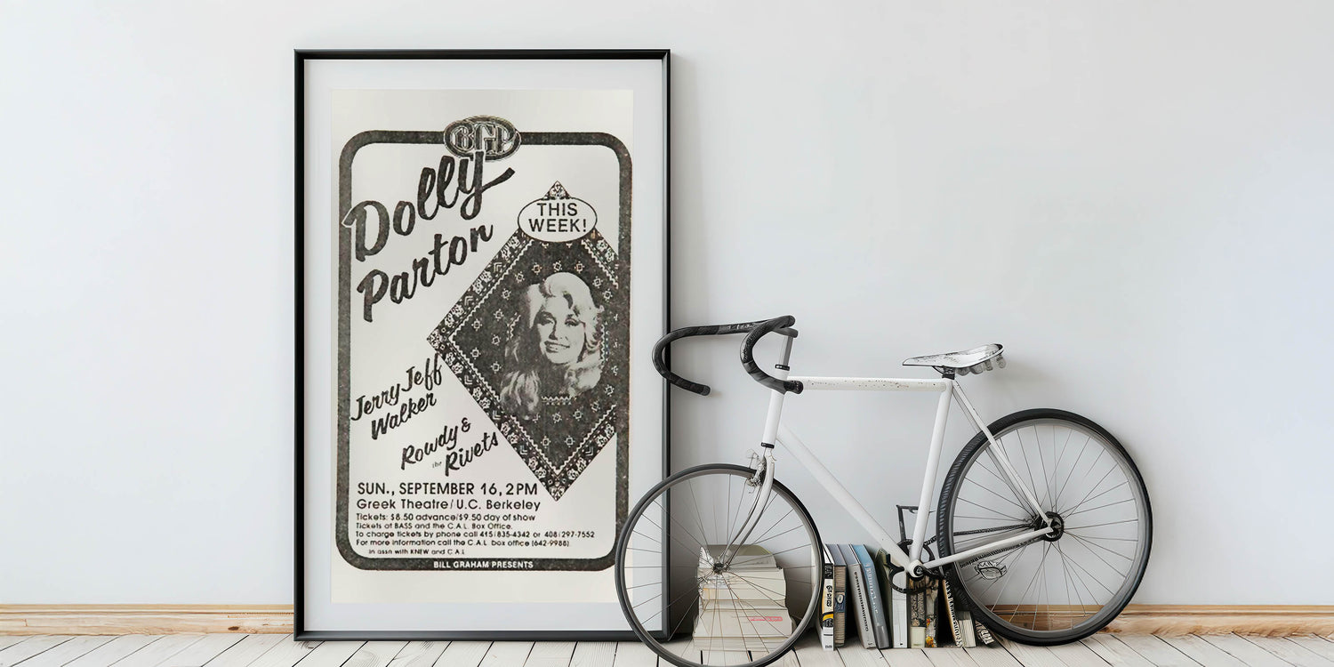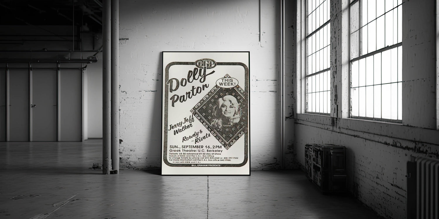 Celebrate Dolly Parton’s unforgettable performance with this Retro Poster Art from her concert at the Greek Theatre in Berkeley. Featuring the iconic image of Dolly, this vintage print captures her timeless charm and musical talent. The bold, graphic design with black-and-white tones and intricate borders perfectly represents Dolly’s unique style and charisma. This poster is an essential piece for fans of nostalgic art prints and lovers of vintage decor.