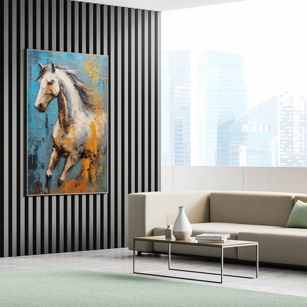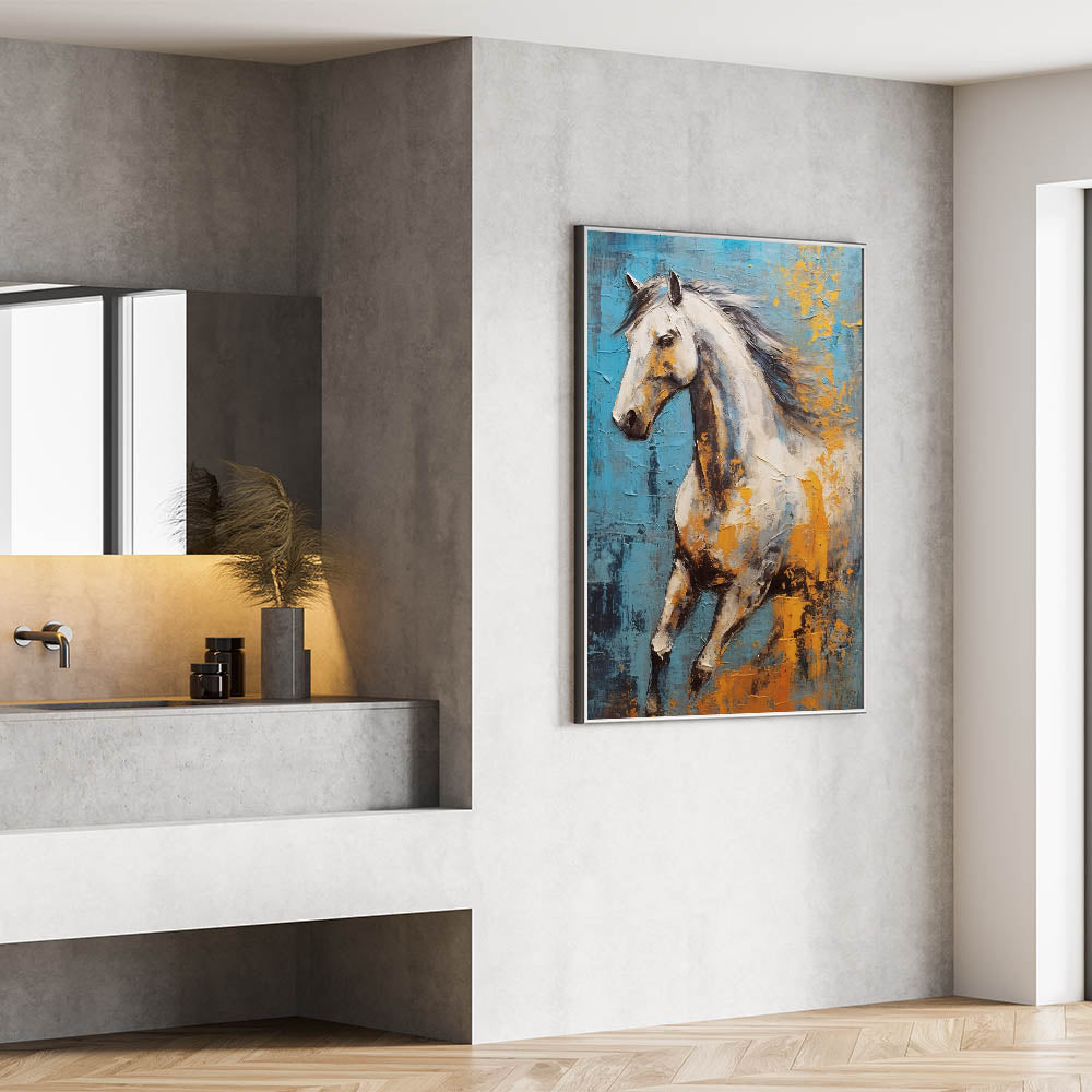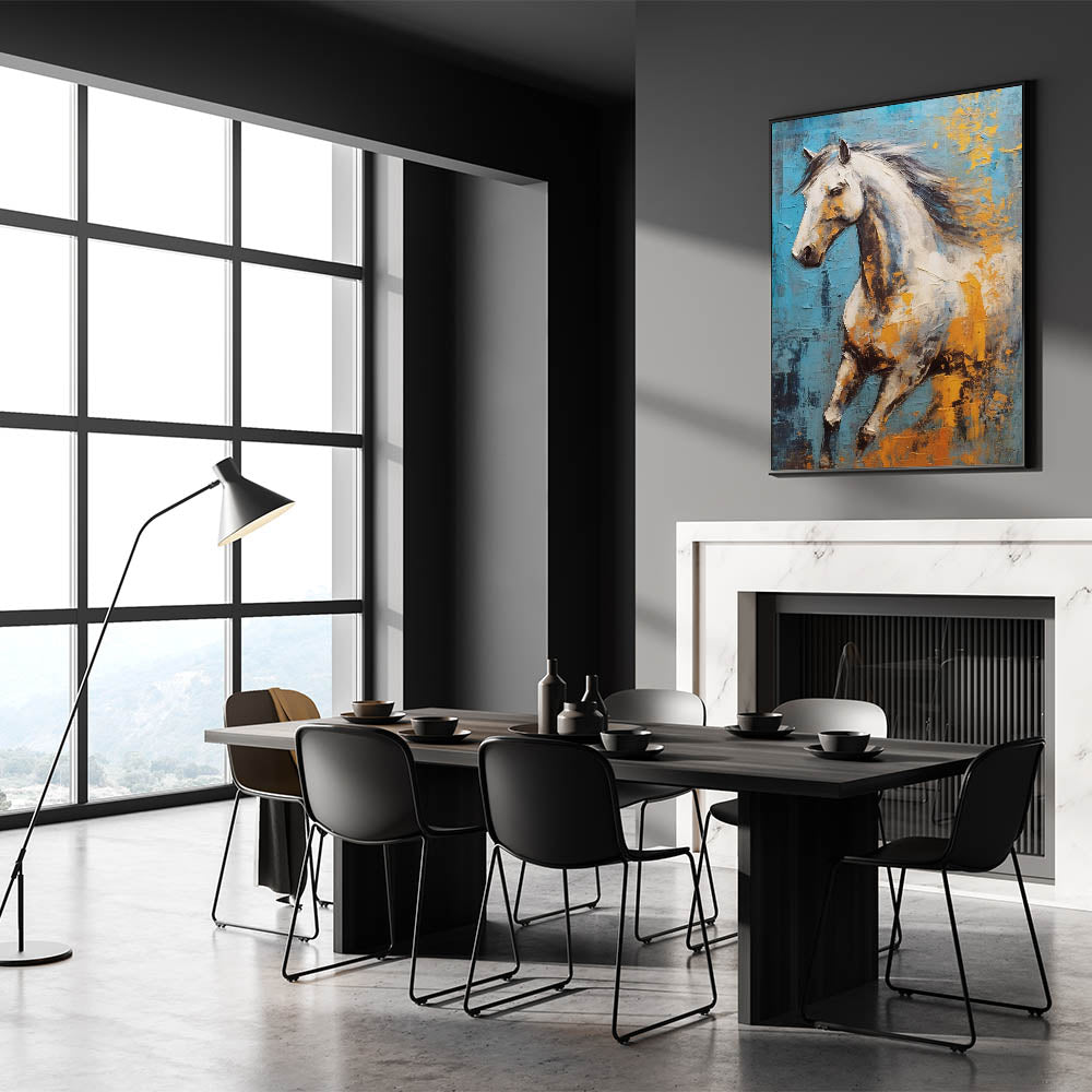 Add a bold and dynamic touch to your home with this striking Running Horse Glam Wall Art. This captivating artwork showcases a powerful horse in motion, blending vibrant blues and golds with textured brushstrokes to create a sense of movement and energy. The metallic gold accents complement the deep blue background, making this piece a perfect addition to any modern glam interior.
