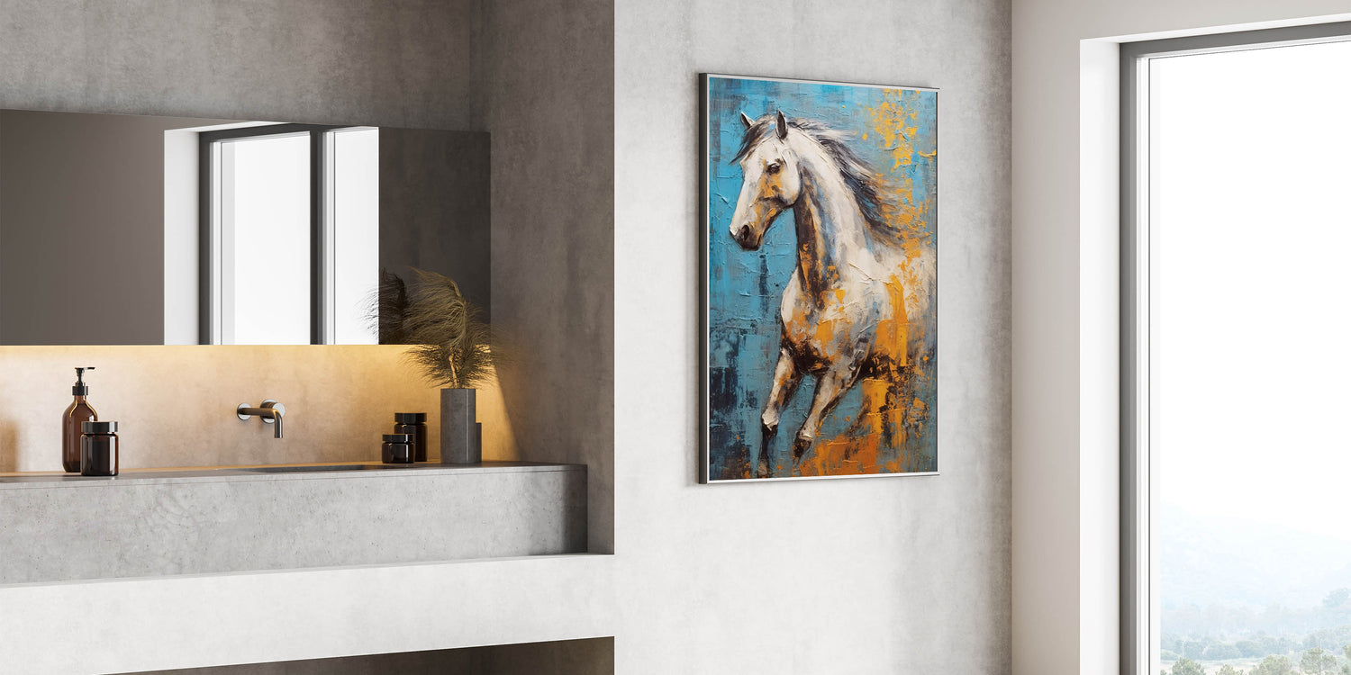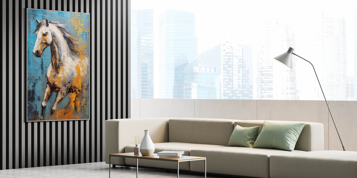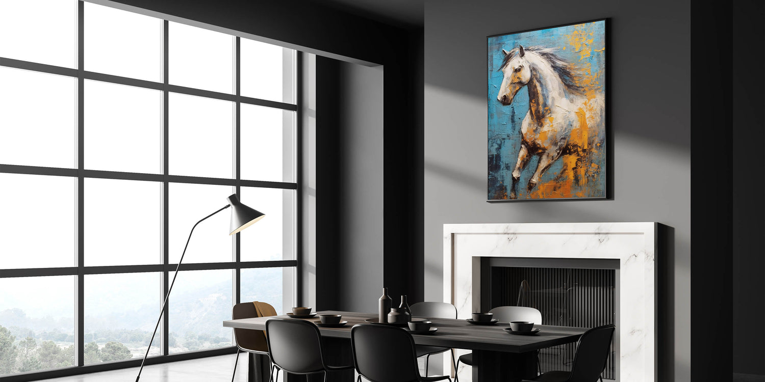 - Design: Bold and dynamic horse in motion with vibrant blue and gold accents