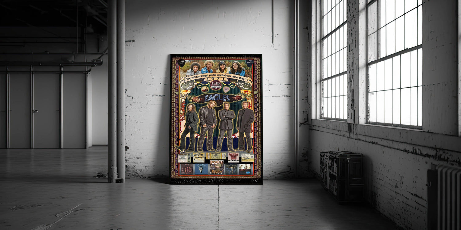 This retro canvas print will take you on a visual journey through The Eagles' remarkable history, whether you’re displaying it in your living room, music studio, or memorabilia collection.