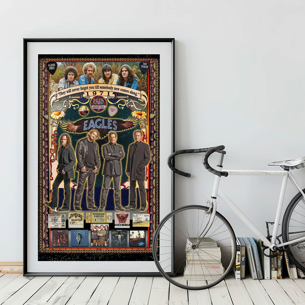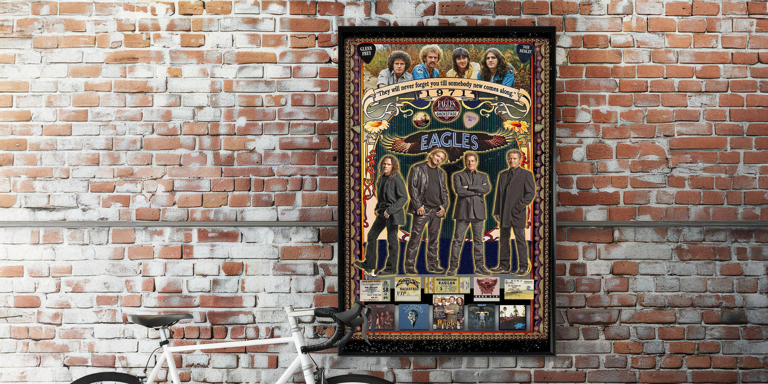 Celebrate The Eagles' legendary career with this vibrant Retro Poster Art, featuring highlights from their 1971 and 2001 performances. The poster brings together the band in both classic and modern photos, capturing their evolution over three decades. With elements like VIP backstage passes, album covers, and stunning imagery, this nostalgic art print serves as a tribute to one of rock's most iconic bands. Perfect for fans of classic rock, vintage decor, and Eagles memorabilia.