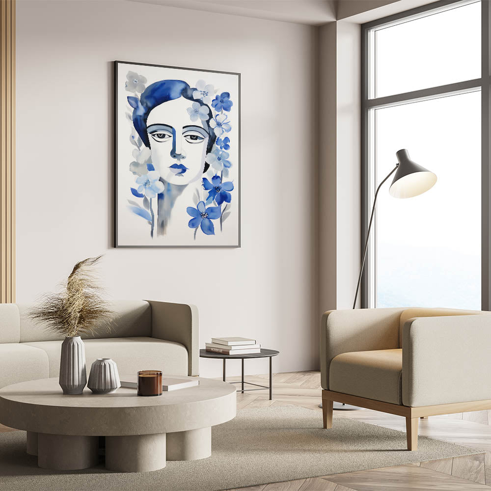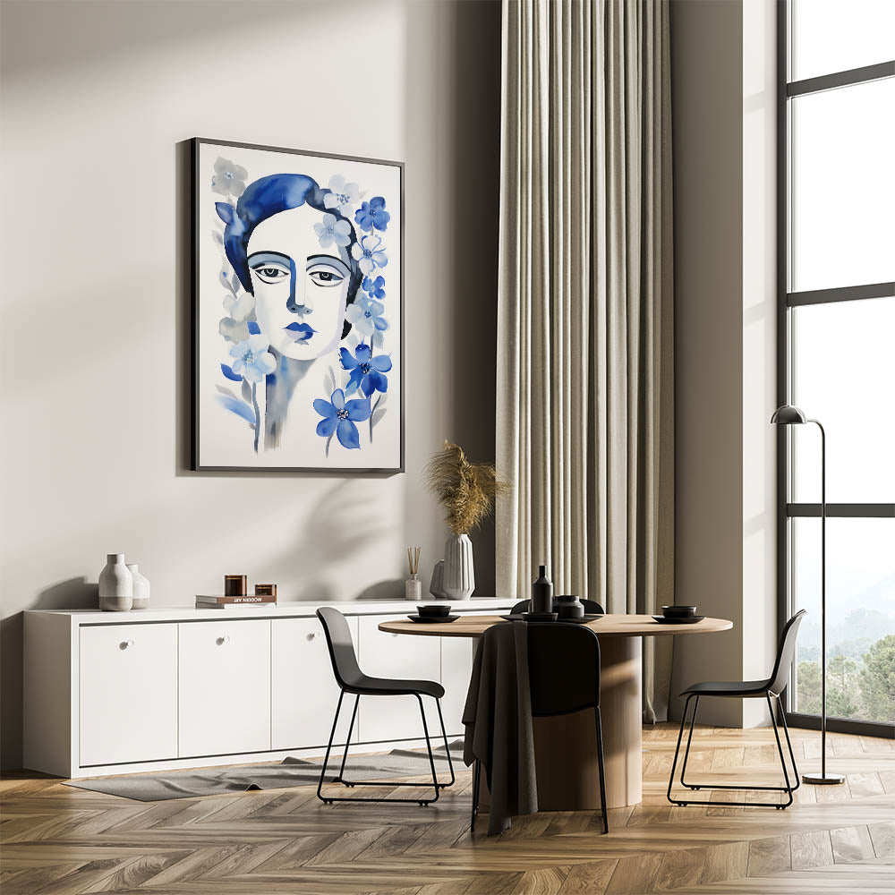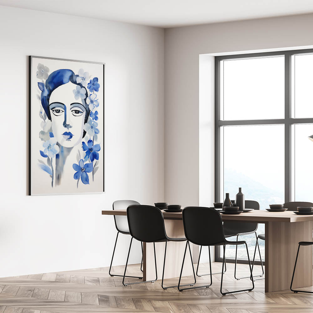 Bring a touch of elegance and vibrancy to your space with this electric art canvas, featuring a striking blue portrait adorned with delicate floral elements. The blend of deep blues and subtle monochrome accents creates a captivating composition that draws the viewer into its serene yet expressive atmosphere. This modern electric decor piece is perfect for those seeking a blend of floral beauty and artistic portraiture, adding a sophisticated and artistic touch to any room.