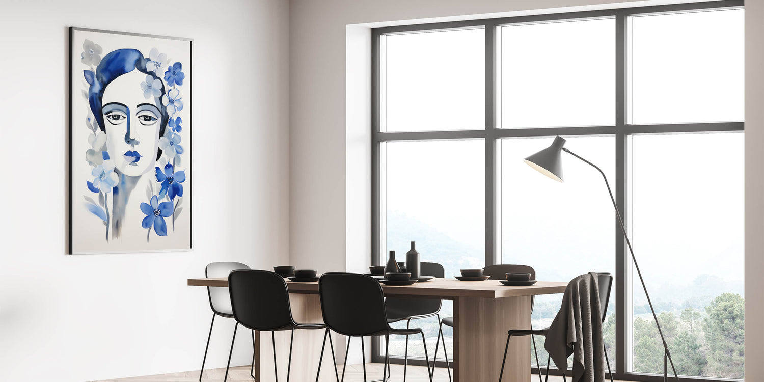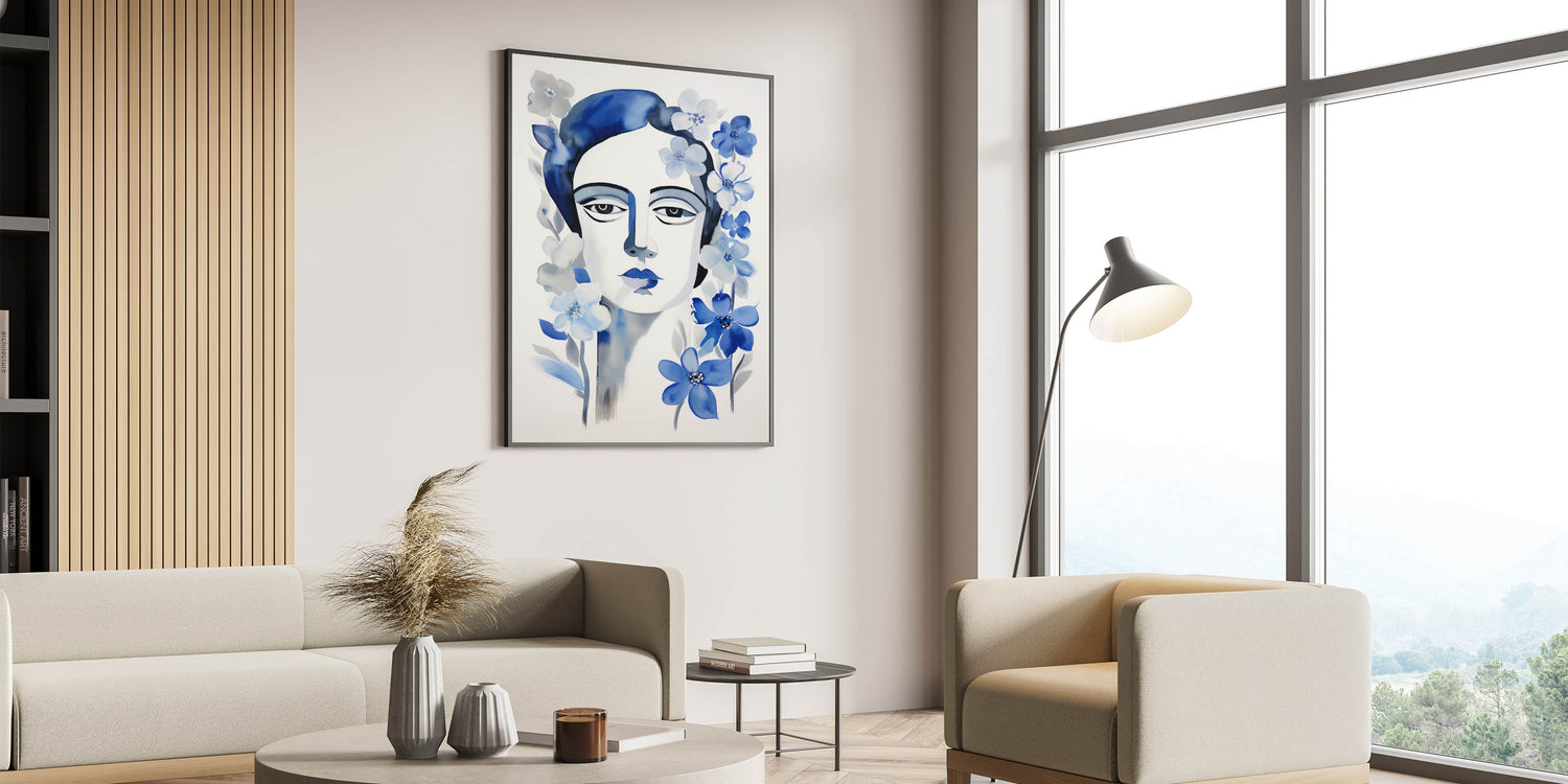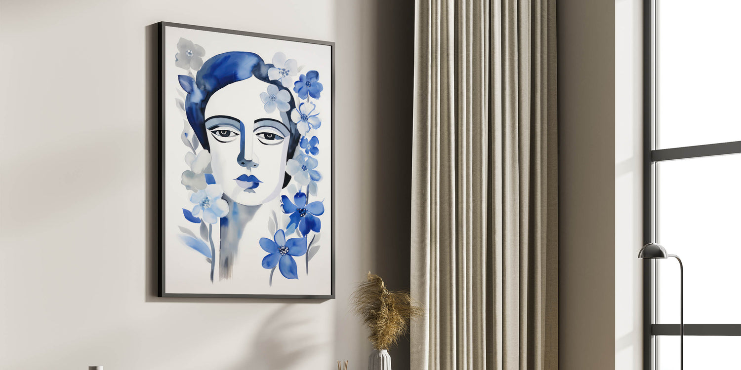 Bring a touch of elegance and vibrancy to your space with this electric art canvas, featuring a striking blue portrait adorned with delicate floral elements. The blend of deep blues and subtle monochrome accents creates a captivating composition that draws the viewer into its serene yet expressive atmosphere. This modern electric decor piece is perfect for those seeking a blend of floral beauty and artistic portraiture, adding a sophisticated and artistic touch to any room.