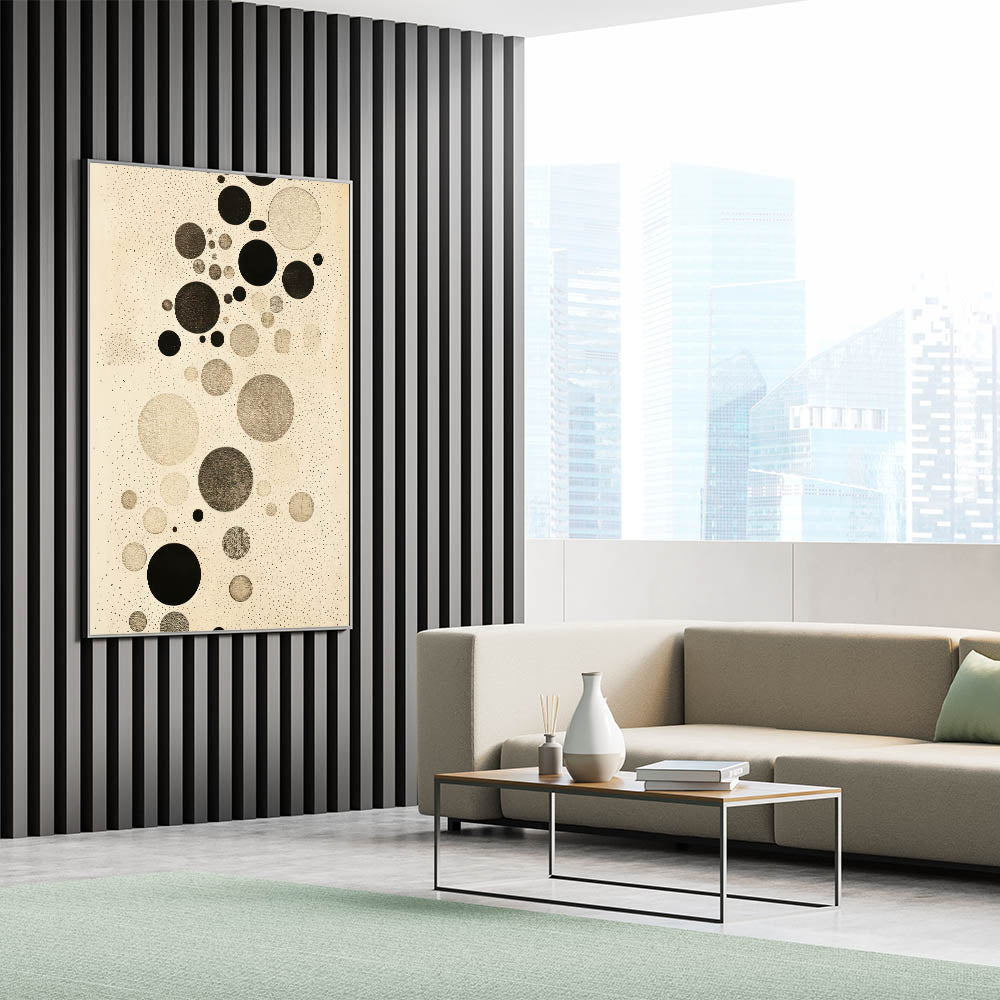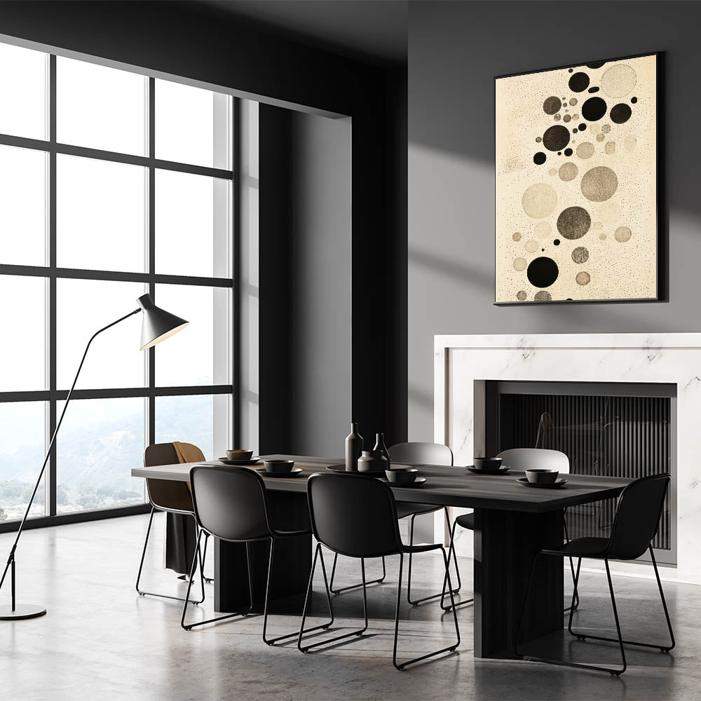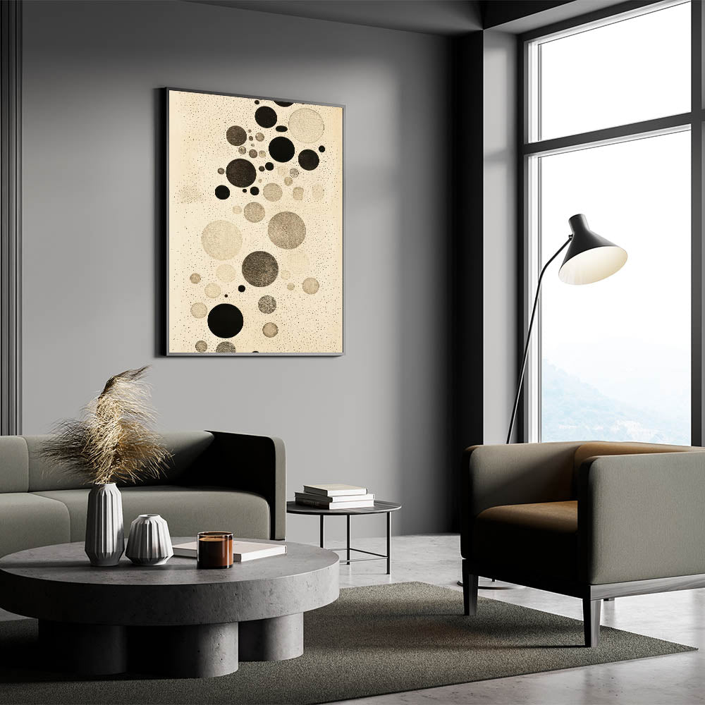 Elevate your space with this electric art canvas, showcasing a minimalist arrangement of black and beige floating circles. The artwork’s clean, simple design creates a sense of movement and fluidity, drawing the viewer into its abstract depth. The subtle variation in circle sizes and textures makes it a versatile piece that complements both modern and contemporary interiors. This modern electric decor adds an understated yet dynamic touch, perfect for those who appreciate unique electric artwork with a minimalist flair.