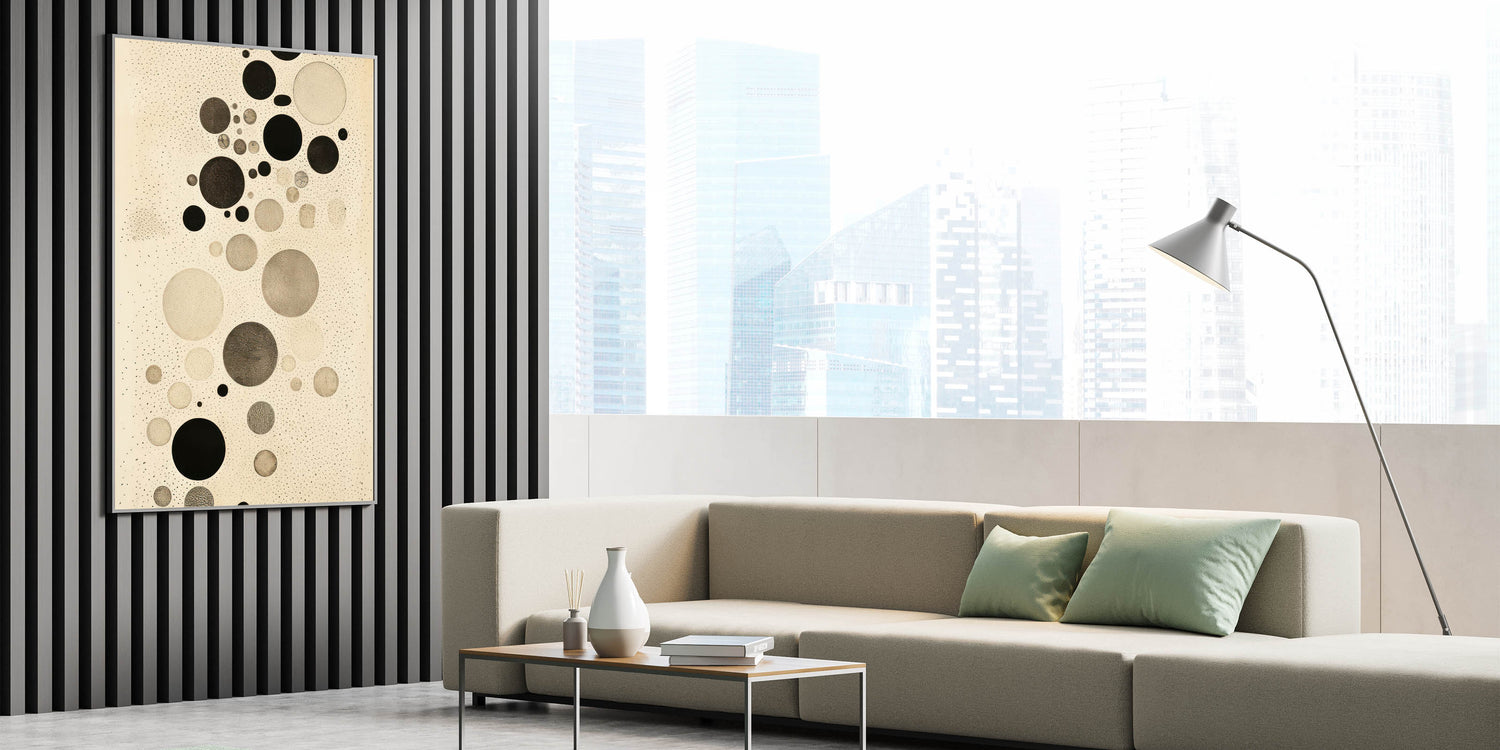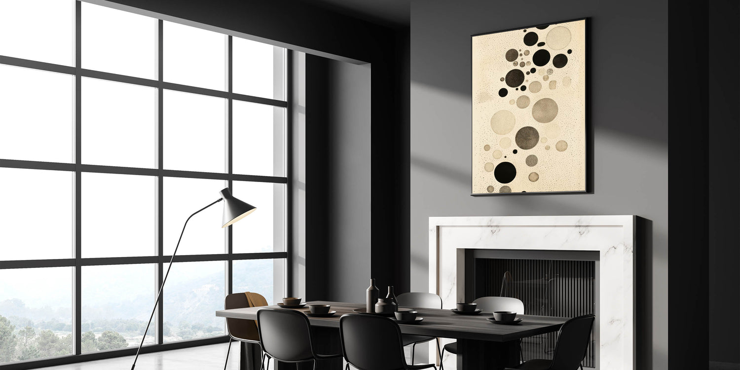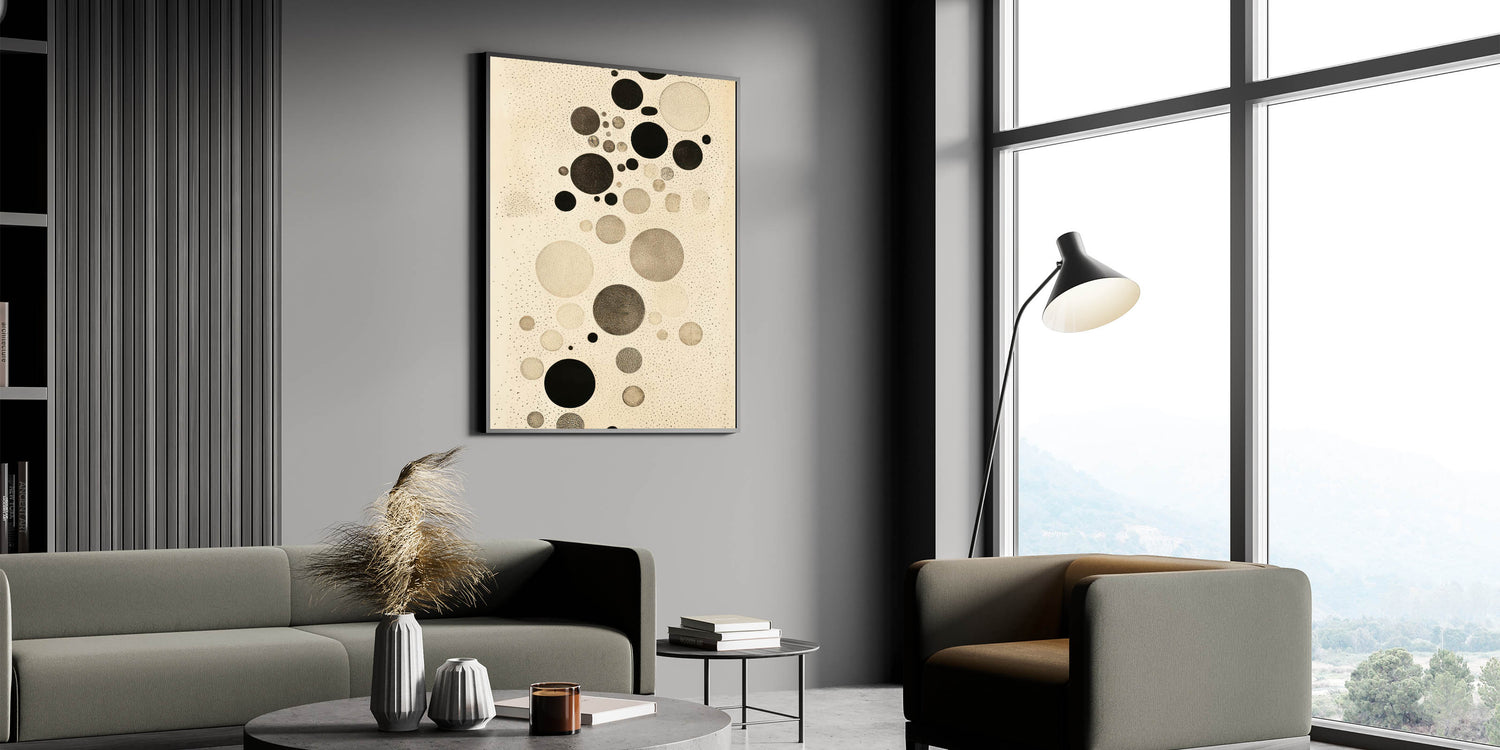 Elevate your space with this electric art canvas, showcasing a minimalist arrangement of black and beige floating circles. The artwork’s clean, simple design creates a sense of movement and fluidity, drawing the viewer into its abstract depth. The subtle variation in circle sizes and textures makes it a versatile piece that complements both modern and contemporary interiors. This modern electric decor adds an understated yet dynamic touch, perfect for those who appreciate unique electric artwork with a minimalist flair.