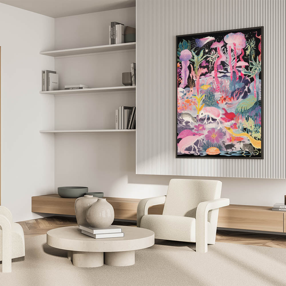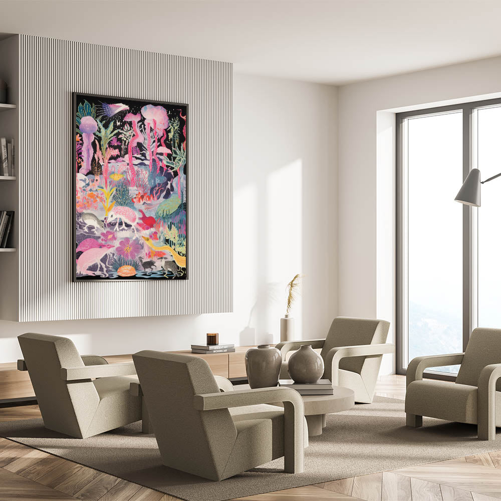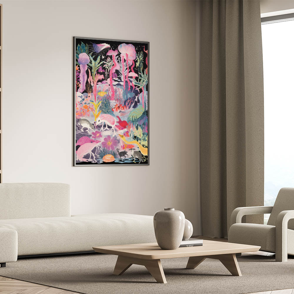 Step into a world of fantasy with this electric art canvas, showcasing a vibrant jungle teeming with colorful creatures and lush vegetation. The intricate details and striking hues of pink, blue, green, and yellow create a dynamic scene that bursts with life. This modern electric decor piece is perfect for those who love bold, imaginative artwork that transforms any space into a captivating and surreal environment. Ideal for creative spaces, children's rooms, or anyone who appreciates the magic of abstract and fantastical designs.