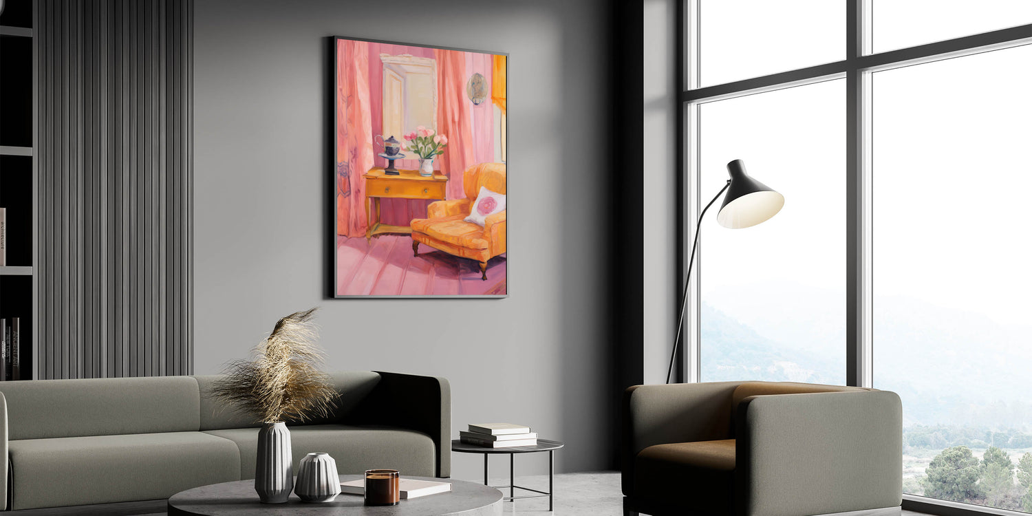 Infuse your space with a lively ambiance using this Electric Art Canvas, featuring a beautiful floral arrangement and an inviting chair motif set against a vibrant backdrop. The mix of warm pink, orange, and yellow tones creates a dynamic and cheerful aesthetic, perfect for enhancing modern interiors with vibrant electric decor. This artwork stands as a statement piece, bringing life and energy into your living room, bedroom, or office.