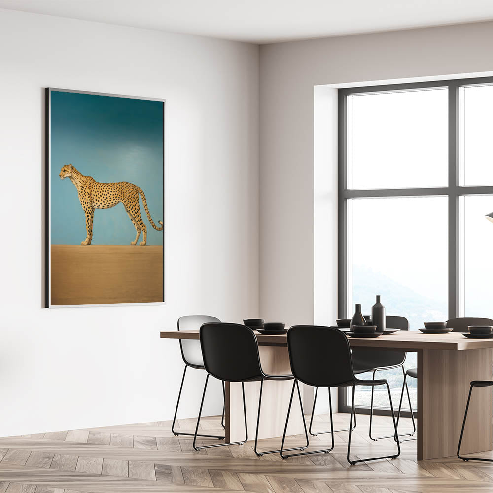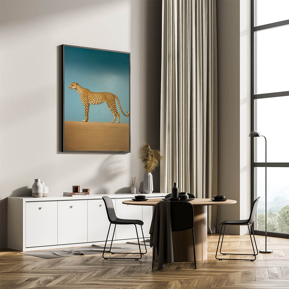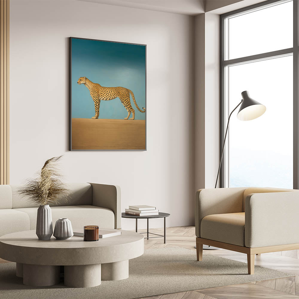 • High-Quality Print: Printed using advanced techniques to highlight the intricate details of the cheetah’s fur and the smooth, vibrant sky-blue background.