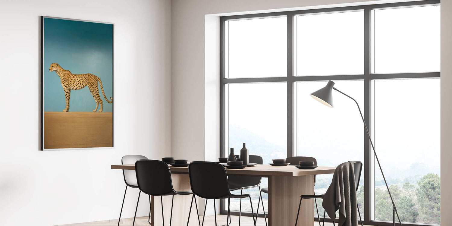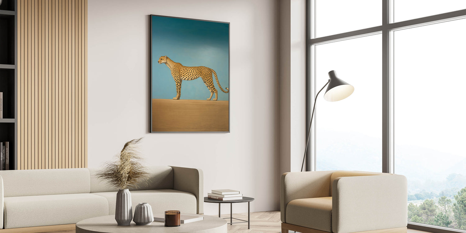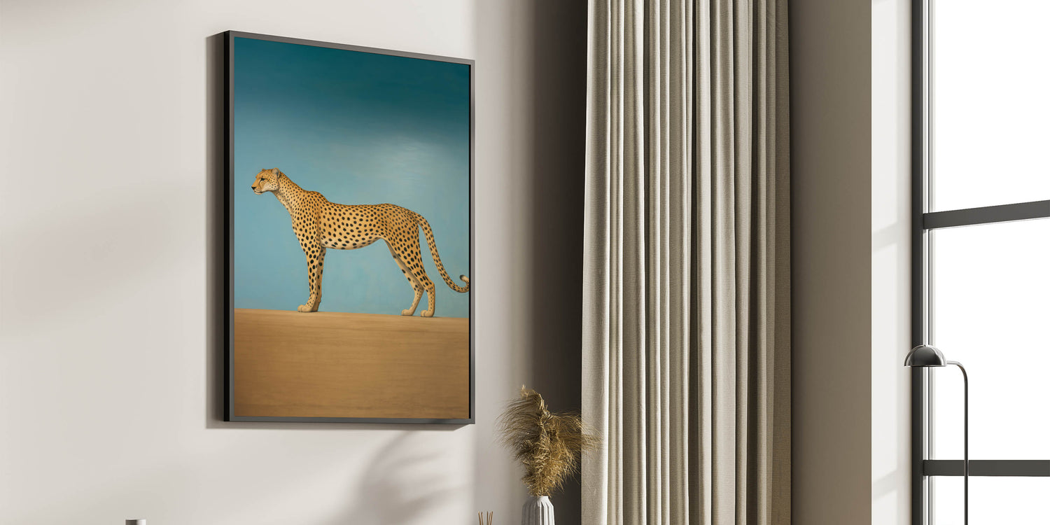 • High-Quality Print: Printed using advanced techniques to highlight the intricate details of the cheetah’s fur and the smooth, vibrant sky-blue background.