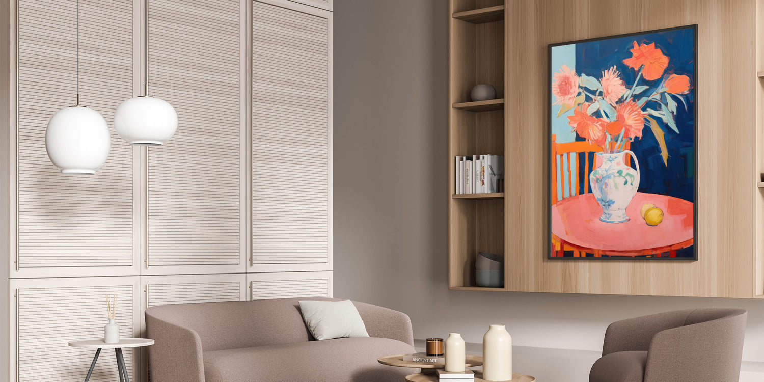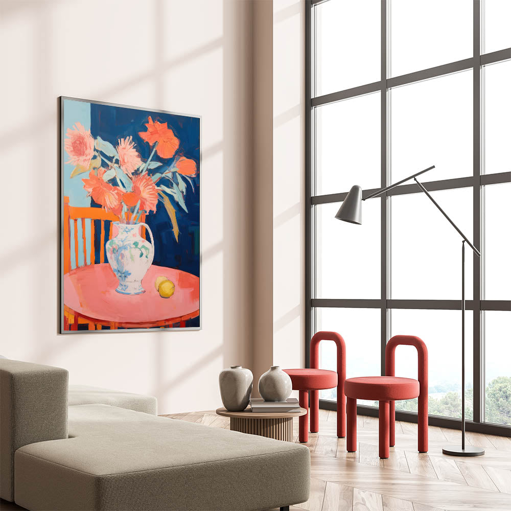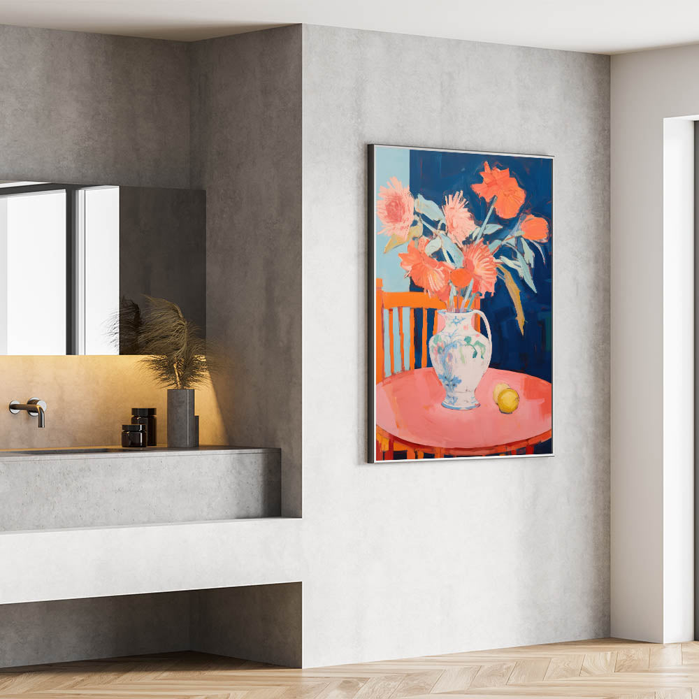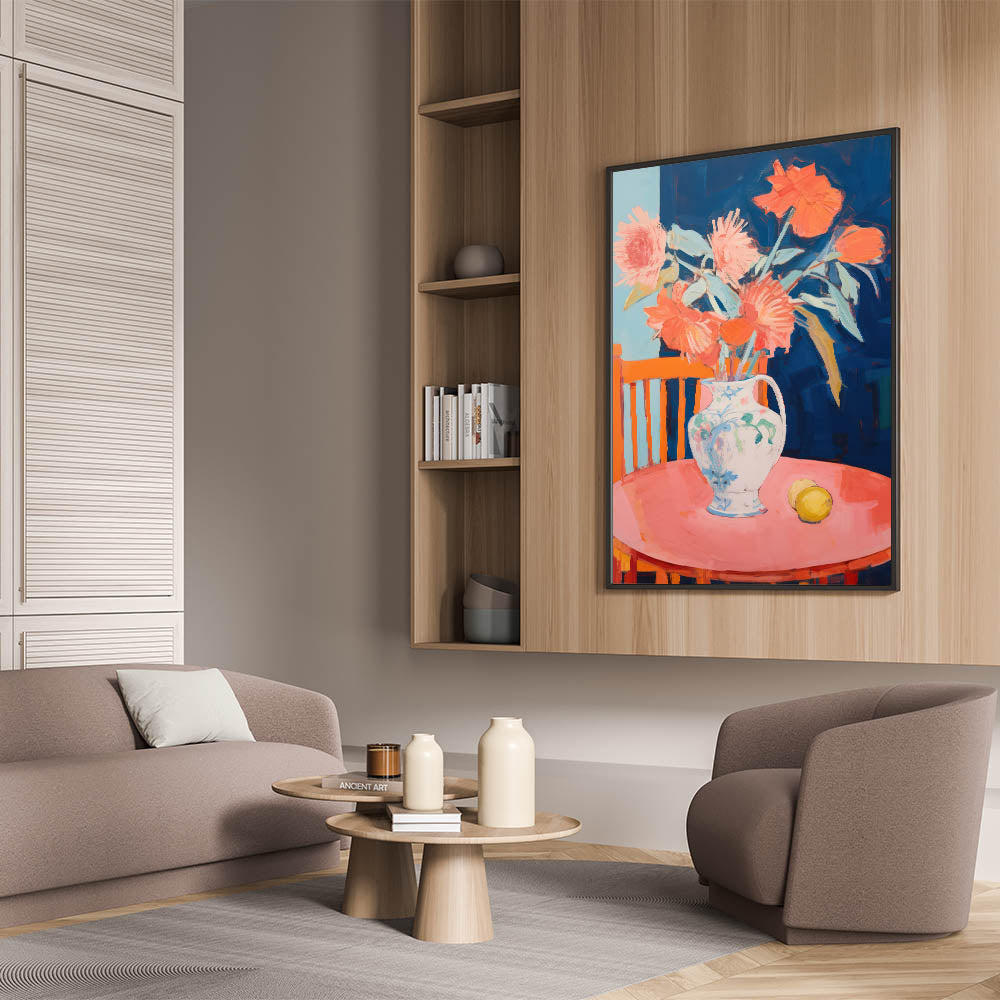 Elevate your space with this electric wall art, featuring a striking arrangement of bold pink and orange flowers in a classic vase. Set against a rich navy blue backdrop and accented with vibrant shades of coral and soft teal, this artwork creates a dynamic contrast that draws the eye. The modern composition and playful use of colors make this electric art canvas an ideal piece for adding energy and sophistication to your space.
