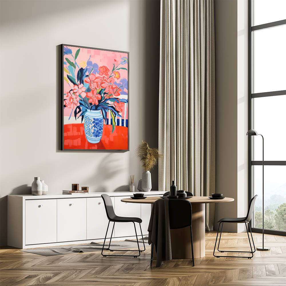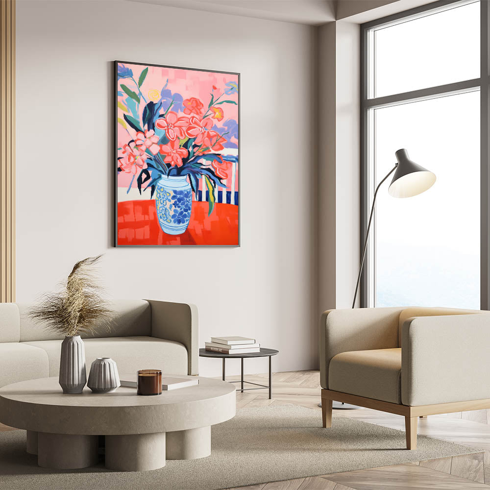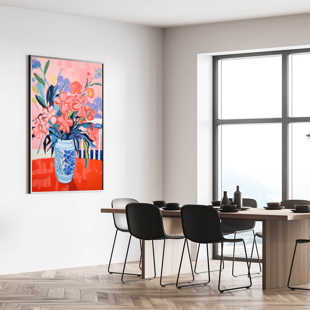 Infuse your space with energy and color through this electric wall art featuring a vibrant floral arrangement. The bold pink and red flowers stand out against the soft blush background, while the blue and teal leaves add a dynamic contrast. The classic blue floral vase provides a touch of tradition, blending beautifully with the modern composition. This electric art canvas is a perfect choice for anyone seeking to enhance their space with an eye-catching and lively piece of decor.