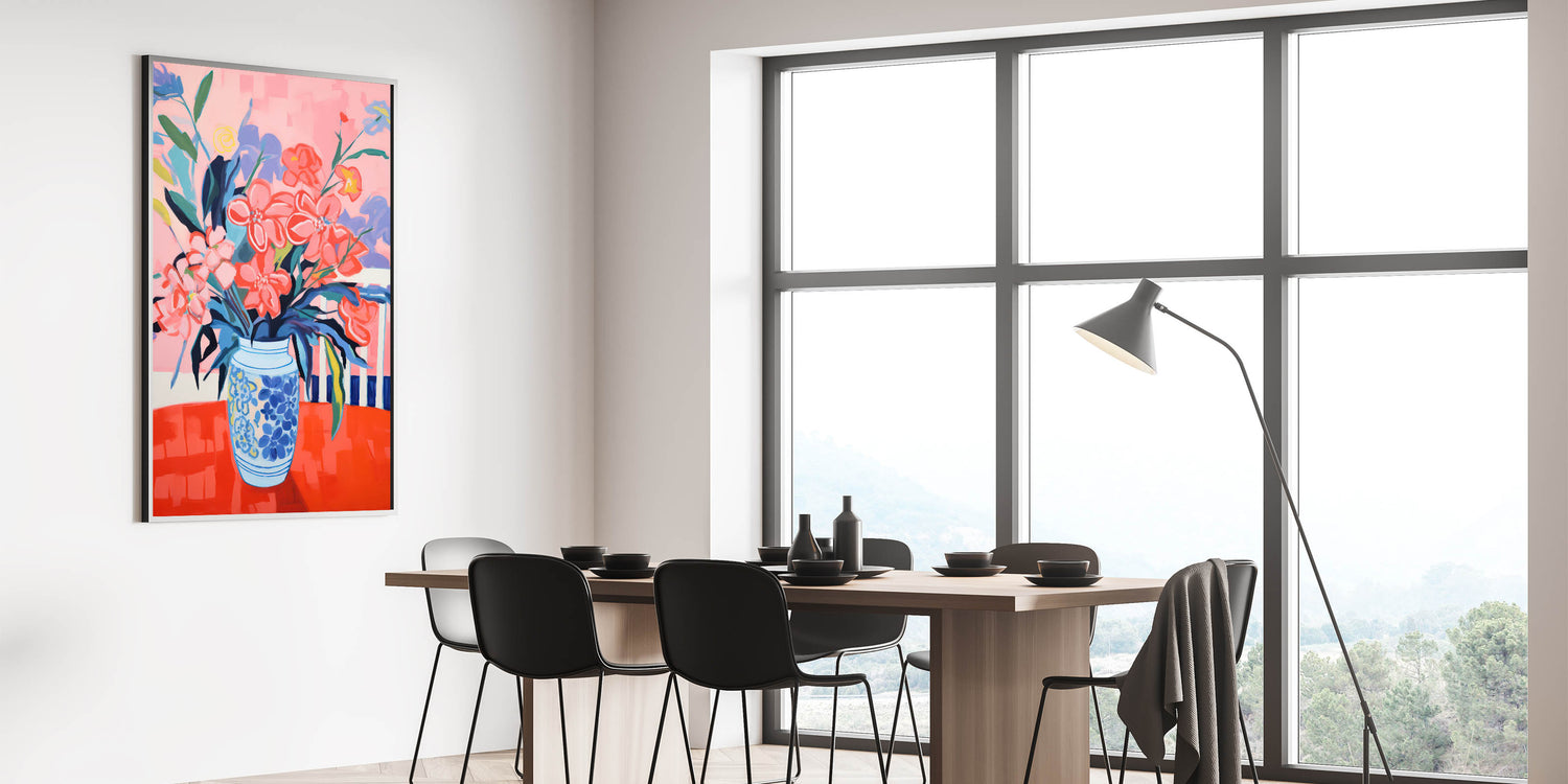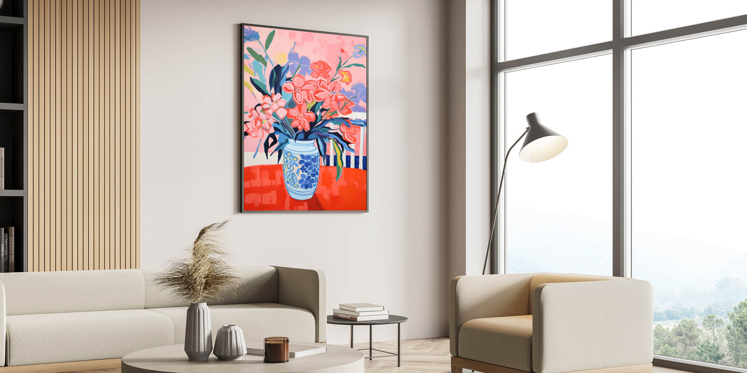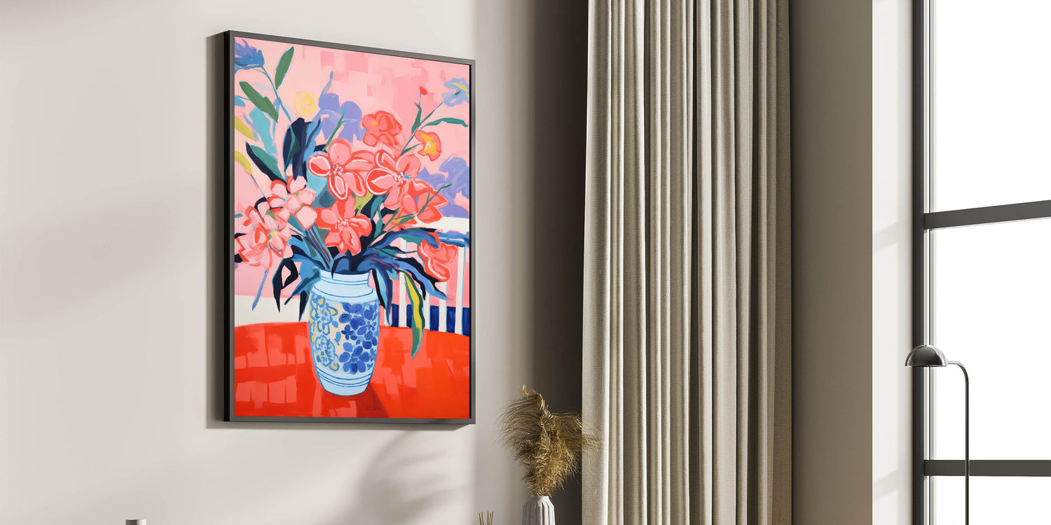 Infuse your space with energy and color through this electric wall art featuring a vibrant floral arrangement. The bold pink and red flowers stand out against the soft blush background, while the blue and teal leaves add a dynamic contrast. The classic blue floral vase provides a touch of tradition, blending beautifully with the modern composition. This electric art canvas is a perfect choice for anyone seeking to enhance their space with an eye-catching and lively piece of decor.