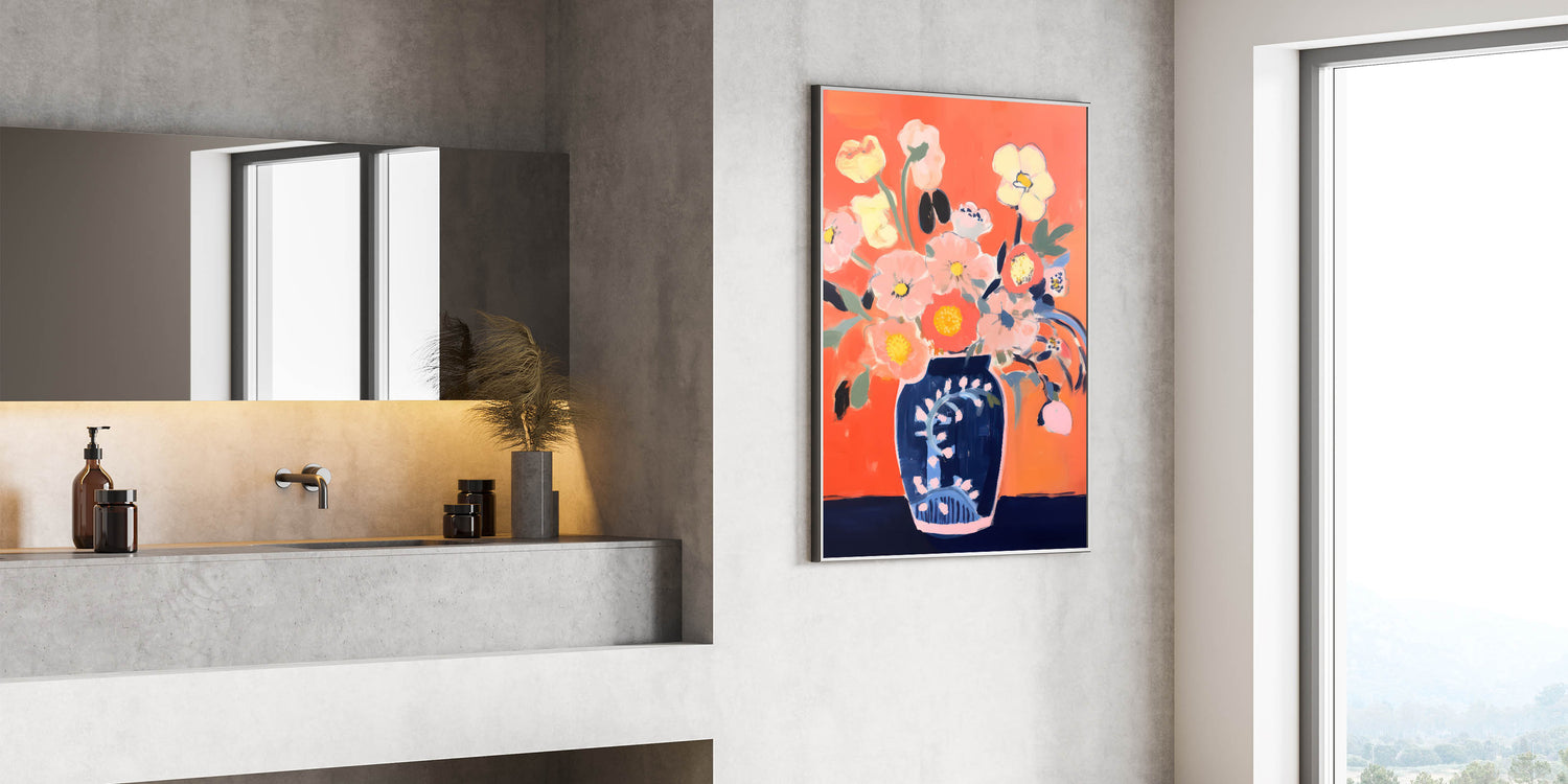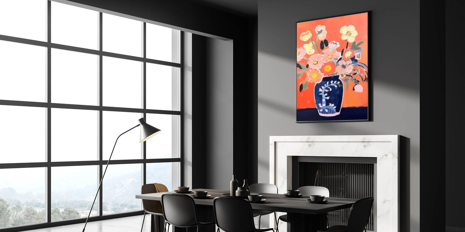 Infuse your space with energy and warmth using this Electric Floral Wall Art, featuring a lively bouquet of flowers in a navy blue vase set against a bold orange background. The dynamic blend of pink, yellow, and soft white blooms creates a captivating contrast, making it an eye-catching centerpiece for modern interiors seeking vibrant electric decor. The playful yet elegant composition adds depth and a contemporary flair, perfect for enhancing any room with style and color.