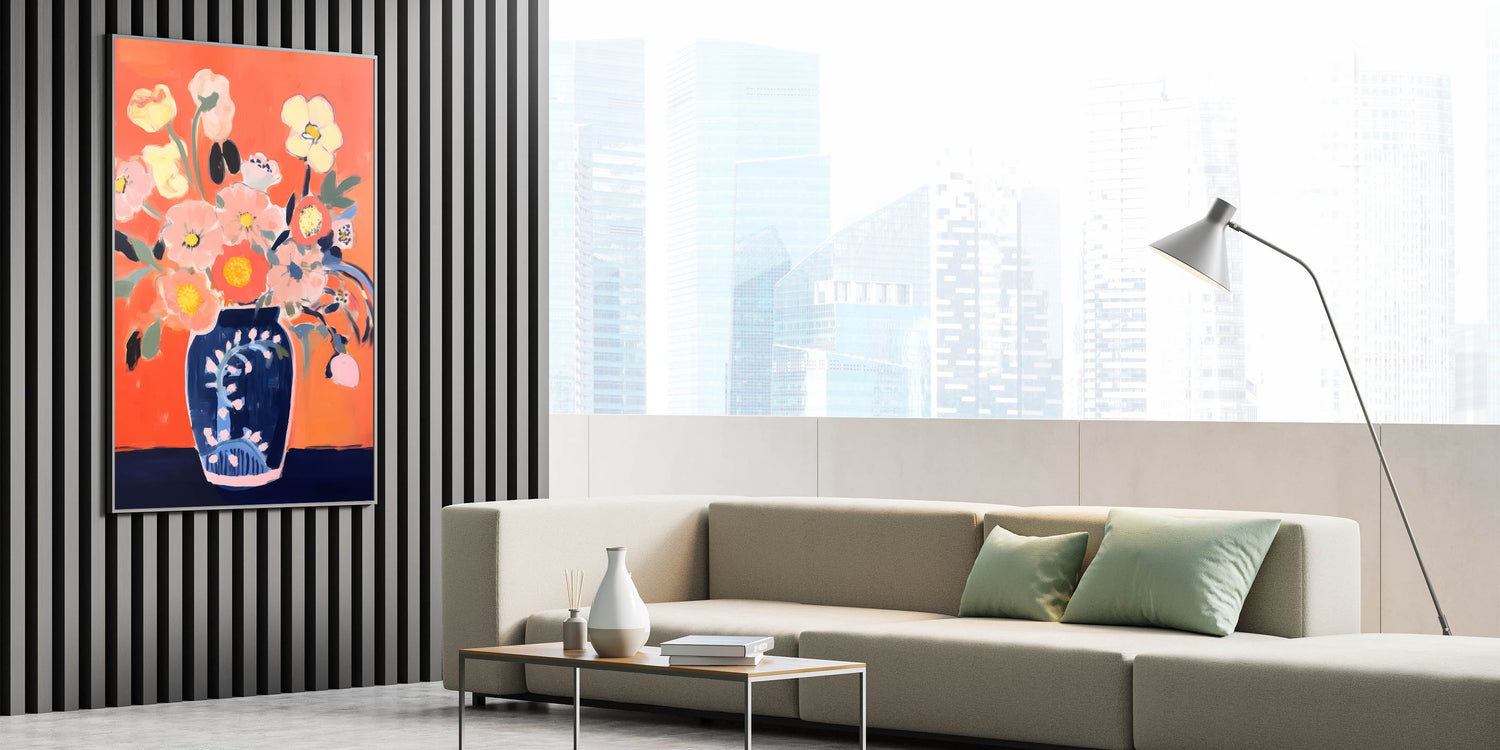 Electric Floral Wall Art - Vibrant Vase with Bold Orange Flower Display