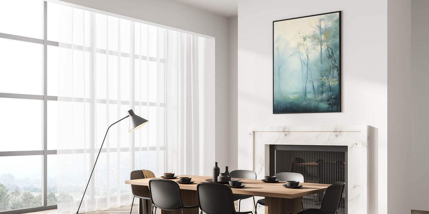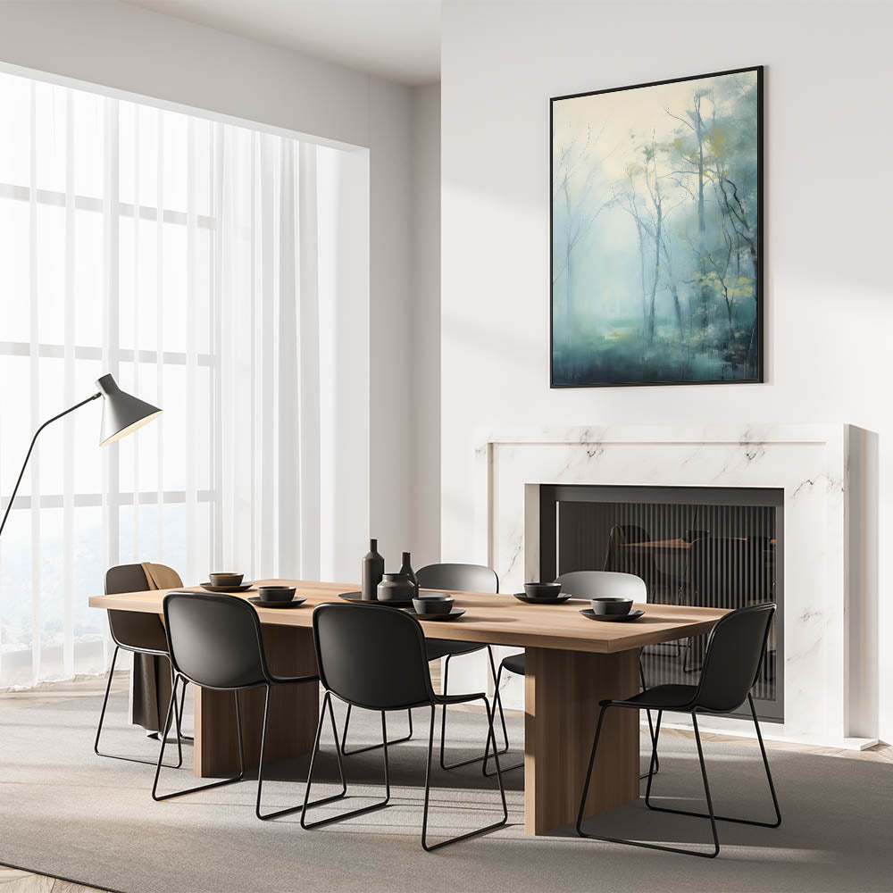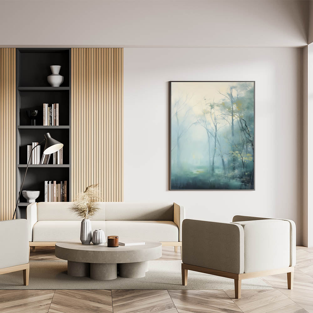 Electric Forest Wall Art: Serene Misty Landscape in Modern Decor