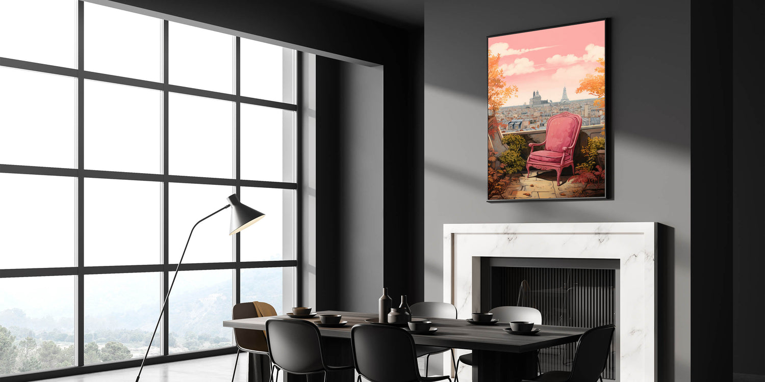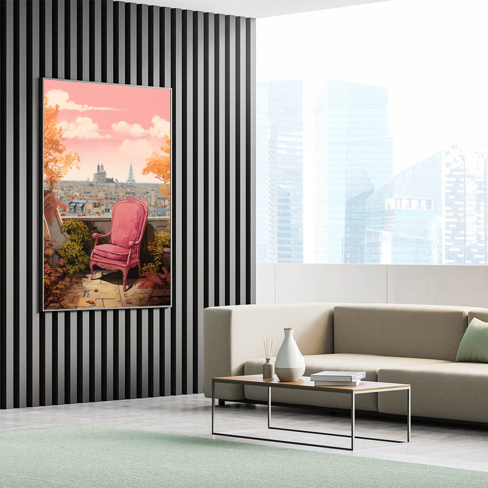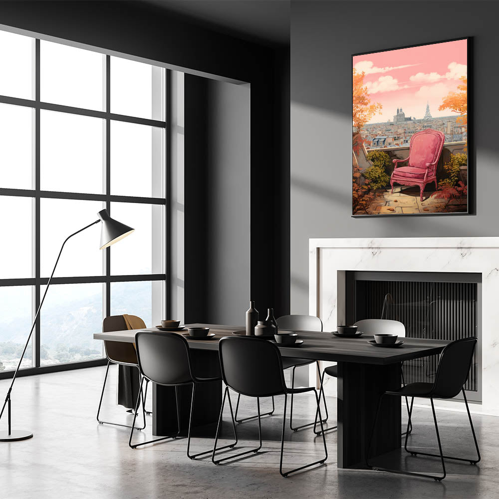 Transform your space with this charming electric-themed artwork featuring a vibrant pink chair set against a picturesque Parisian cityscape. The warm autumn leaves and iconic view of Paris in the background bring a touch of elegance and sophistication to any room. This electric art canvas captures the beauty of modern life blended with nature, making it an ideal piece for those who appreciate bold, contemporary decor.