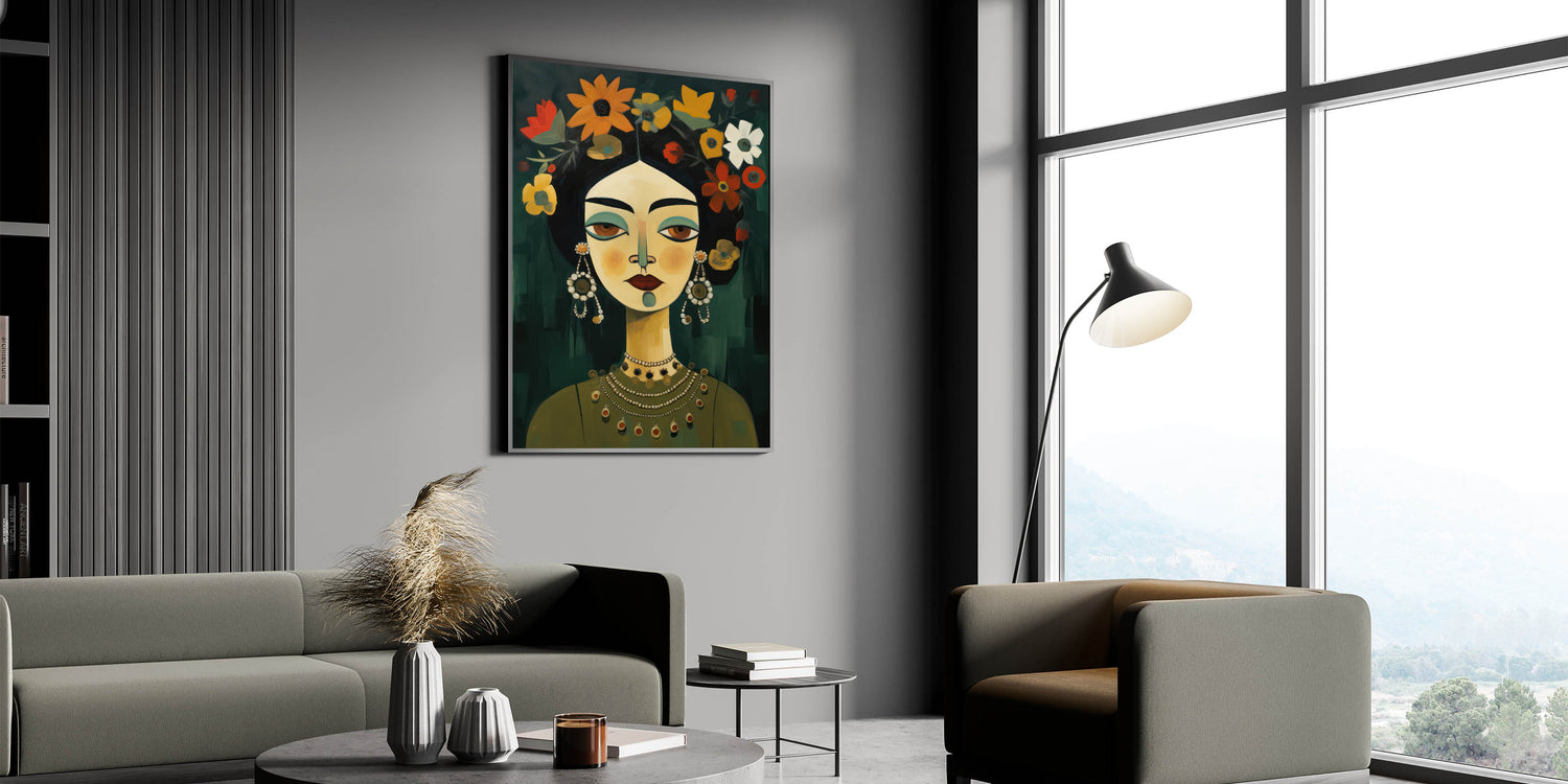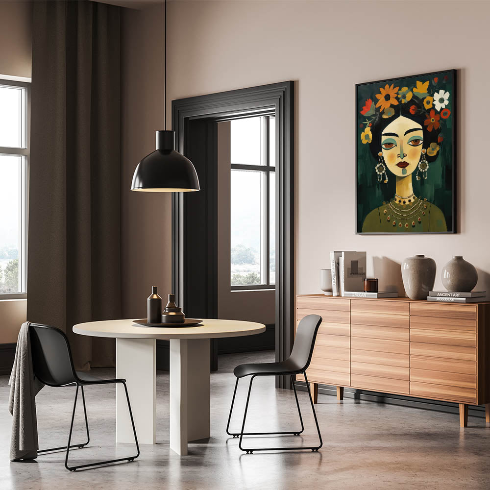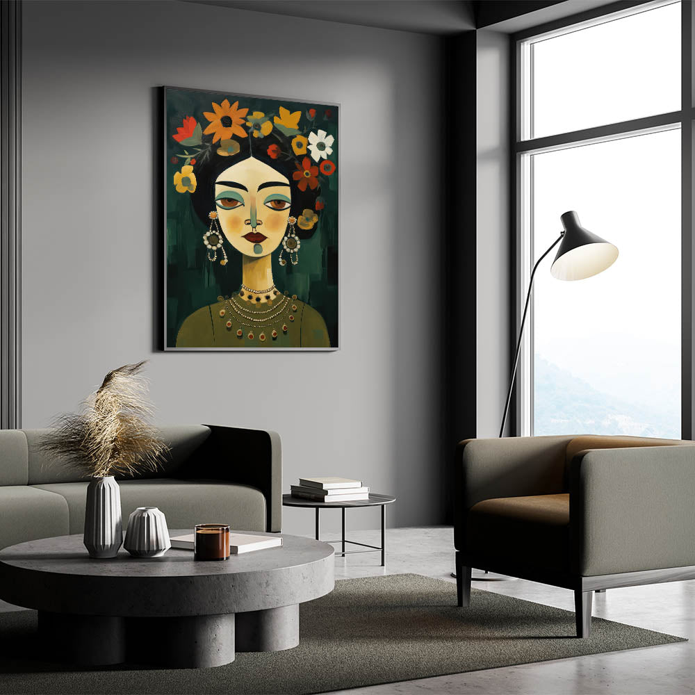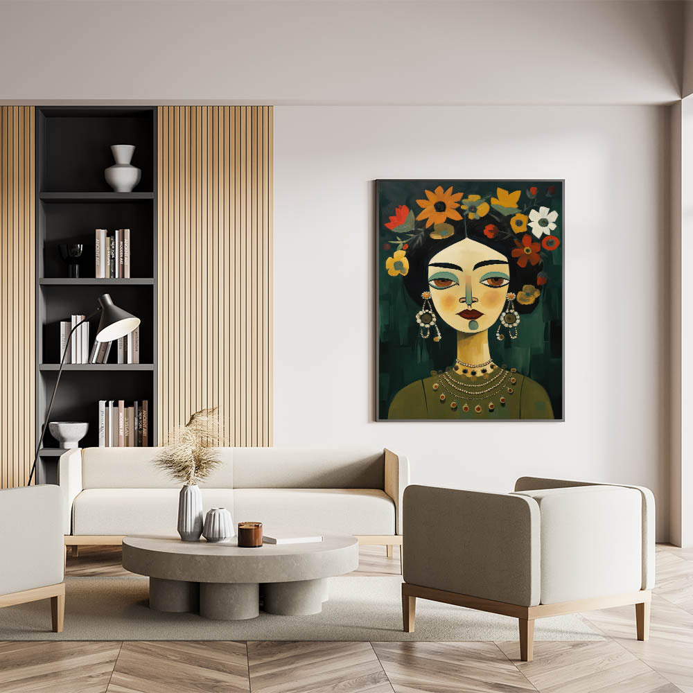 This electric wall art features a captivating portrait that blends bold, vibrant colors with floral elements, set against a deep green backdrop. The intricate details and expressive features bring the portrait to life, creating an engaging and eye-catching electric design perfect for modern and eclectic interiors. The combination of rich hues and botanical motifs adds depth and character, making this piece a striking focal point in any space.