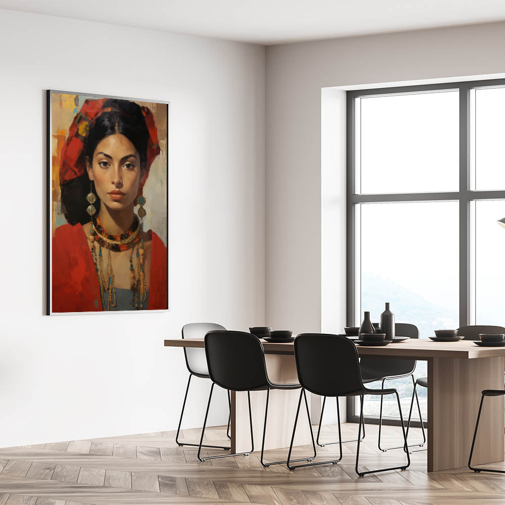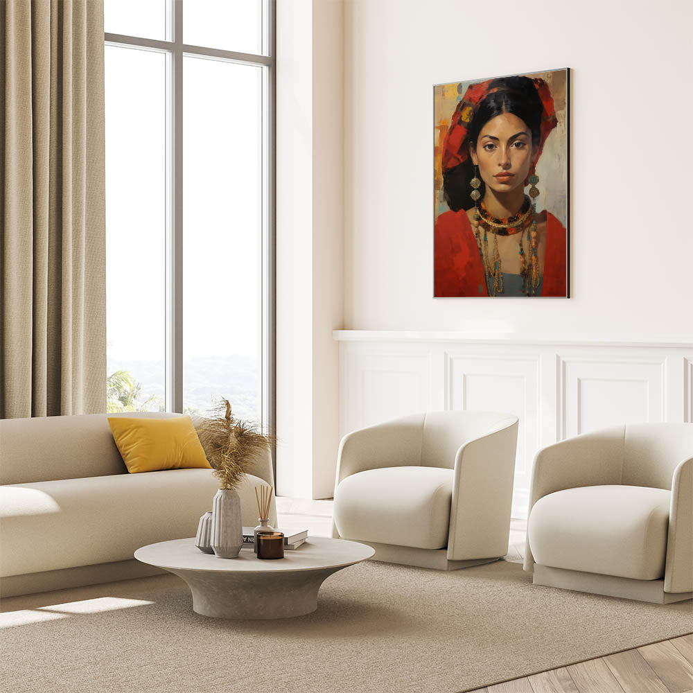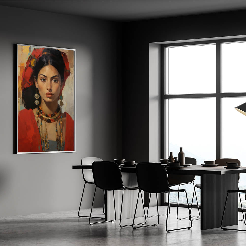 This stunning electric wall art captures the intensity and beauty of a woman adorned in vibrant jewelry and a red headscarf. The powerful use of color, from deep reds to warm golds, combined with intricate details in her jewelry, creates a striking portrait that radiates elegance and boldness. This electric art canvas brings together cultural and modern elements, making it the perfect centerpiece for any room in need of a statement piece.