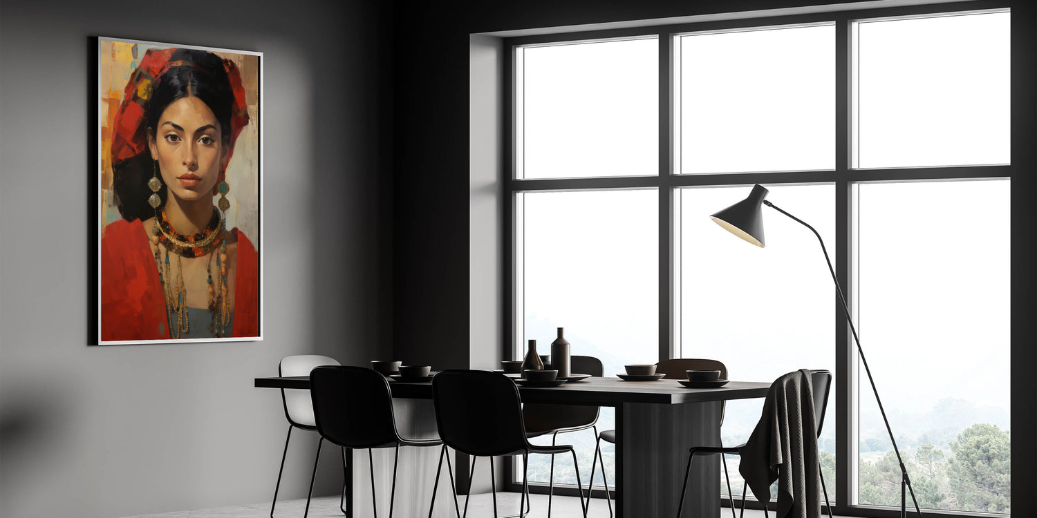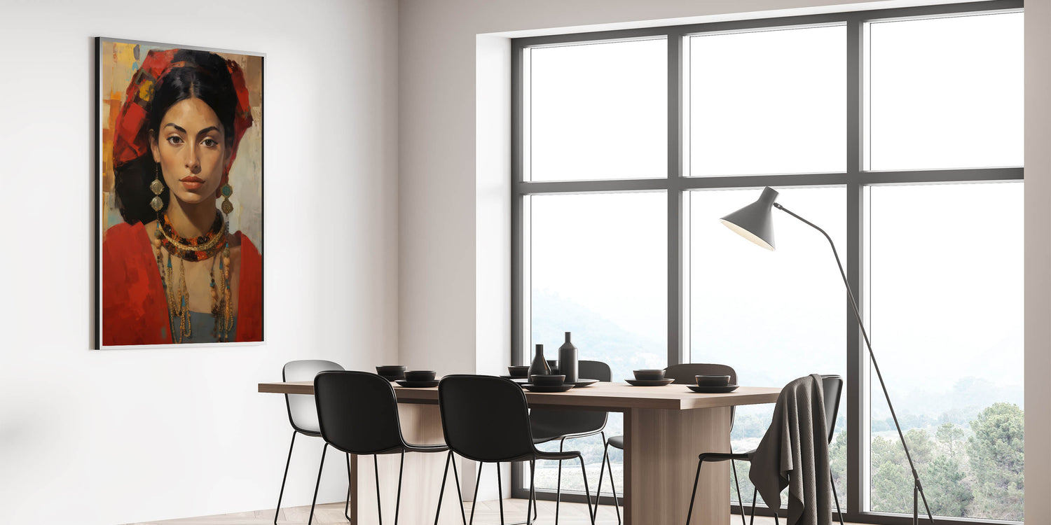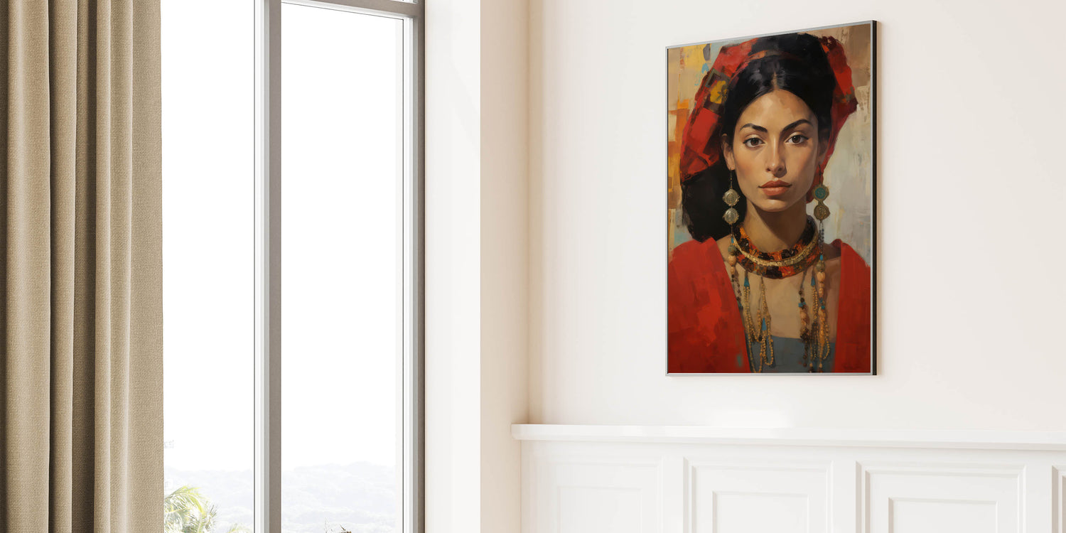 This stunning electric wall art captures the intensity and beauty of a woman adorned in vibrant jewelry and a red headscarf. The powerful use of color, from deep reds to warm golds, combined with intricate details in her jewelry, creates a striking portrait that radiates elegance and boldness. This electric art canvas brings together cultural and modern elements, making it the perfect centerpiece for any room in need of a statement piece.