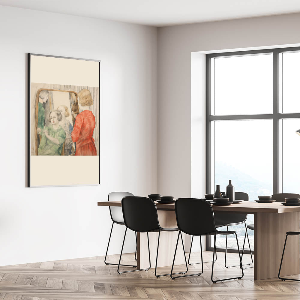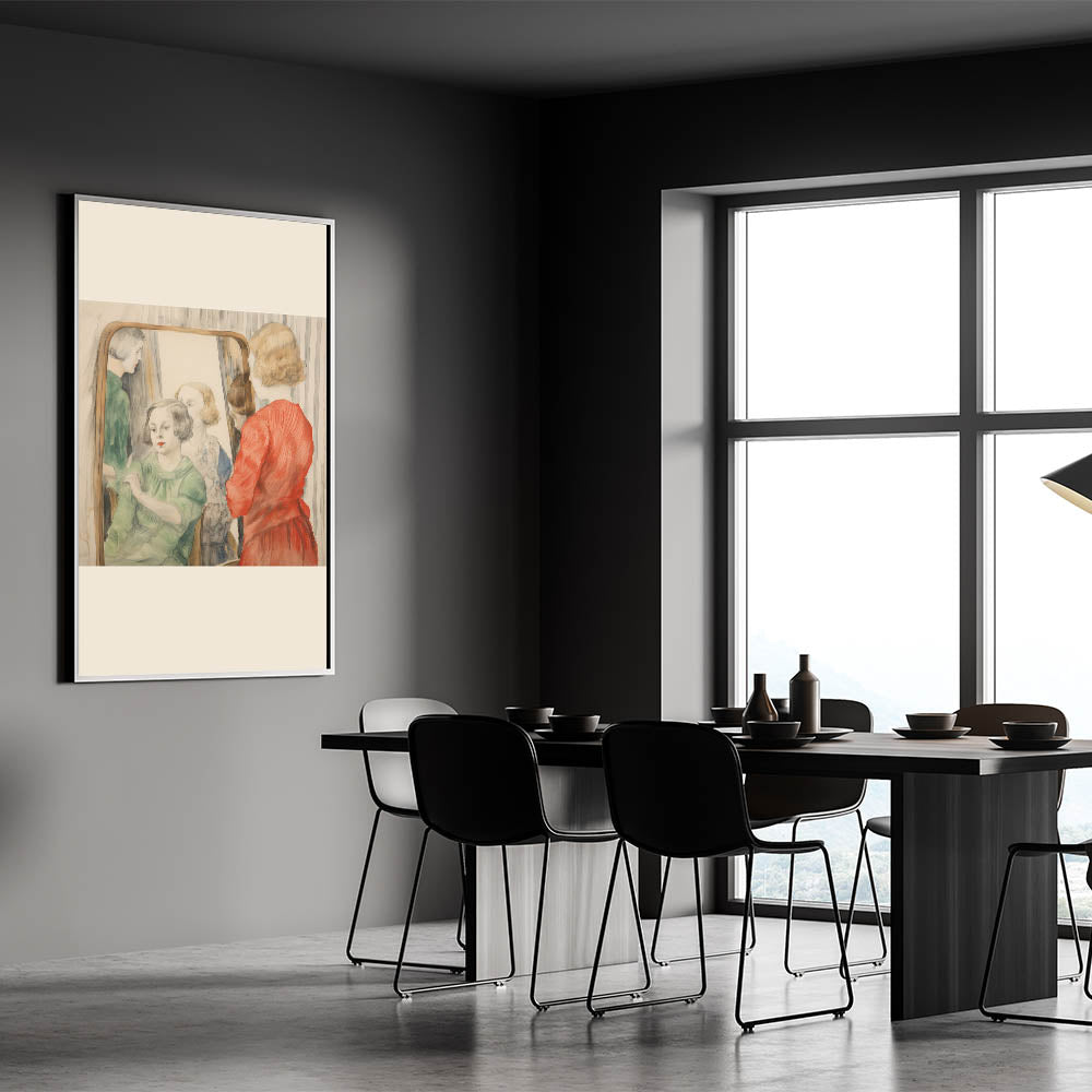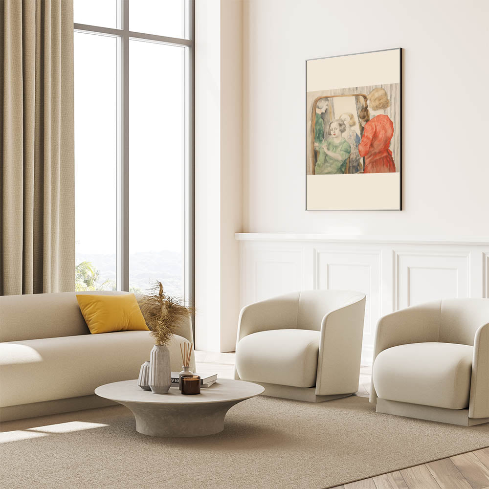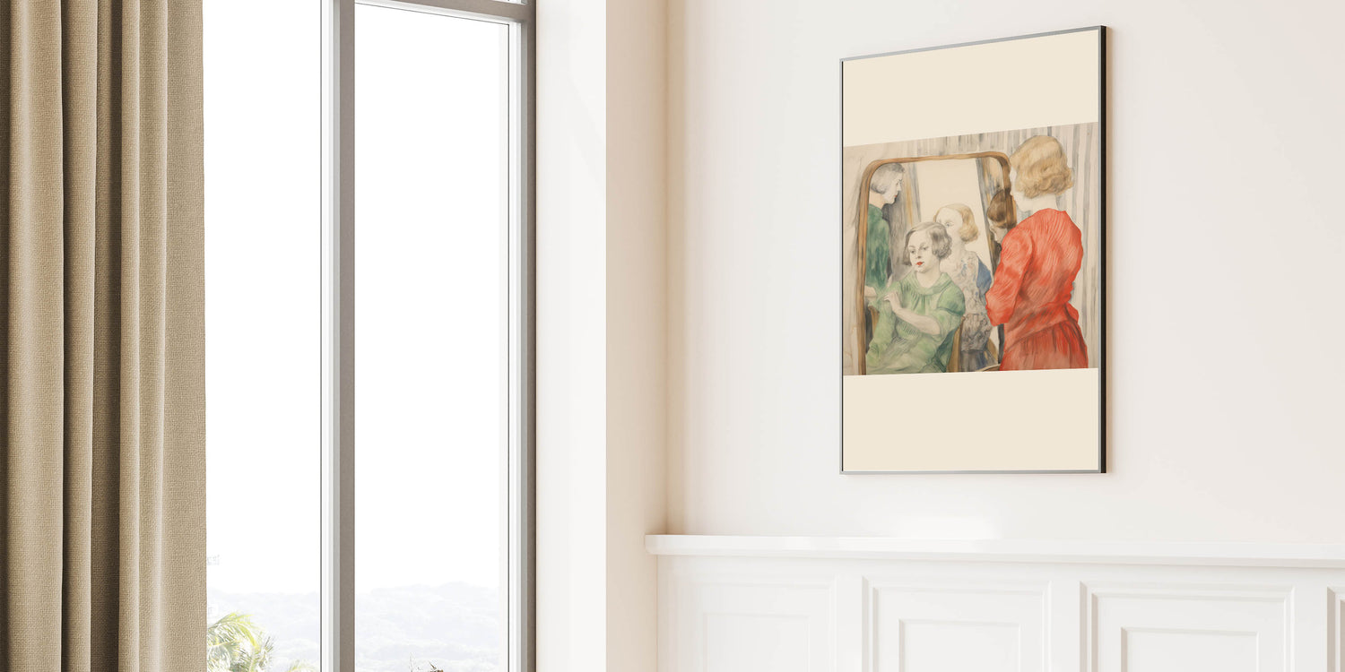 The "Electric Reflection Portrait Canvas" captures an intimate moment, blending vivid colors with soft, fluid lines to create a captivating electric wall art piece. The scene depicts multiple figures reflected in a mirror, emphasizing the complexity of identity and self-perception. The electric hues of green, red, and blue bring a modern flair to this reflective portrait, making it a unique addition to contemporary home decor.