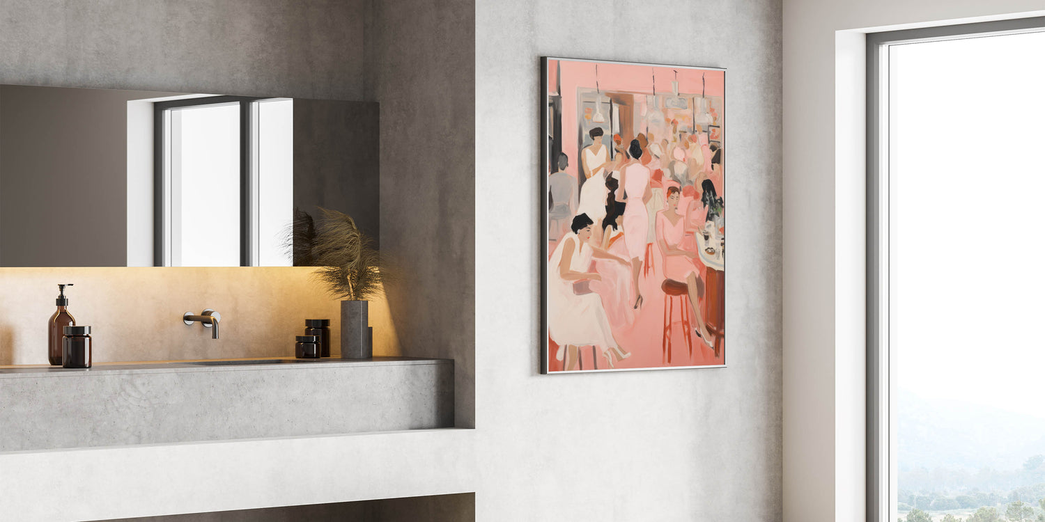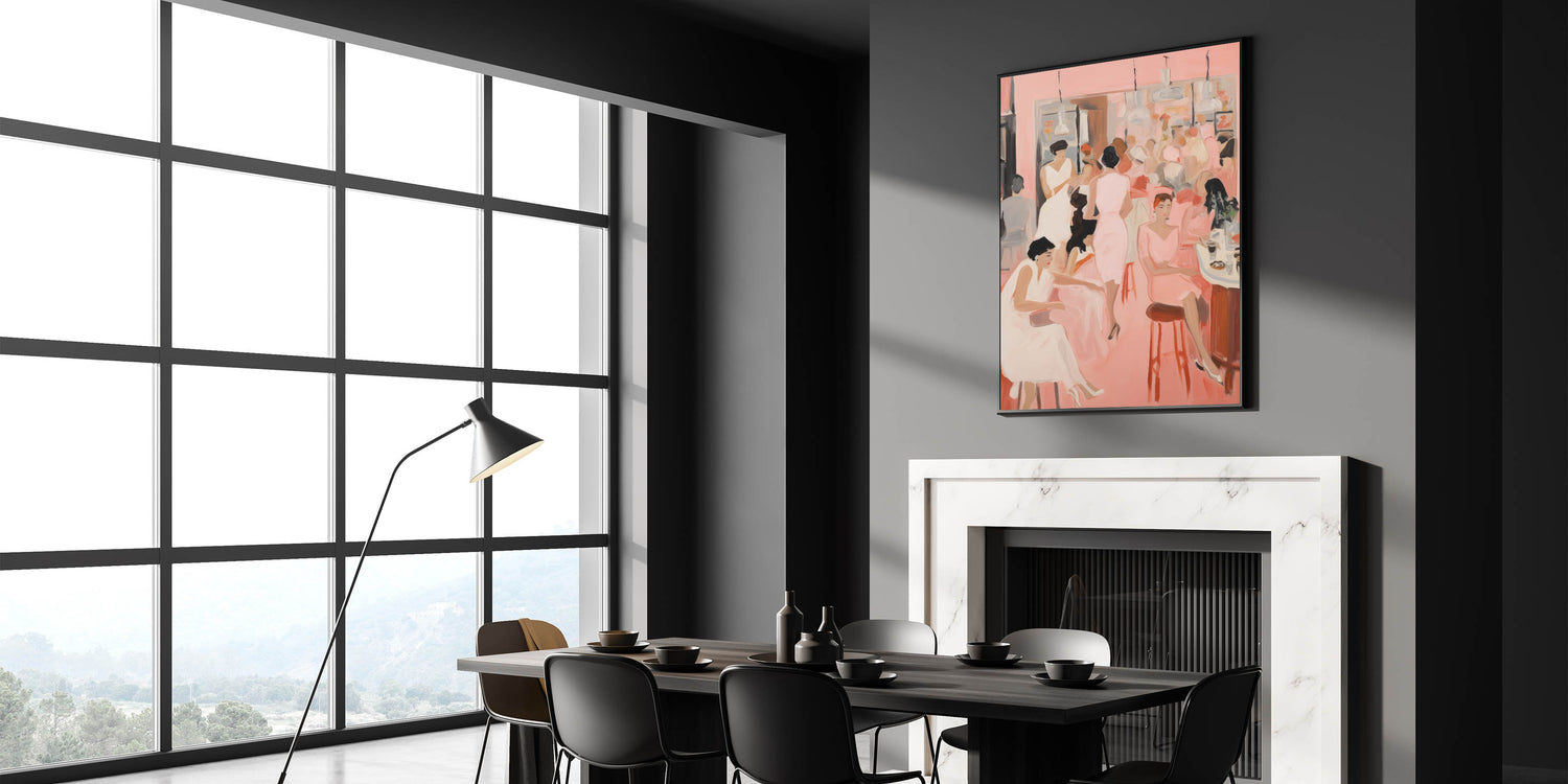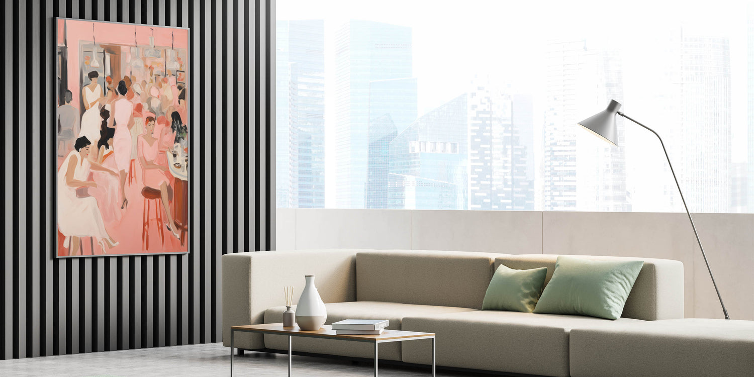 Immerse yourself in the lively atmosphere of this Electric Social Scene Wall Art, capturing an elegant café setting filled with vibrant figures in soft pink hues. The energy of this bustling space, paired with warm tones and dynamic compositions, evokes a sense of movement and modernity, making it a perfect addition for contemporary interiors seeking vibrant electric decor. This piece brings life and color into any room, creating a sophisticated and stylish focal point.