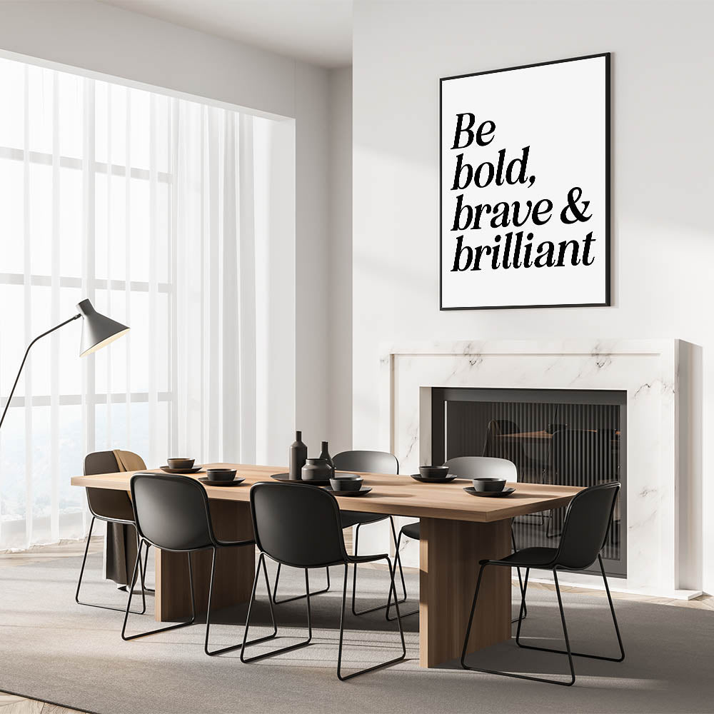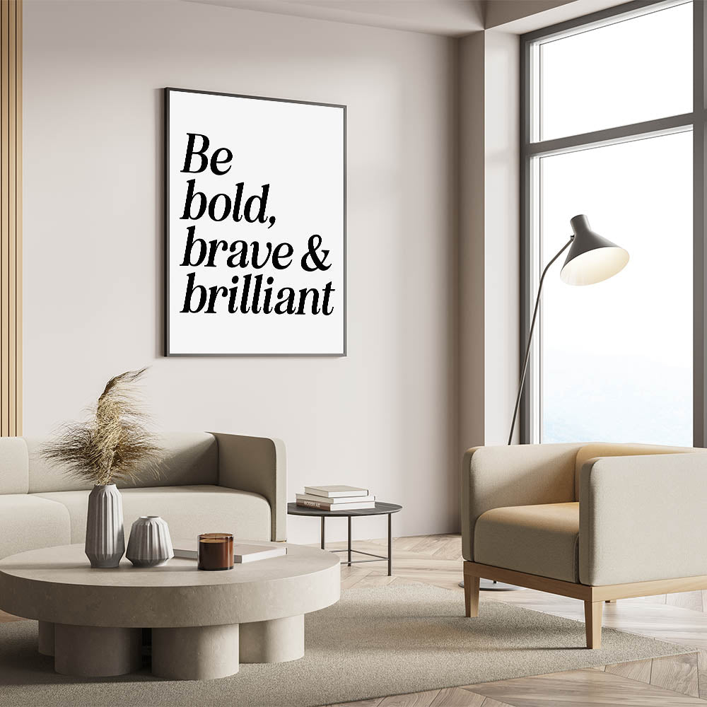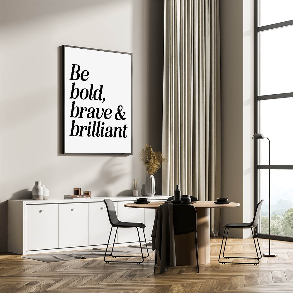 Bring inspiration and style to your space with this electric wall art piece featuring the phrase "Be bold, brave & brilliant." The sleek black typography on a crisp white background creates a powerful visual impact, making it an excellent choice for those looking to add modern electric decor to their home or office. The bold lettering combined with the motivational message makes this piece a standout in any interior.