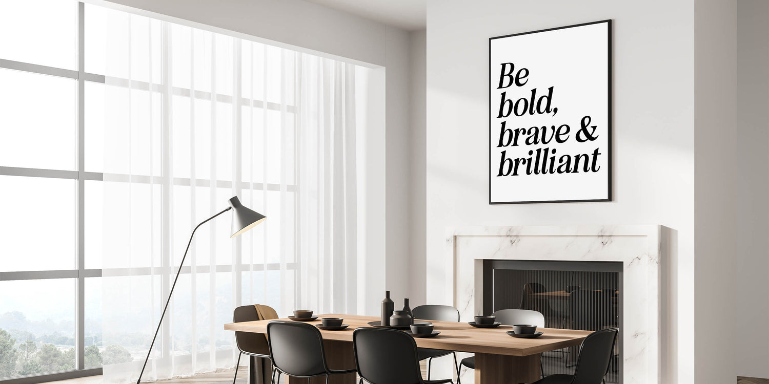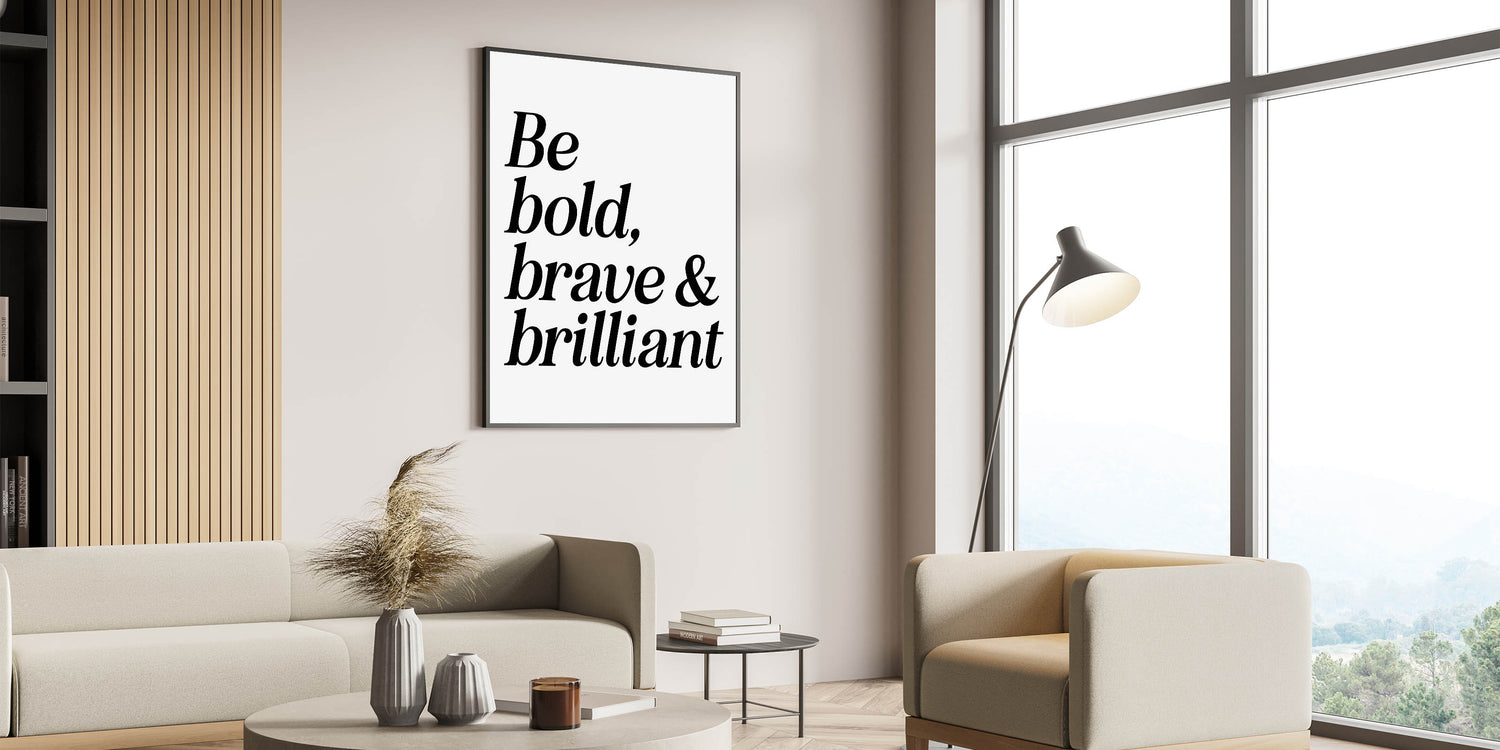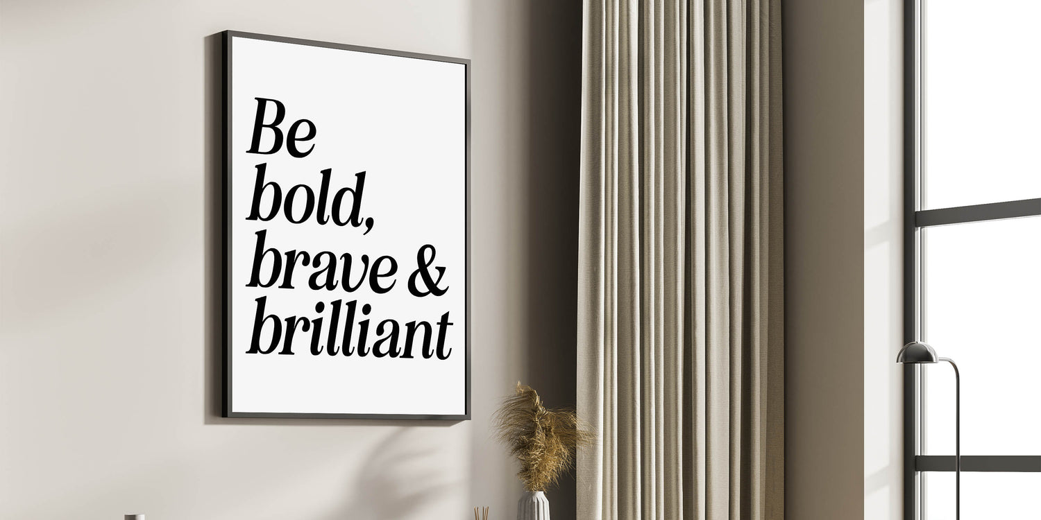 Bring inspiration and style to your space with this electric wall art piece featuring the phrase "Be bold, brave & brilliant." The sleek black typography on a crisp white background creates a powerful visual impact, making it an excellent choice for those looking to add modern electric decor to their home or office. The bold lettering combined with the motivational message makes this piece a standout in any interior.