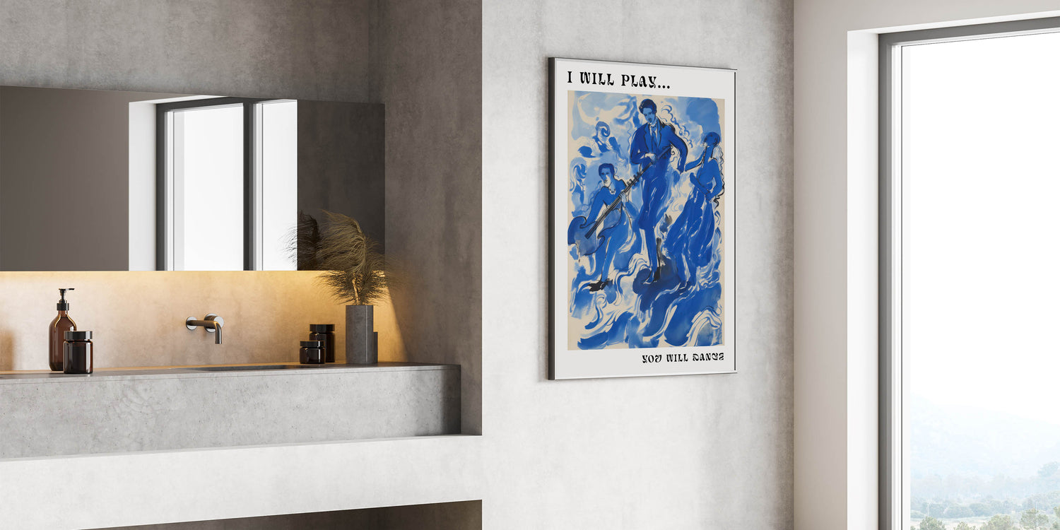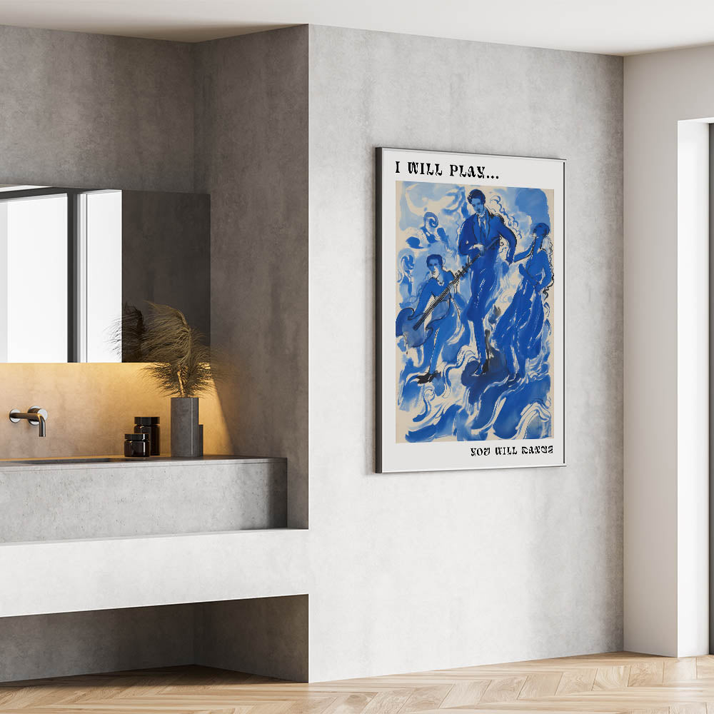 Celebrate the rhythm and movement of music with this electric wall art, featuring a trio of jazz musicians rendered in bold shades of blue. The fluid brushstrokes and vibrant color give this piece a sense of energy and spontaneity, making it a perfect addition to any music lover’s space. The words “I Will Play… You Will Dance” add a playful, interactive element, inviting viewers to experience the spirit of live music right on their walls. This electric art canvas captures both the emotion and movement of jazz, bringing a bold, artistic flair to modern spaces.