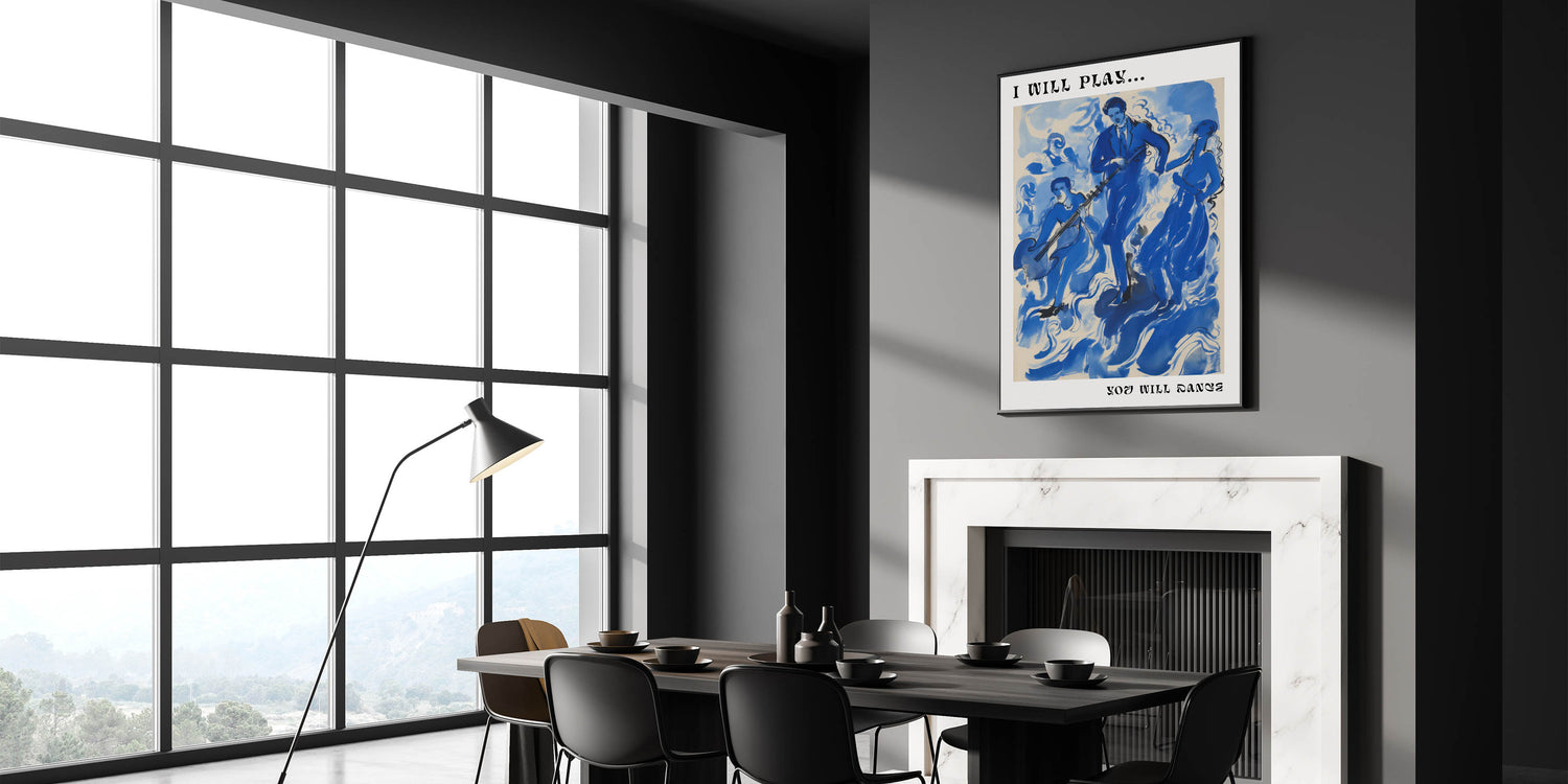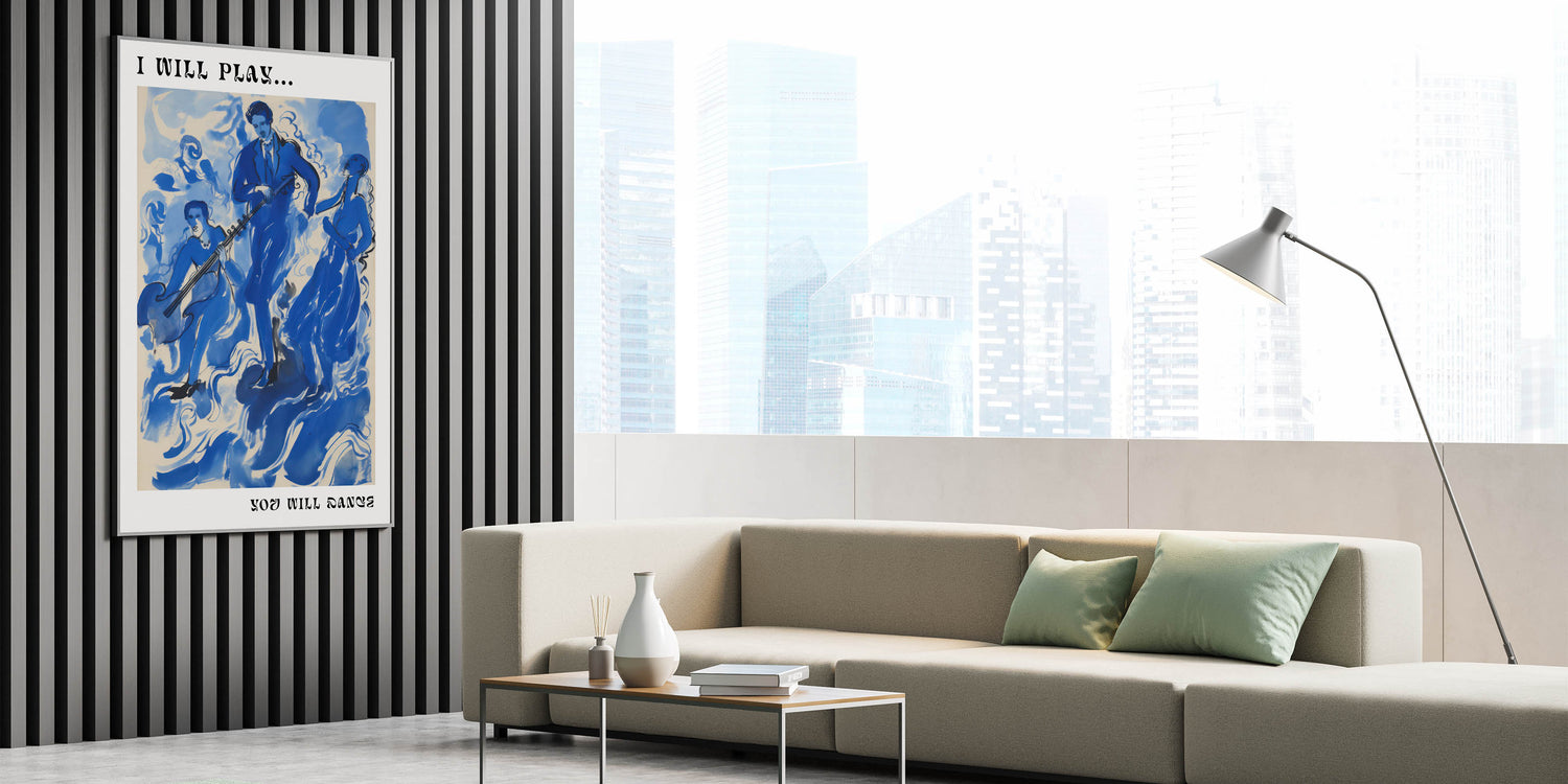 Electric Wall Art: Bold Blue Jazz Musicians in Modern Electric Decor